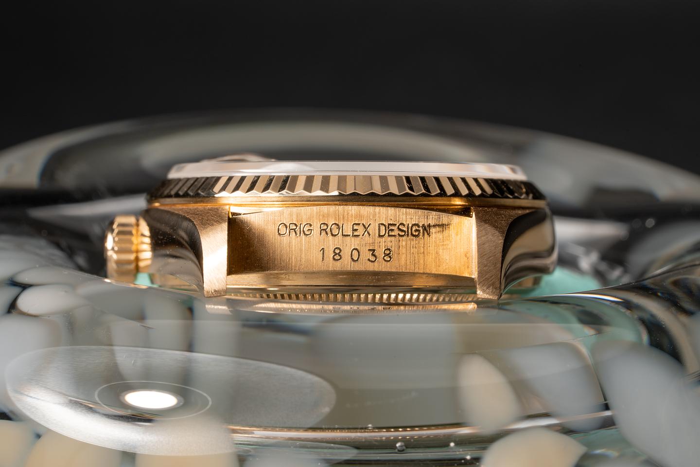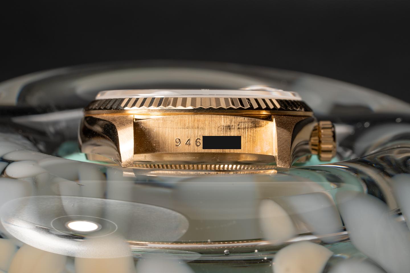 Case: The thick and even 18k yellow gold case has just returned from polishing. The sharp 18 yellow gold fluted bezel has also just been polished.