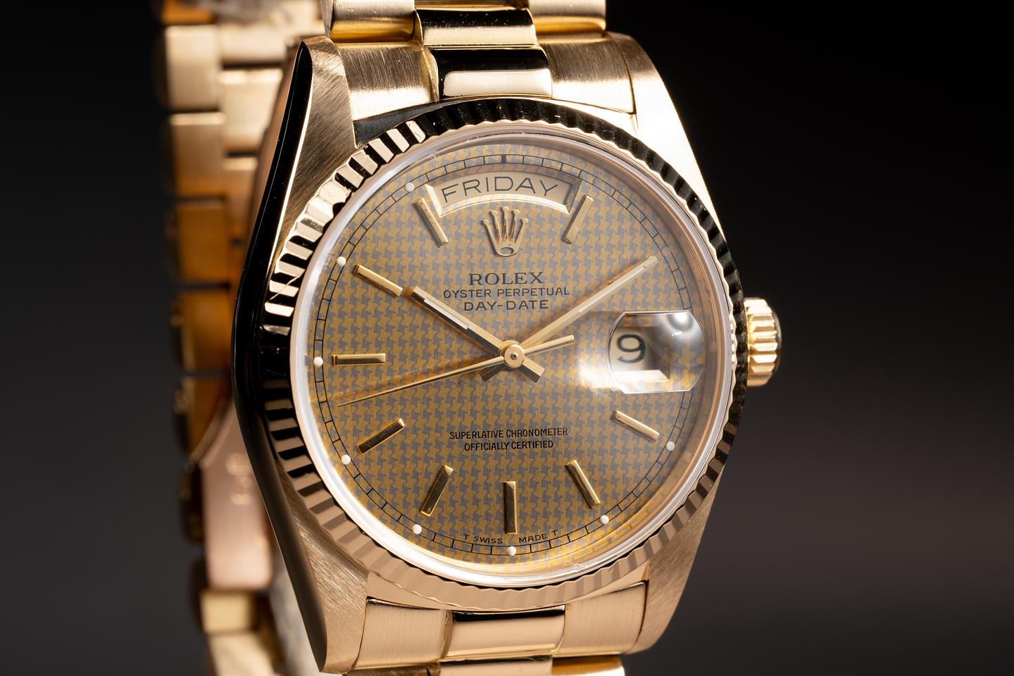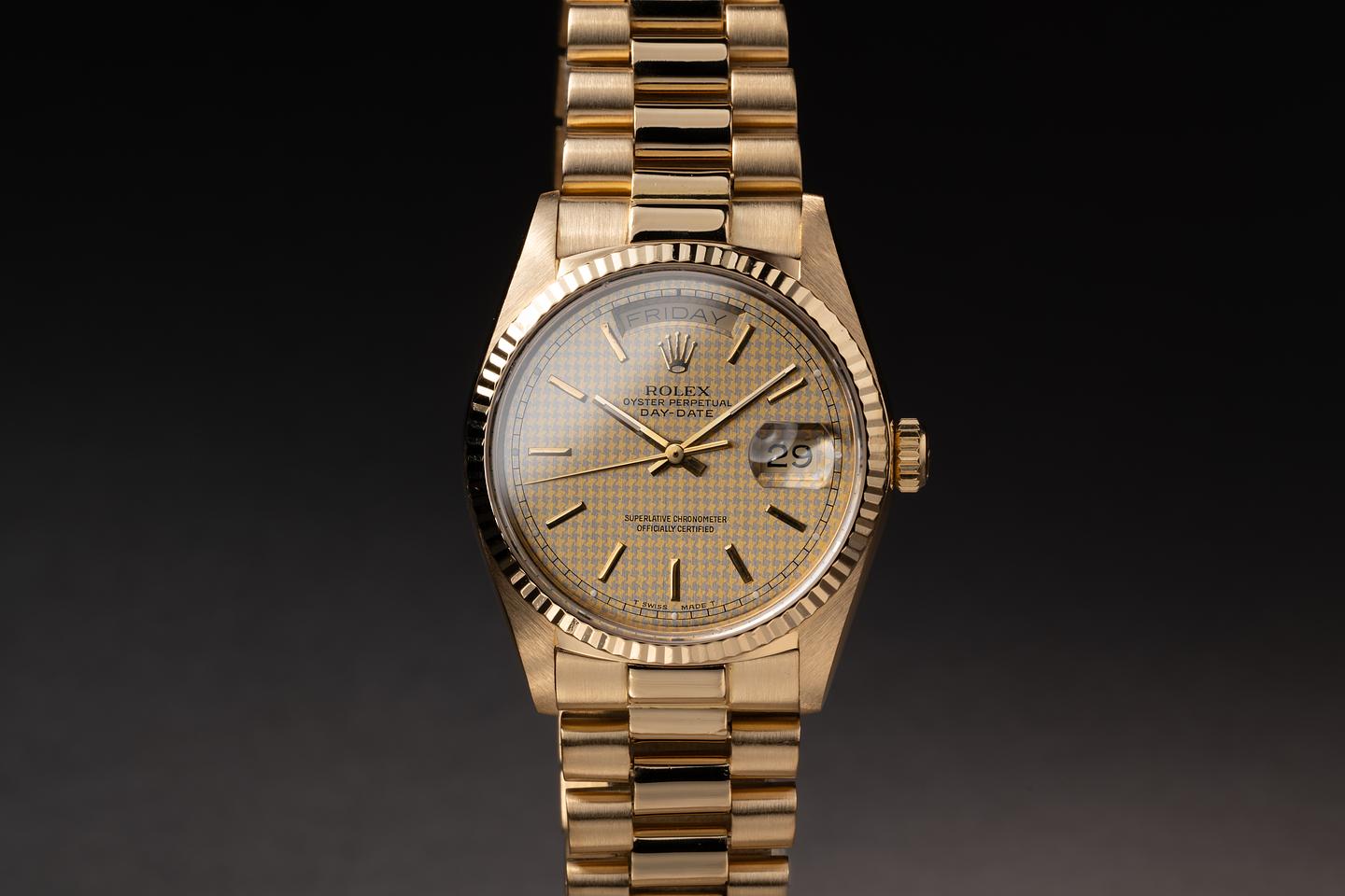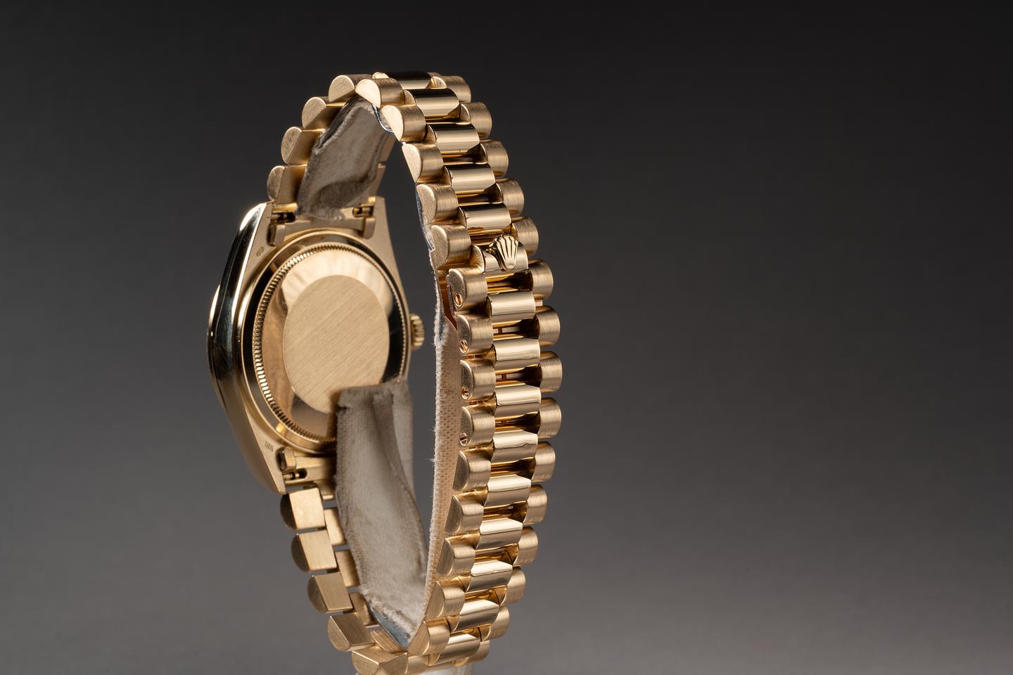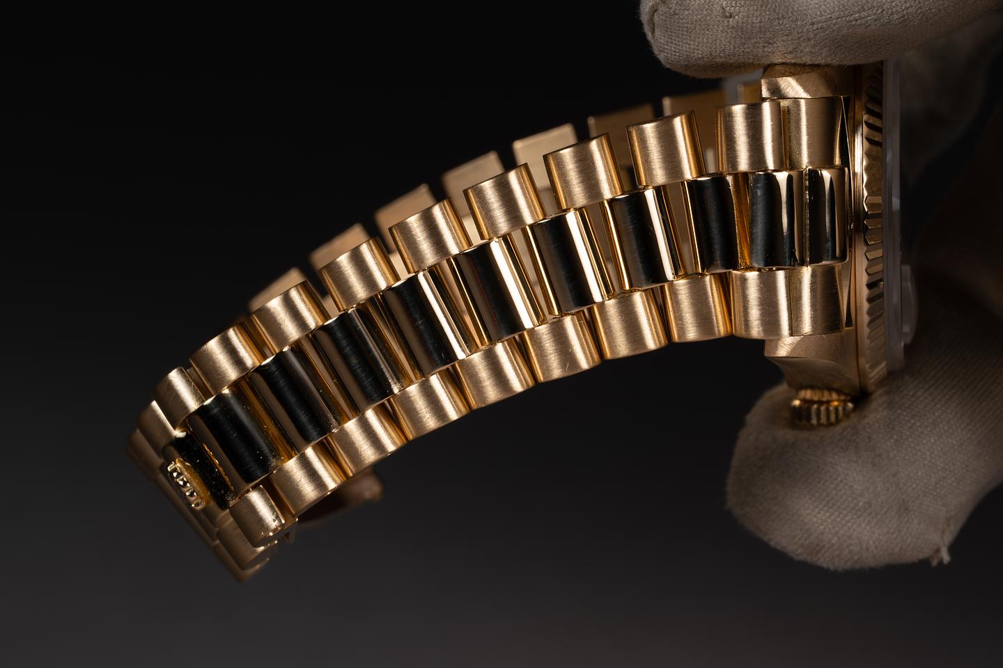 Bracelet: The 23 link 18k yellow gold president bracelet is good showing average stretch for its age.
