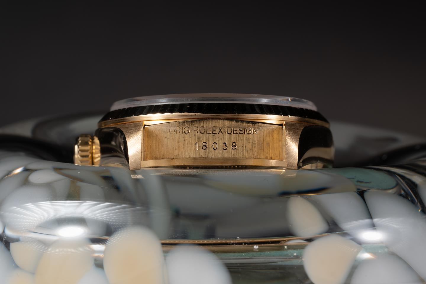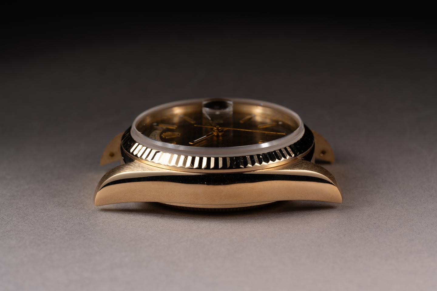 Case: The thick, sharp 18k yellow gold has just returned from polishing. The sharp 18k yellow gold fluted bezel is also freshly polished,