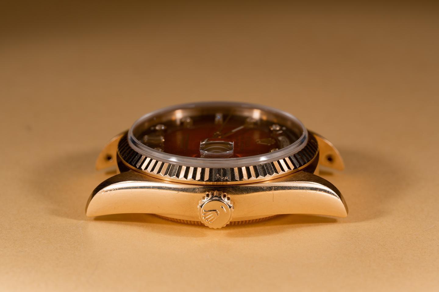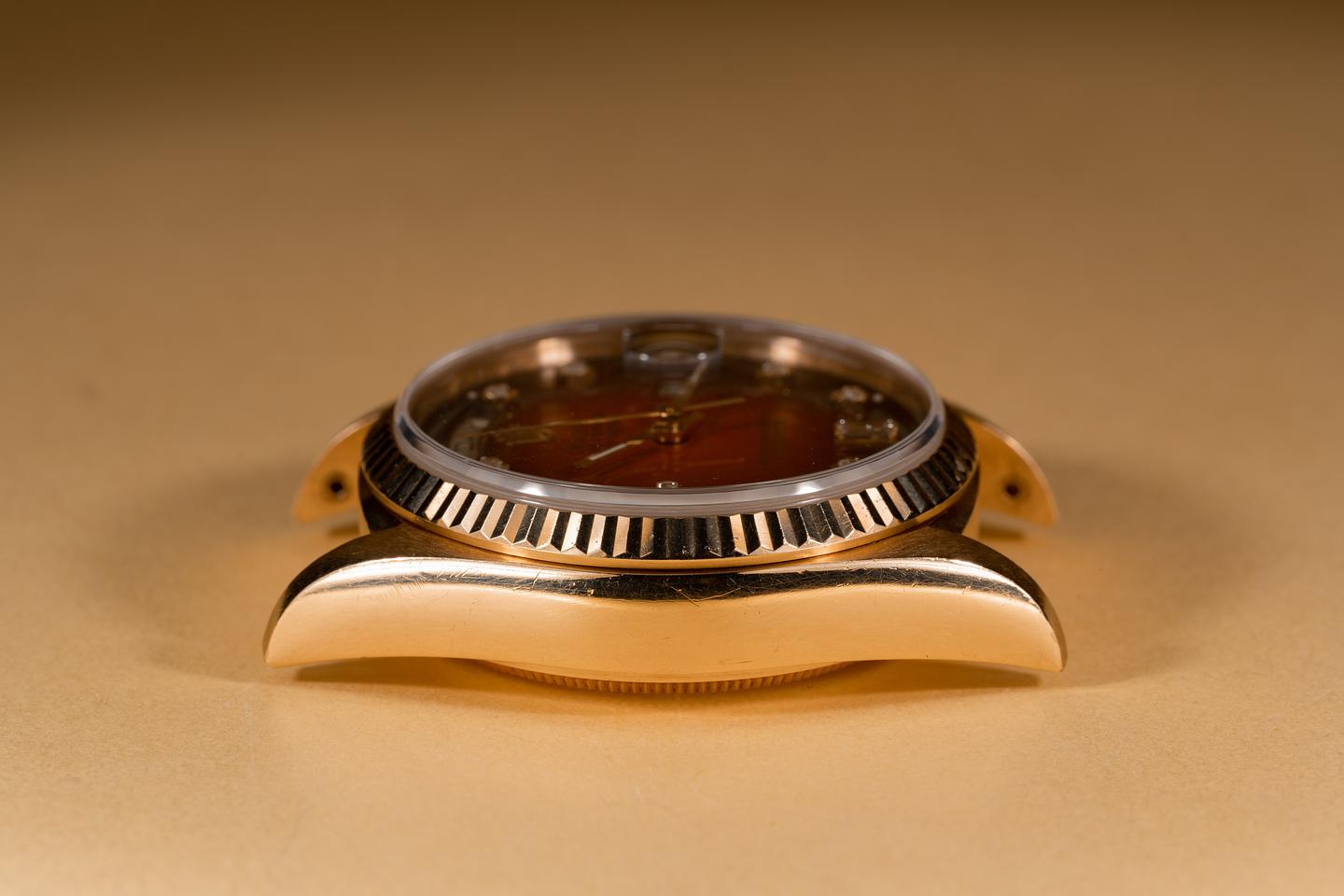 Case: The previously polished 18k yellow gold case is excellent showing only light wear from use. The sharp 18k yellow gold fluted bezel is also in excellent condition showing only light wear from use.