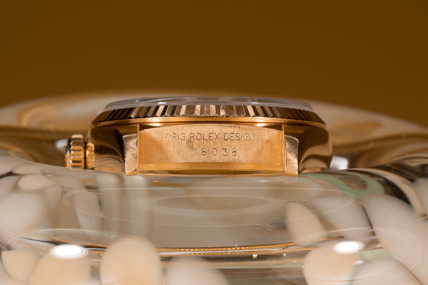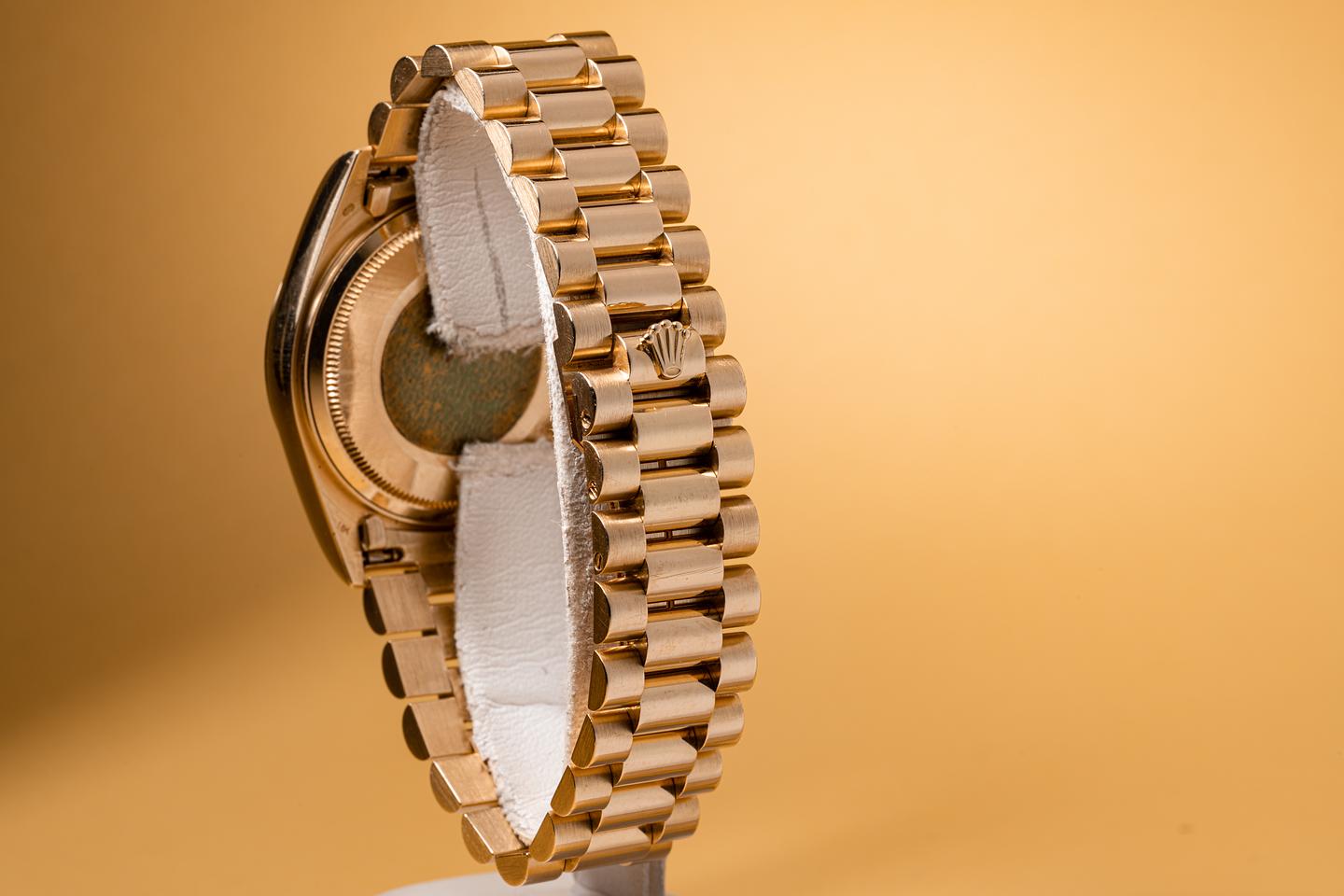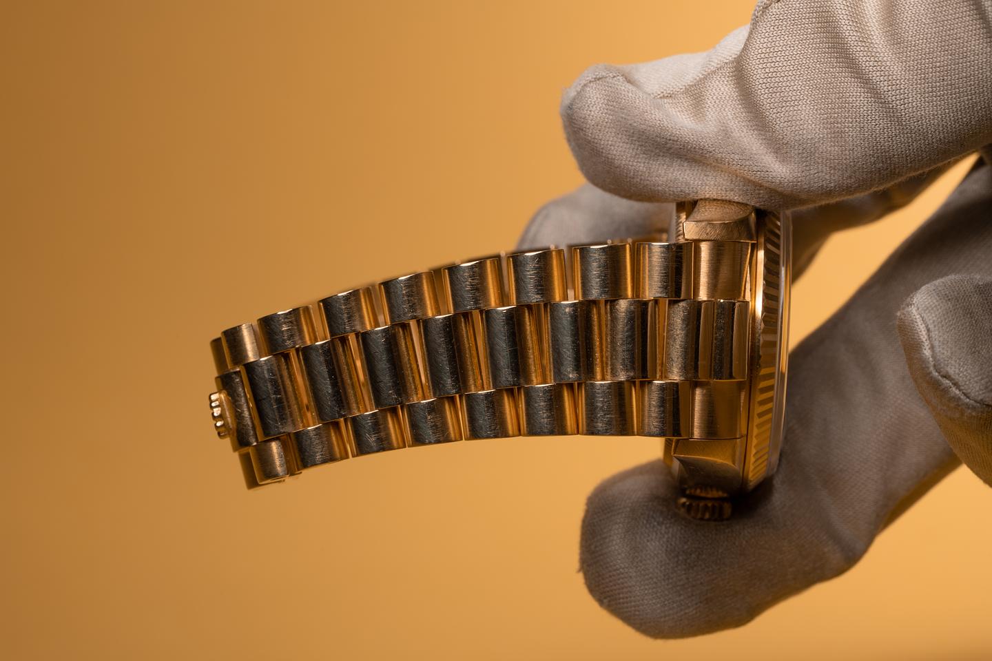 Bracelet: The 22 link 18k yellow gold president bracelet is excellent showing only light stretch for its age.