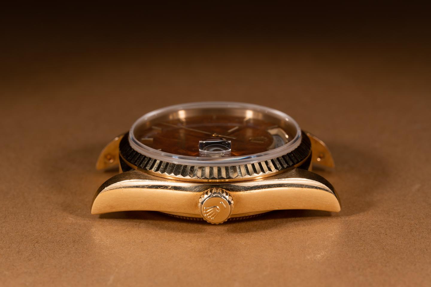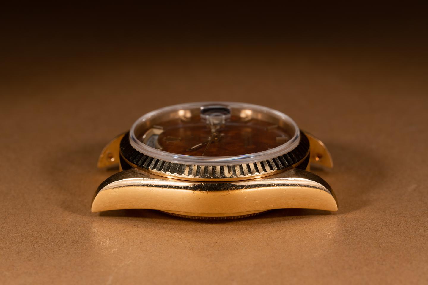 Case: The 18k yellow gold case is excellent showing a warm rosy patina and some light wear from use. The sharp 18k yellow gold fluted bezel is also in excellent condition showing only light wear from use.