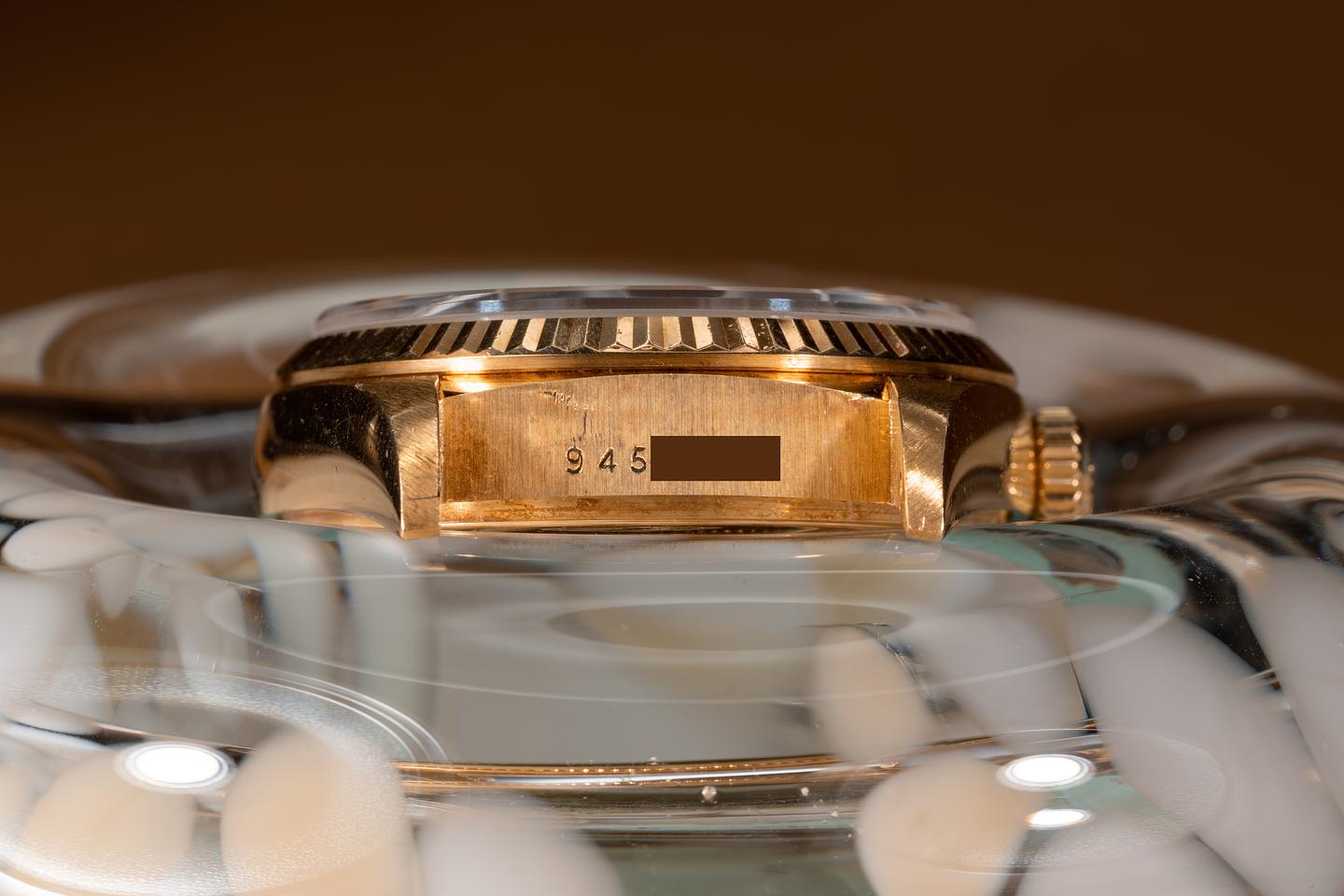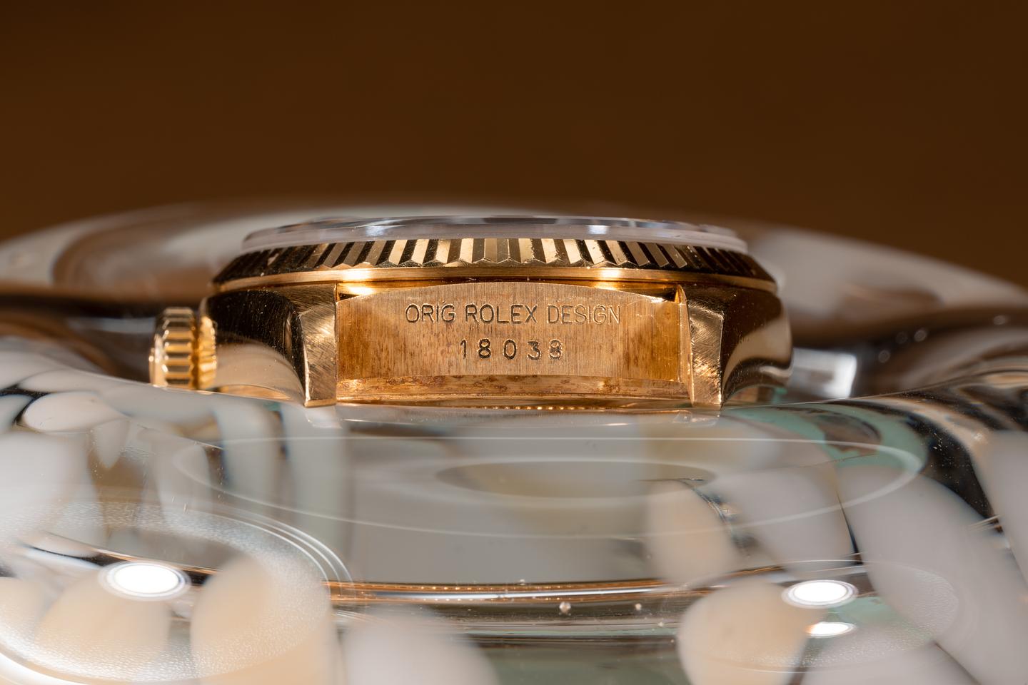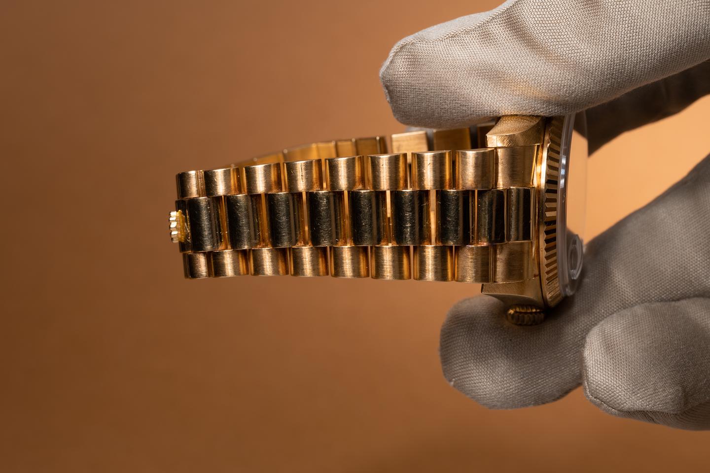 Bracelet: The 22 link 18k yellow gold oyster bracelet is excellent showing only light stretch for its age. The clasp is stamped with a matching 1987 date code.