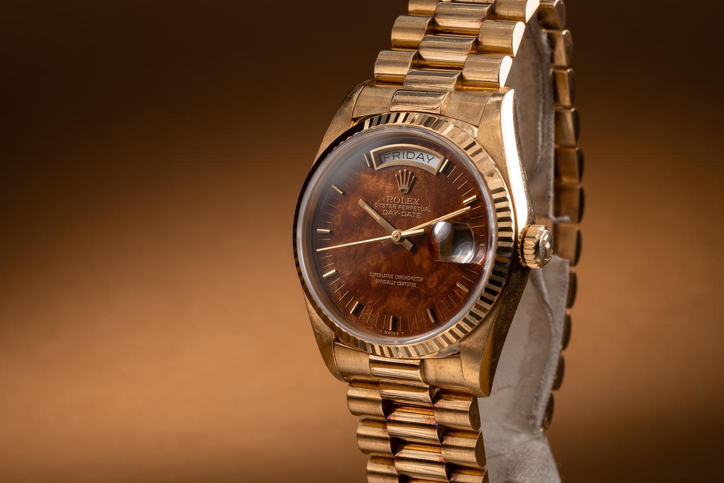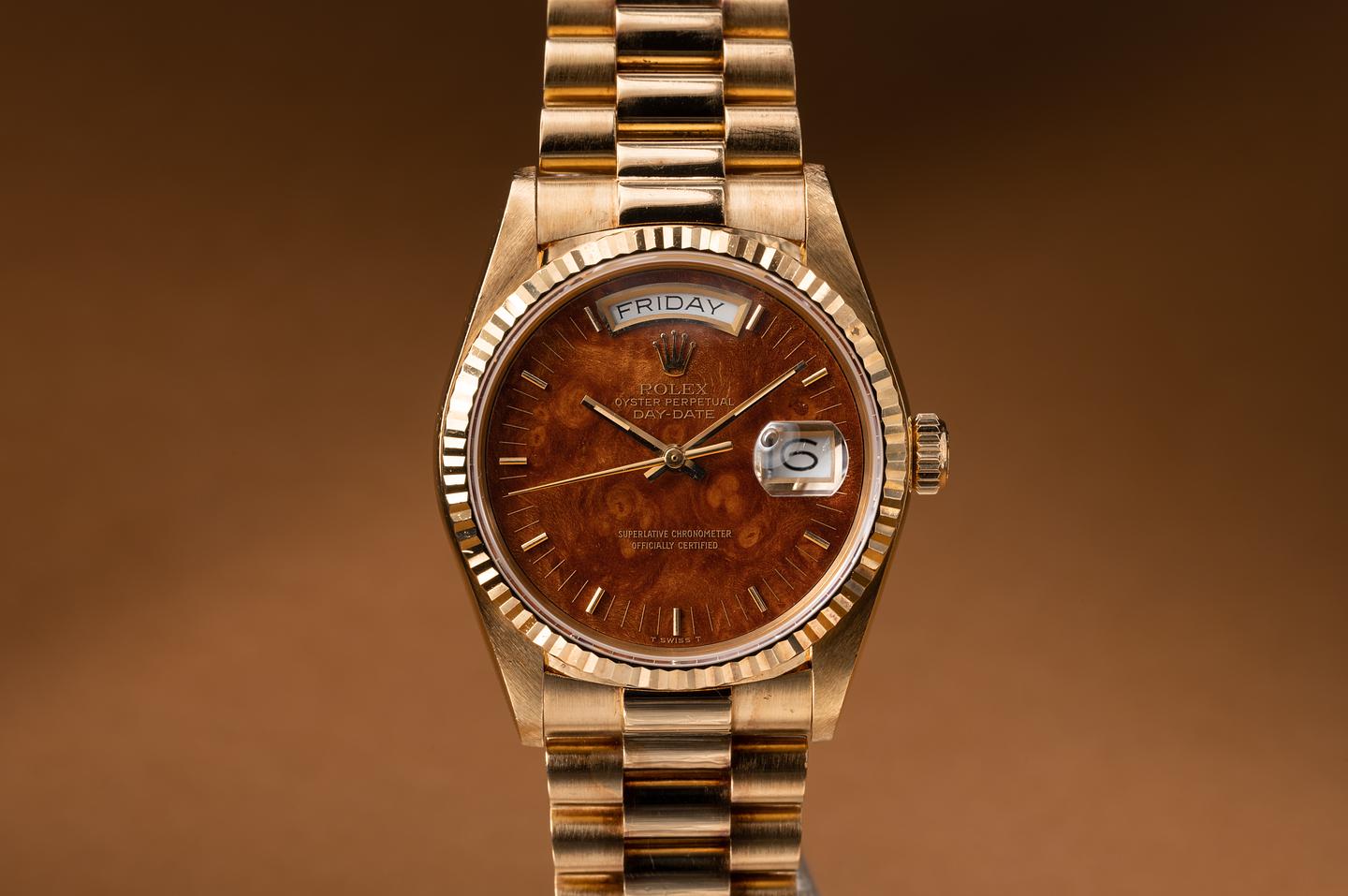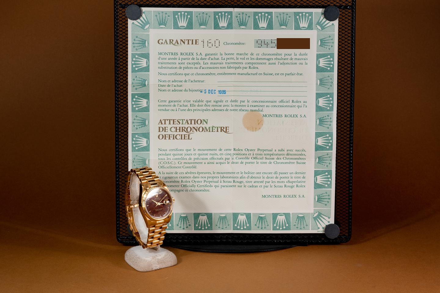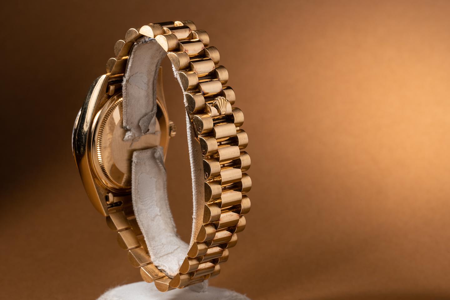 Bracelet: The 22 link 18k yellow gold oyster bracelet is excellent showing only light stretch for its age. The clasp is stamped with a matching 1987 date code.