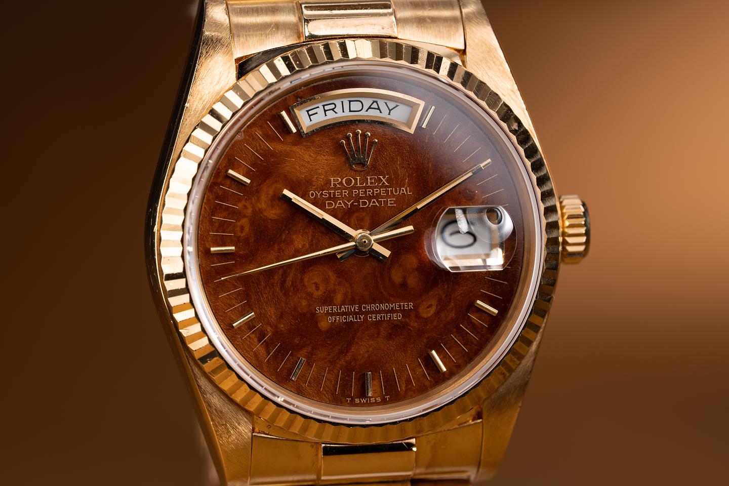 Dial: The rich warm walnut wood dial is excellent showing only very light wear overall. There is one small and subtle chip at the very edge of the dial between the 10 and 11 o'clock markers. The hands have aged to a warm creamy hue and appear to be original to the watch.