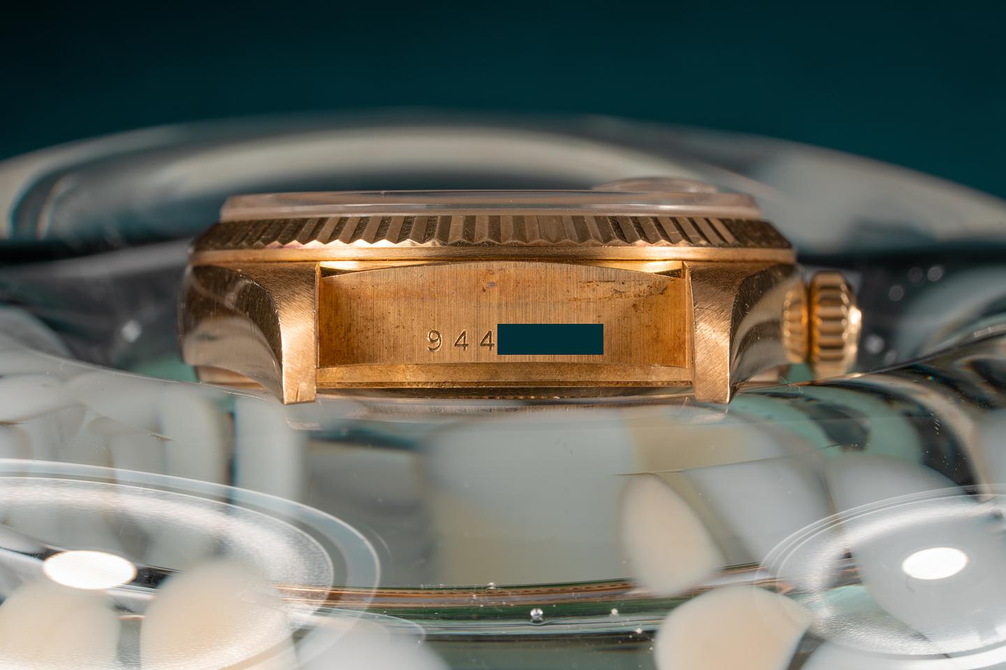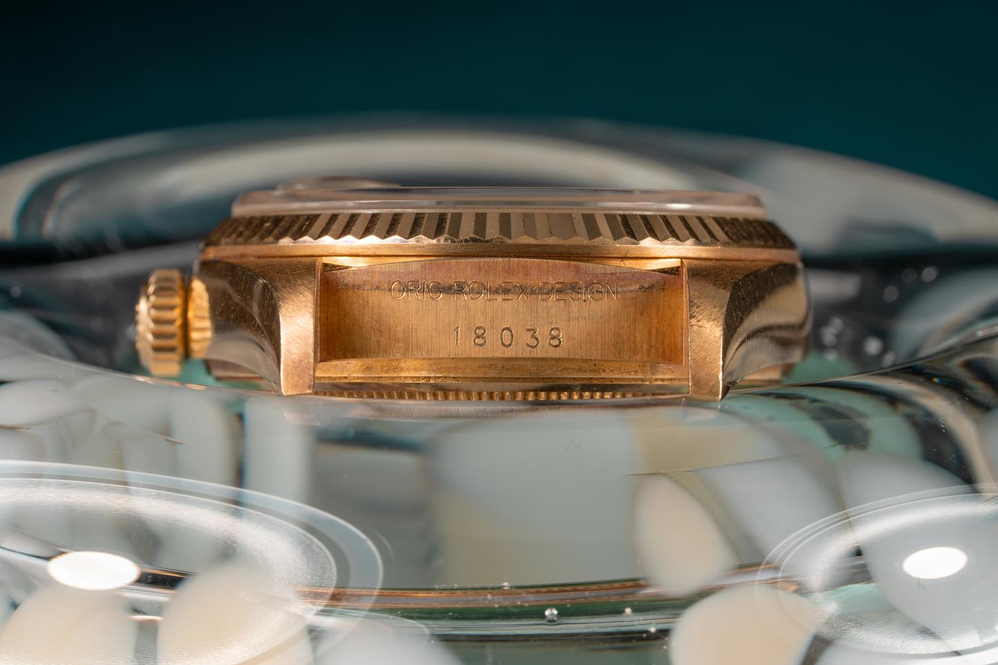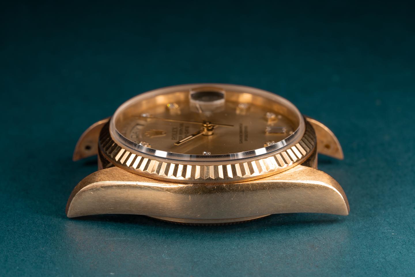 Case: The 18k yellow gold case is thick and even and appears to be unpolished and shows light wear for its age. The 18k yellow gold fluted bezel is sharp and shows very light wear.