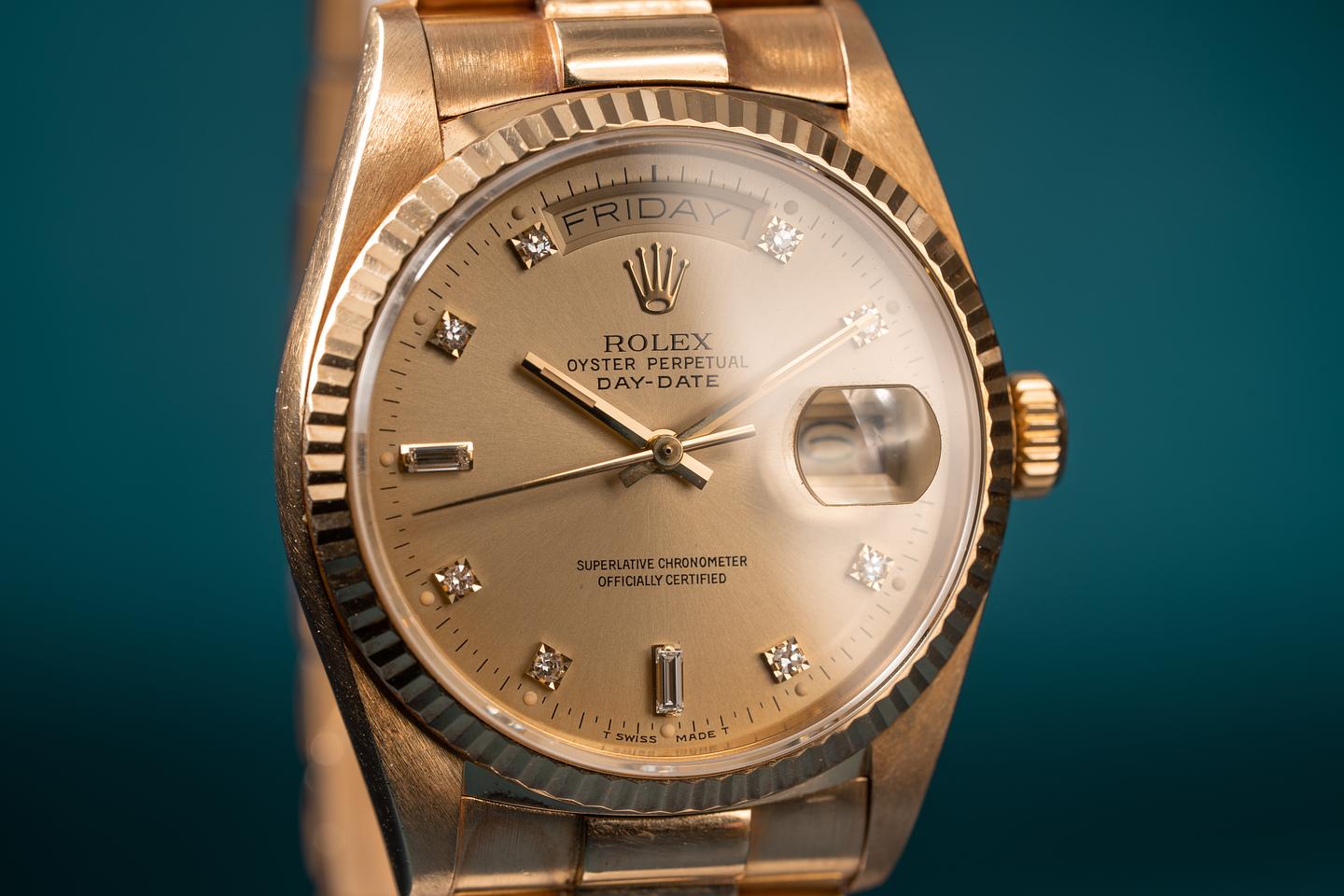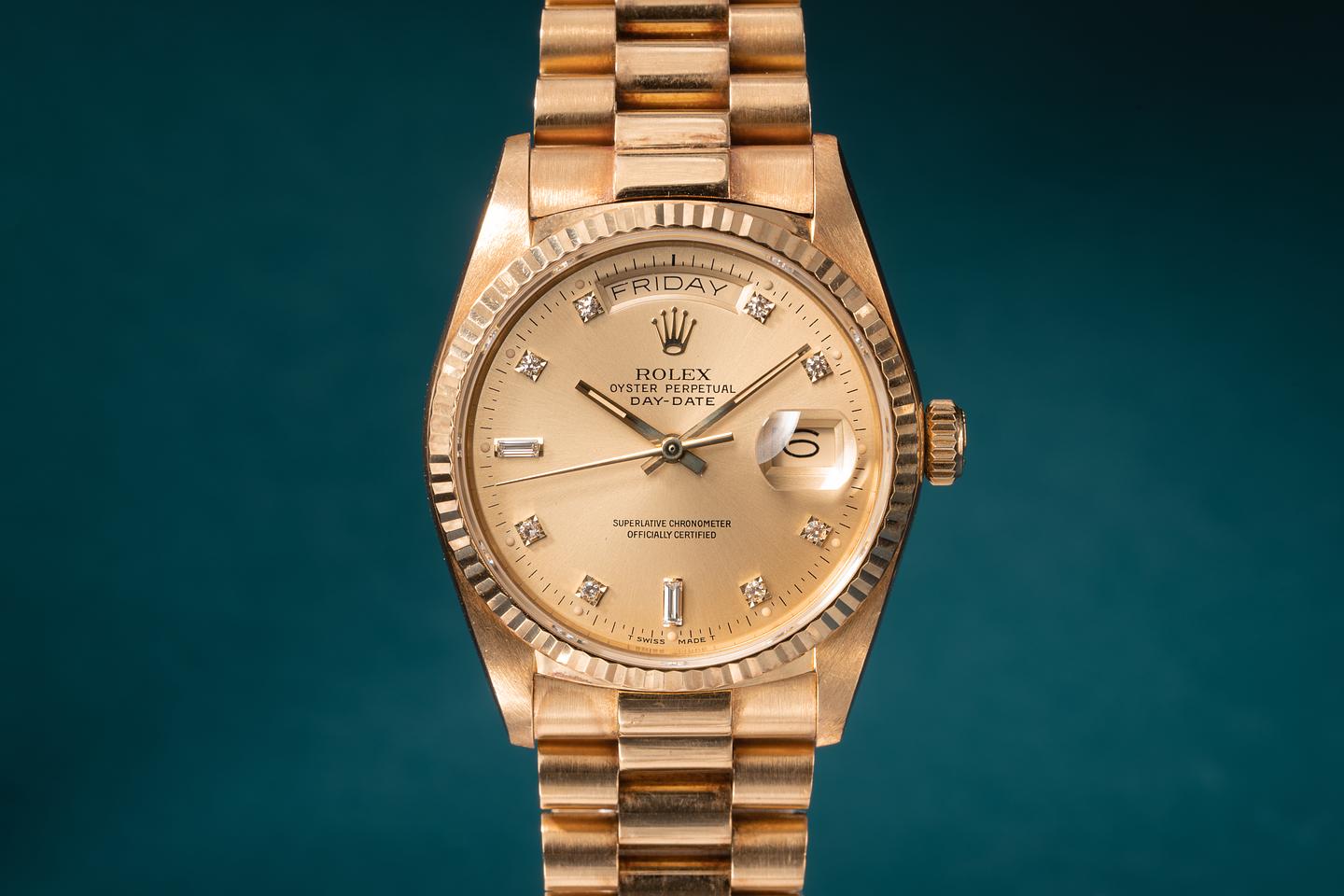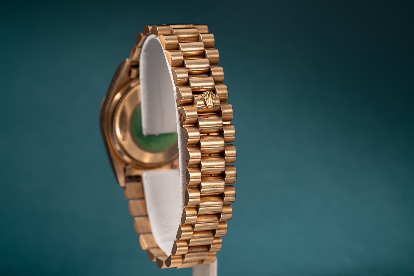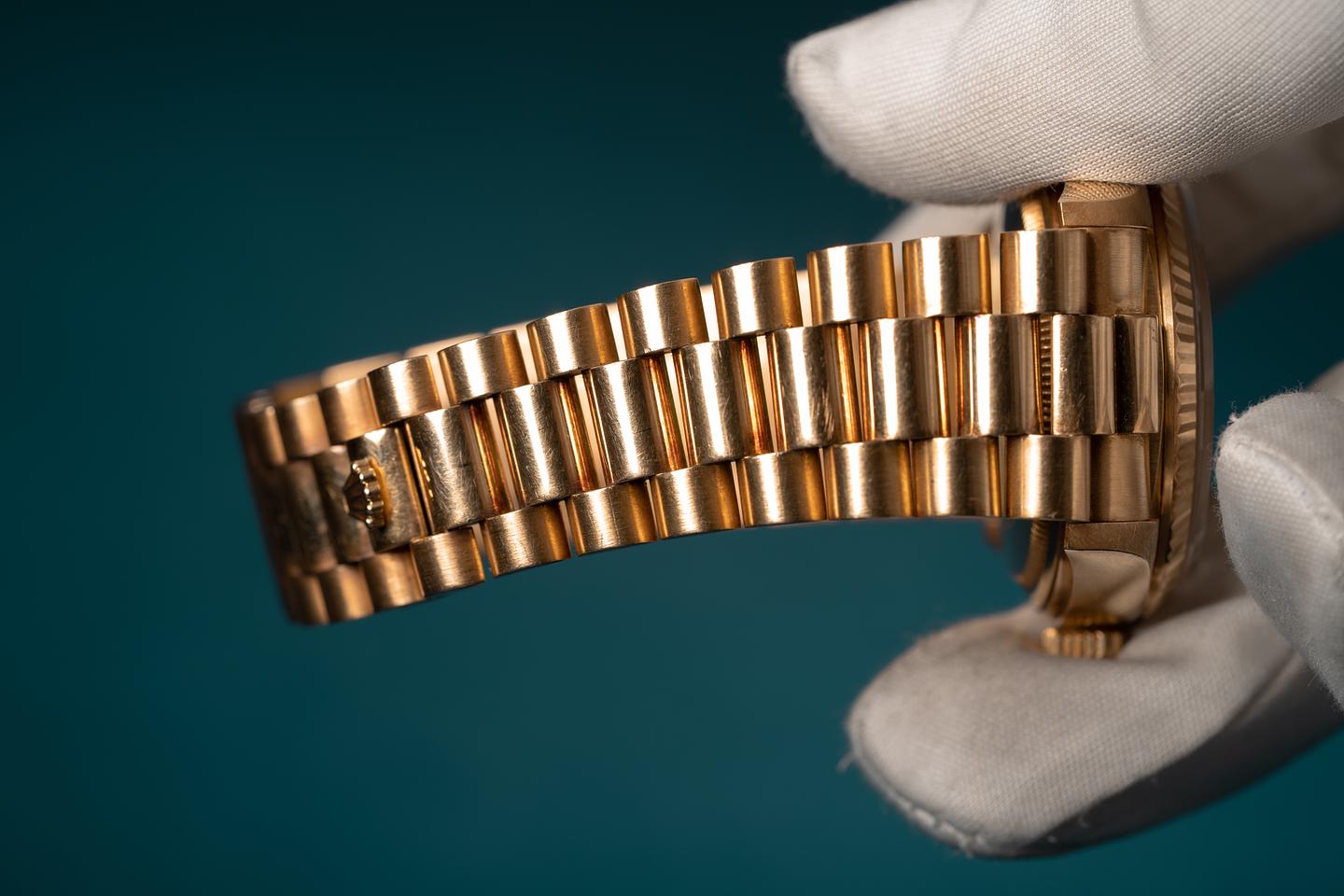 Bracelet: The 22 link 18k yellow gold president bracelet is excellent and shows only light stretch for its age.