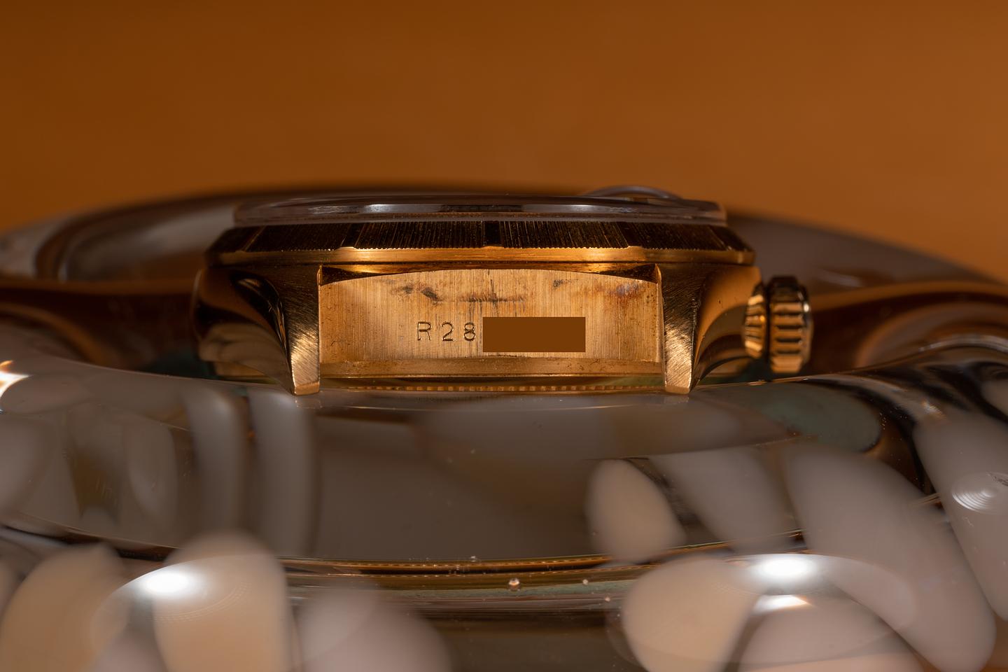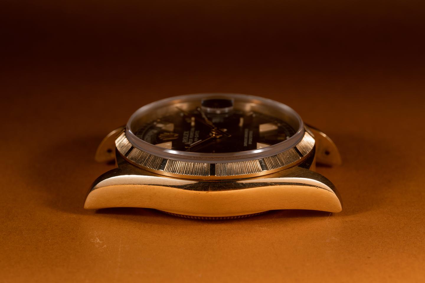 Case: The 18k yellow gold case is excellent showing only light wear from use. The bark bezel is also in excellent condition showing only light wear from use.