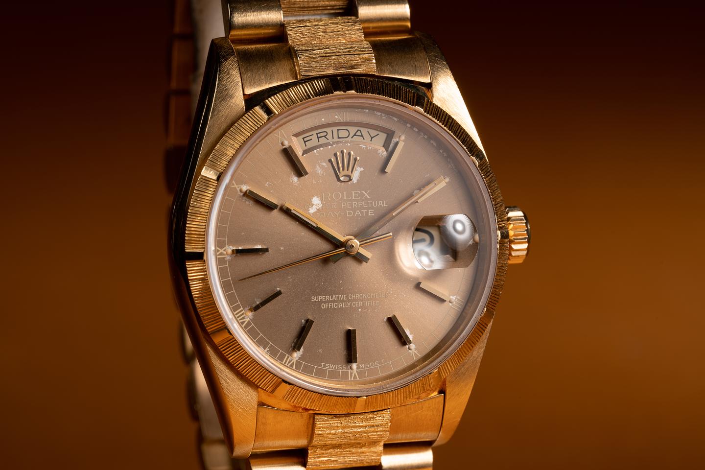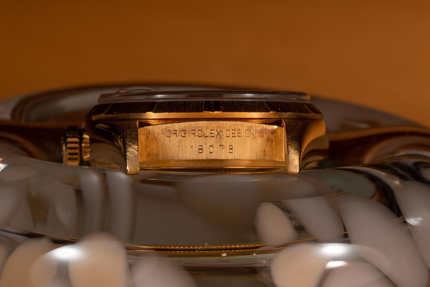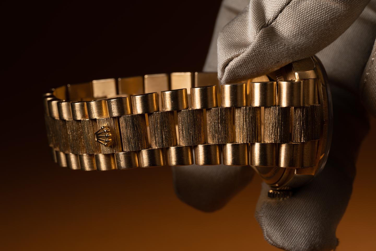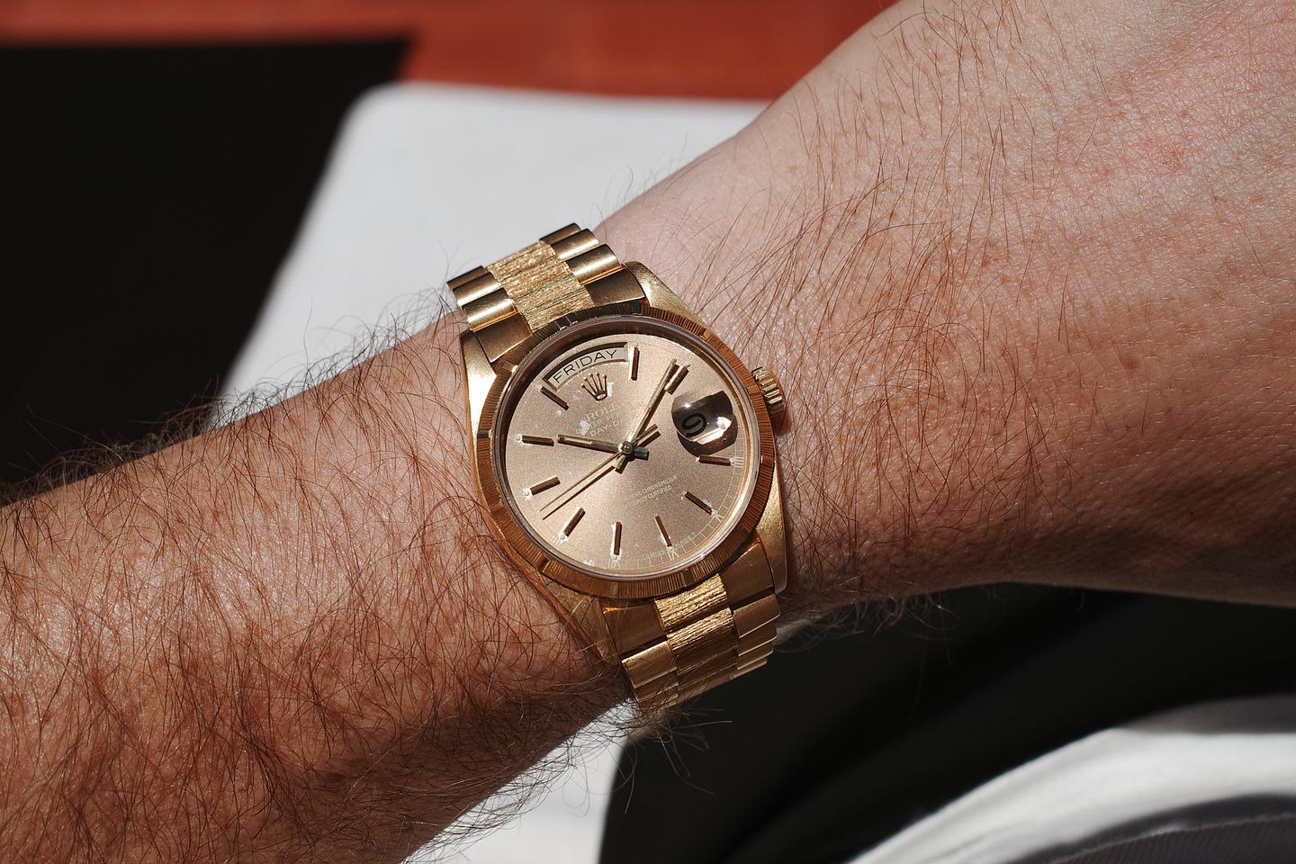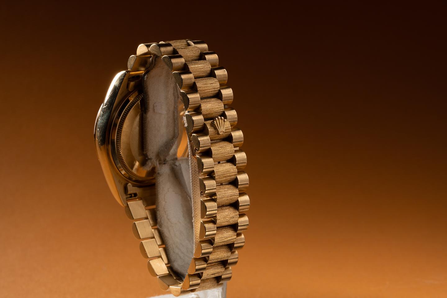 Bracelet: The 21 link 18K yellow gold President bark bracelet is excellent showing only light stretch for its age. The clasp is stamped with a matching 1987 date code.