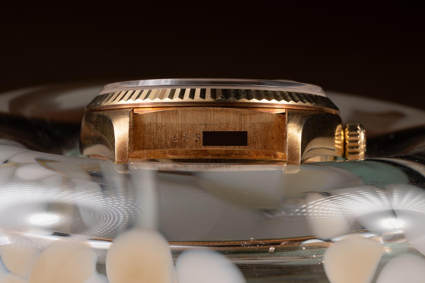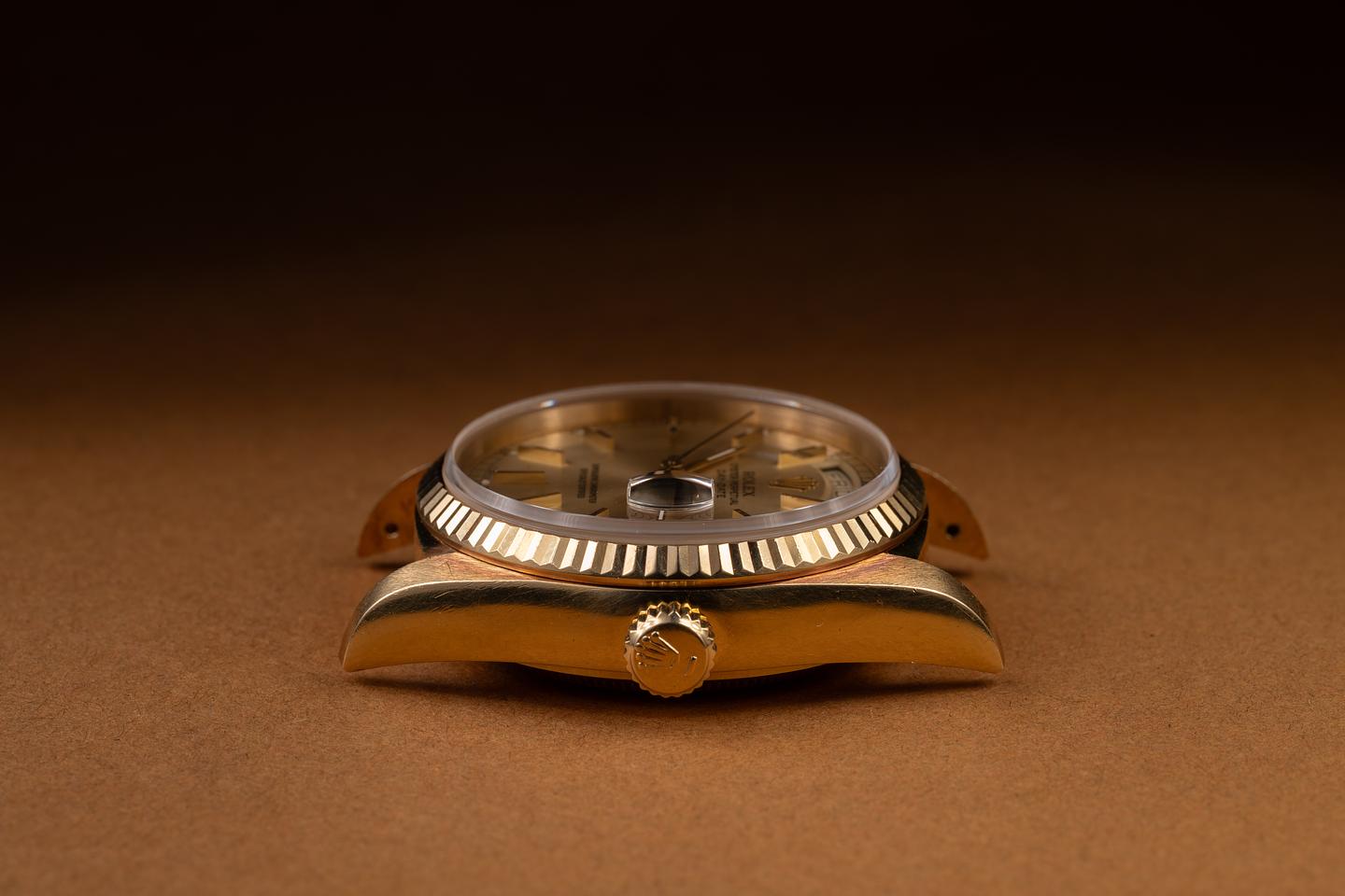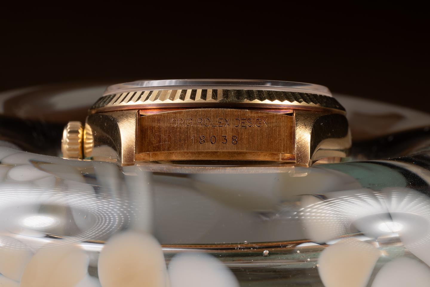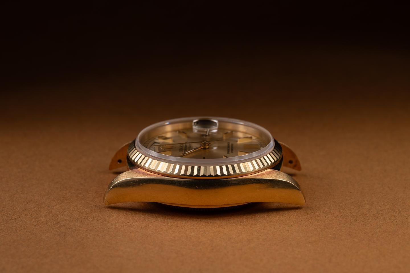 Case: The unpolished 36mm 18K yellow gold case is excellent, showing a warm, rosy patina and only very light wear from use. The sharp 18K yellow gold fluted bezel is also in excellent condition, showing overall only very light wear from use. There is one very small ding near the 6 o'clock position.