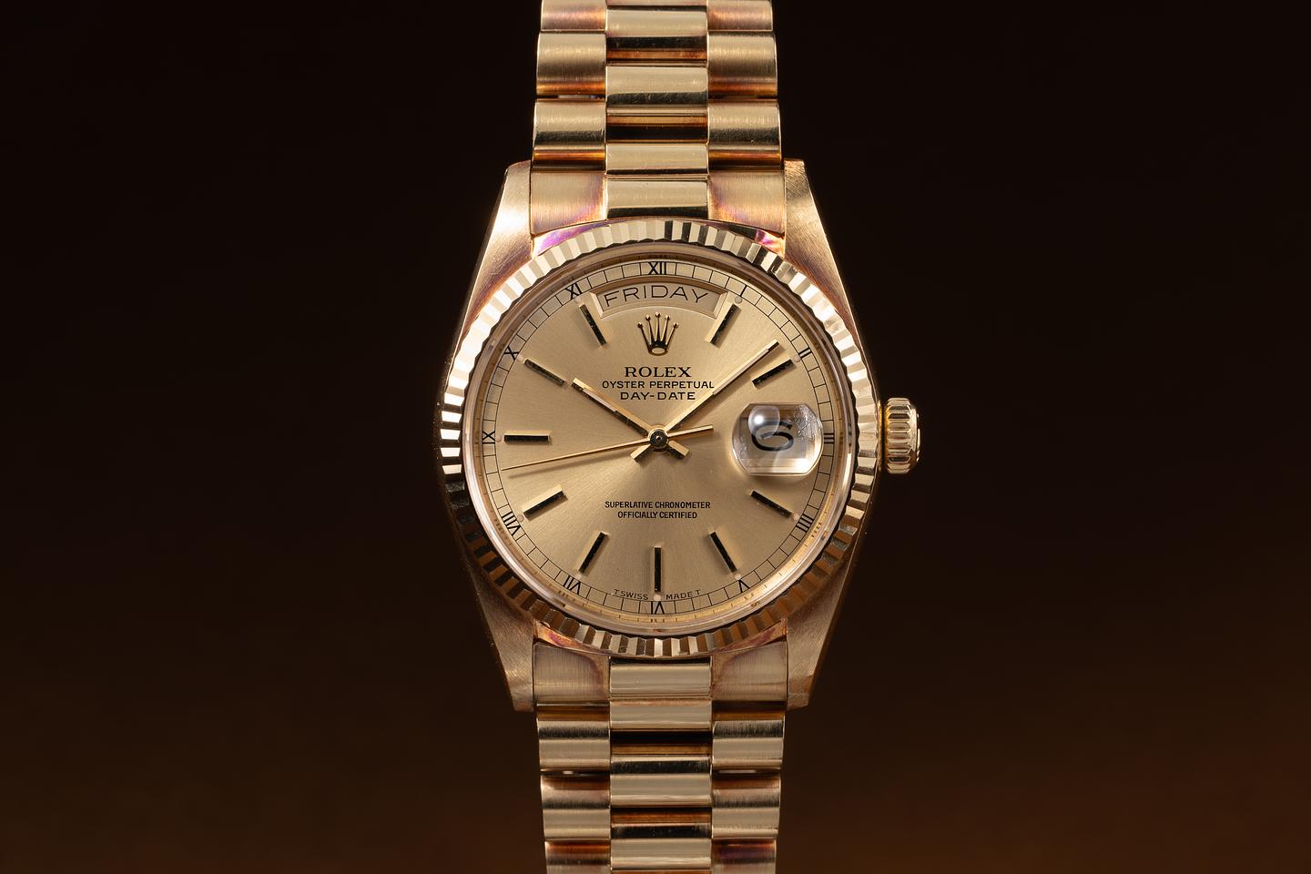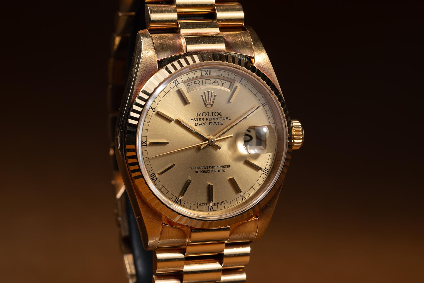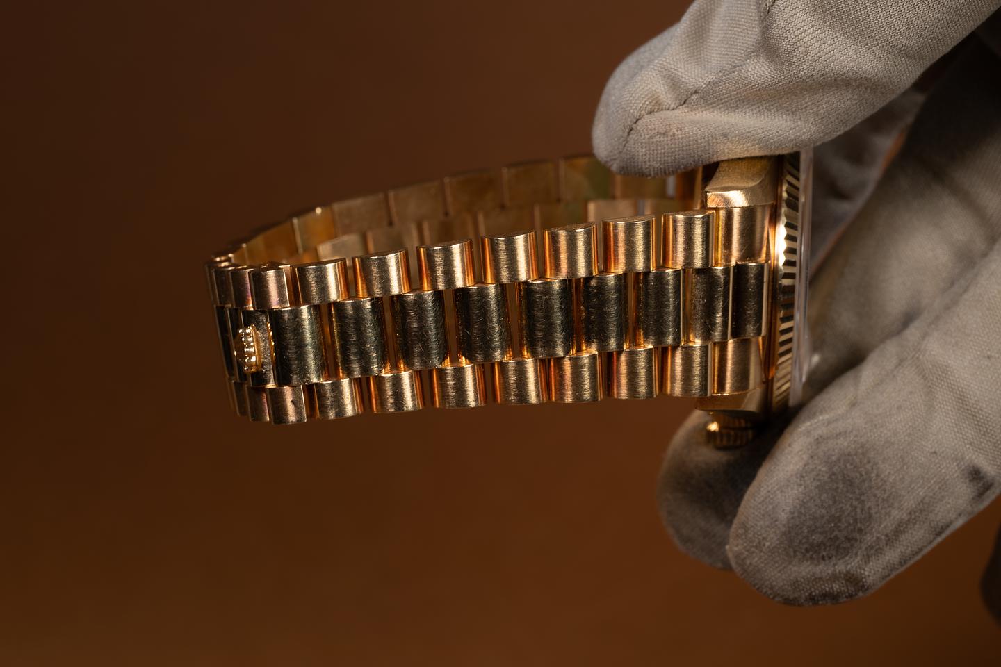Bracelet: The 22-link 18K yellow gold President bracelet is excellent, showing only very light stretch for its age.