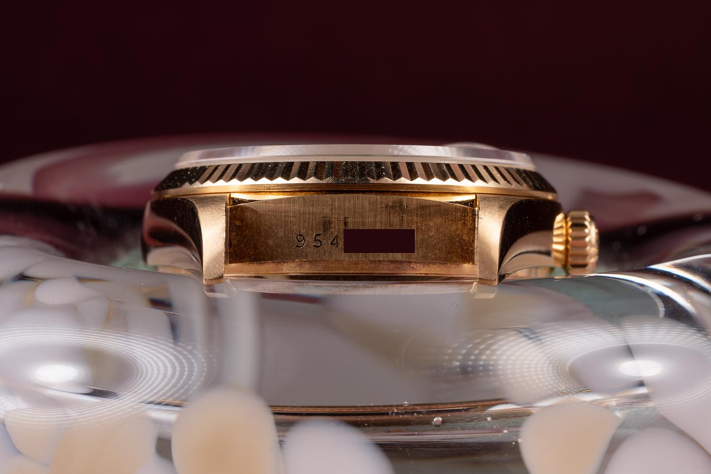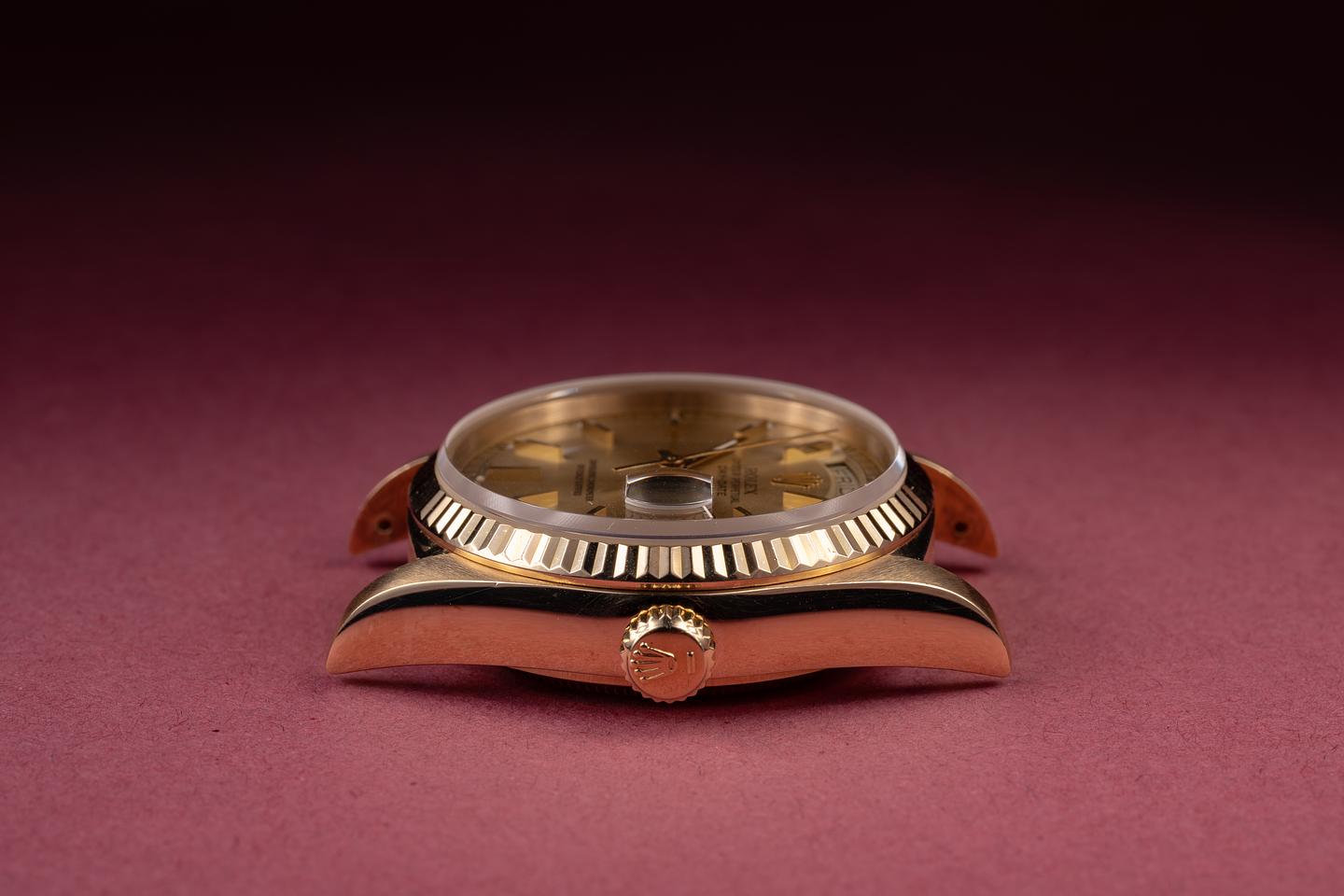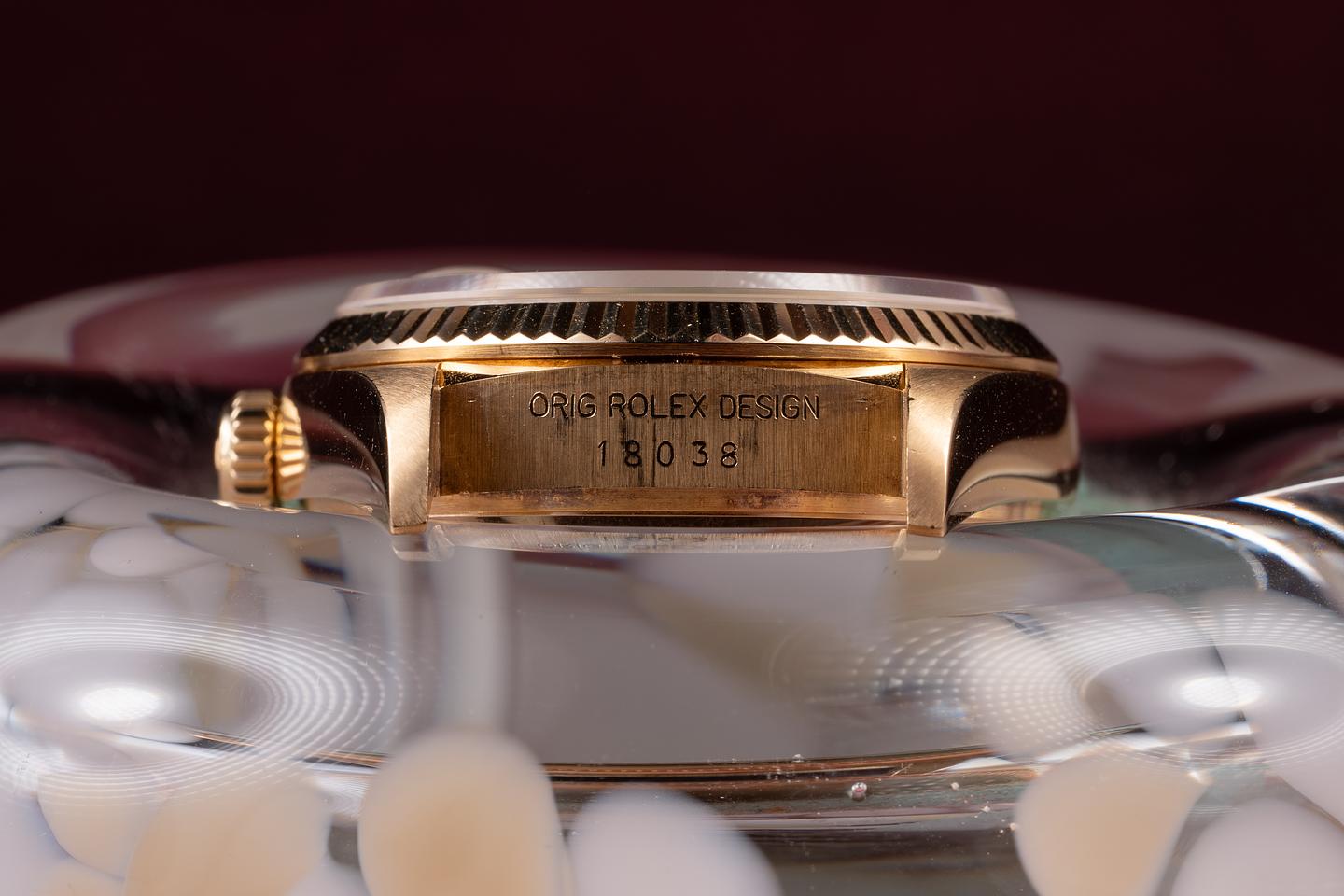 Case: The sharp 18K yellow gold case is excellent, showing only very light wear from use. The 18K yellow gold fluted bezel is also in excellent condition, showing only light wear from use.