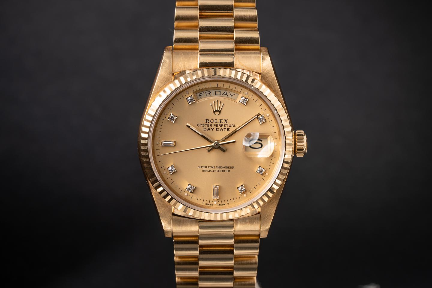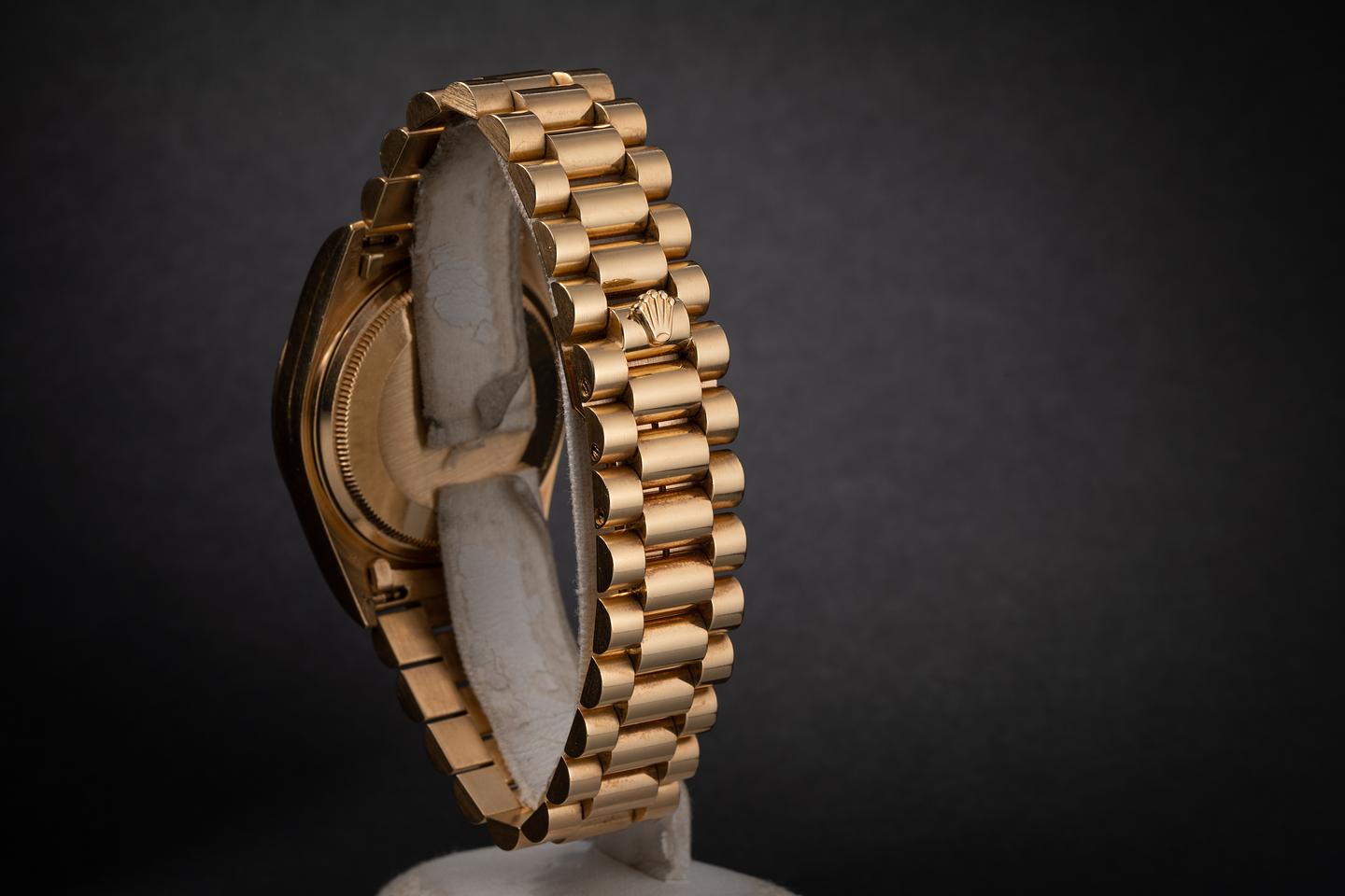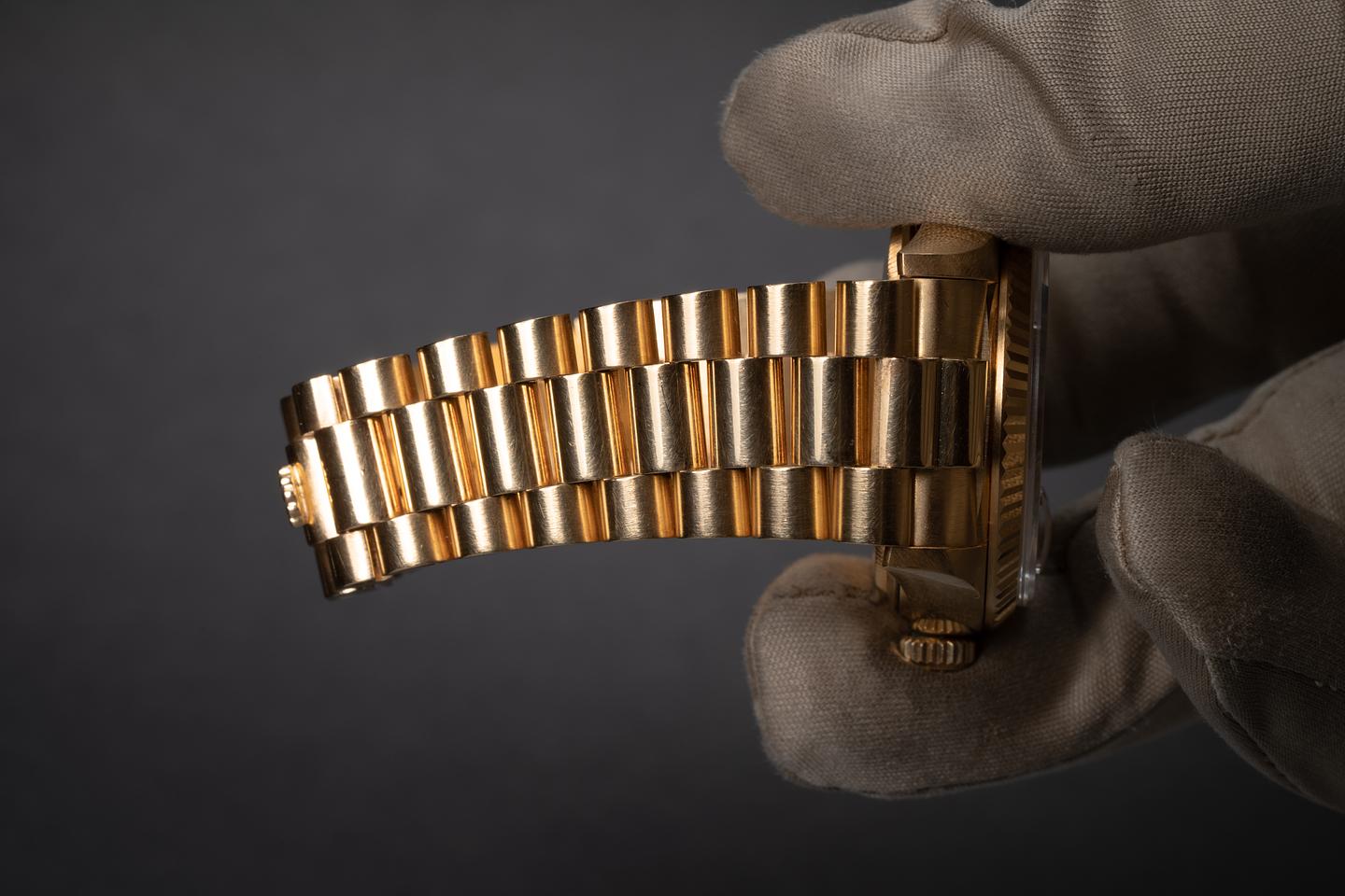 Bracelet: The 22 link 18k yellow gold president bracelet is excellent showing only light stretch for its age.