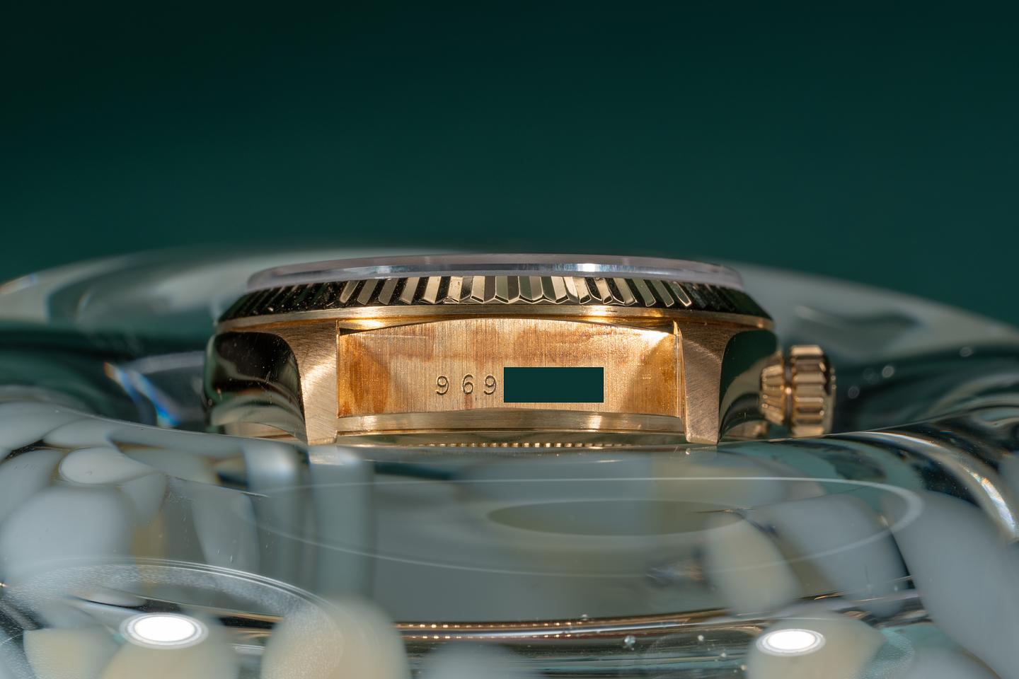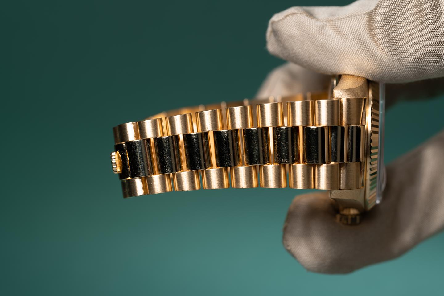 Bracelet: The 22 link 18K yellow gold President bracelet is excellent showing only very light stretch for its age. The clasp is stamped with a matching 1987 date code. There is some patina near the case on the end pieces.