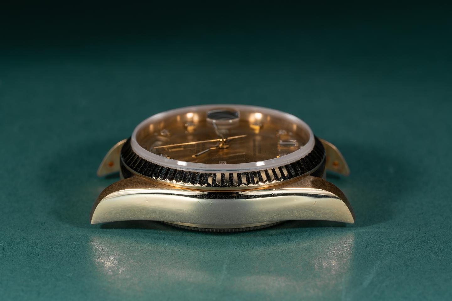 Case: The previously polished 18k yellow gold case is excellent showing only light wear from use. The sharp 18k yellow gold fluted bezel is also in excellent condition showing only very light wear form use.