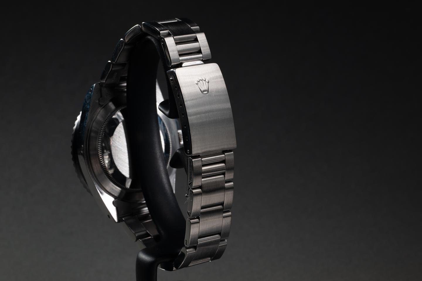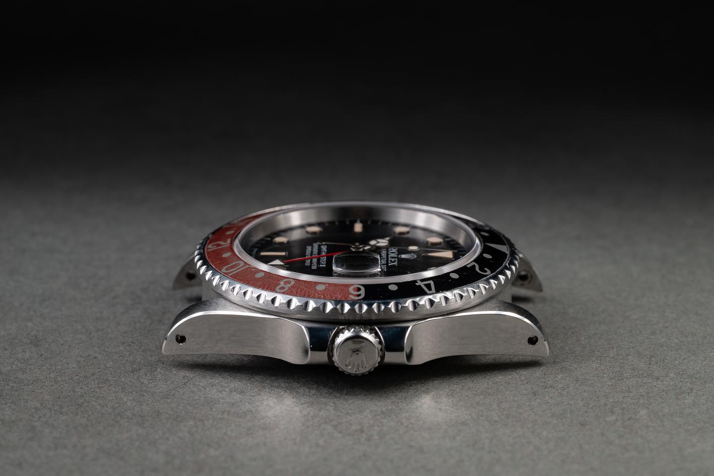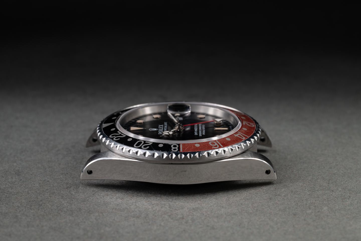 Case: The recently polished case is excellent, showing sharp, prominent bevels and only very light wear. The black and red "Coke" bezel insert is also in excellent condition, showing some fading to the red portion of the insert.