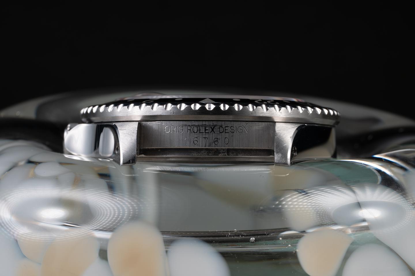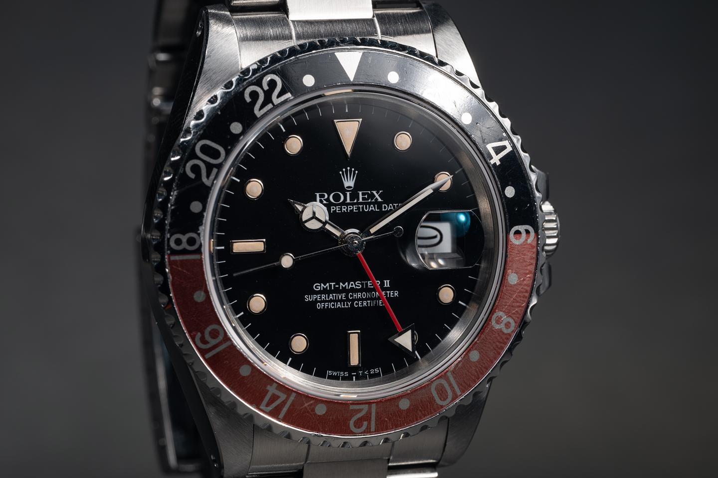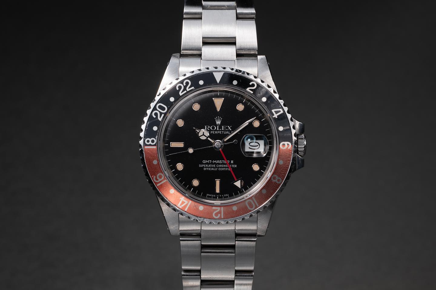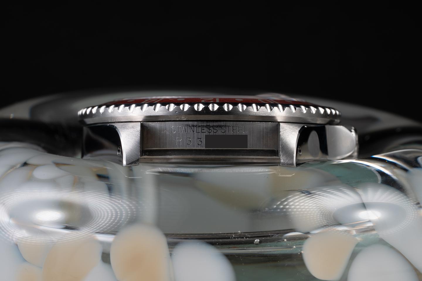 Case: The recently polished case is excellent, showing sharp, prominent bevels and only very light wear. The black and red "Coke" bezel insert is also in excellent condition, showing some fading to the red portion of the insert.