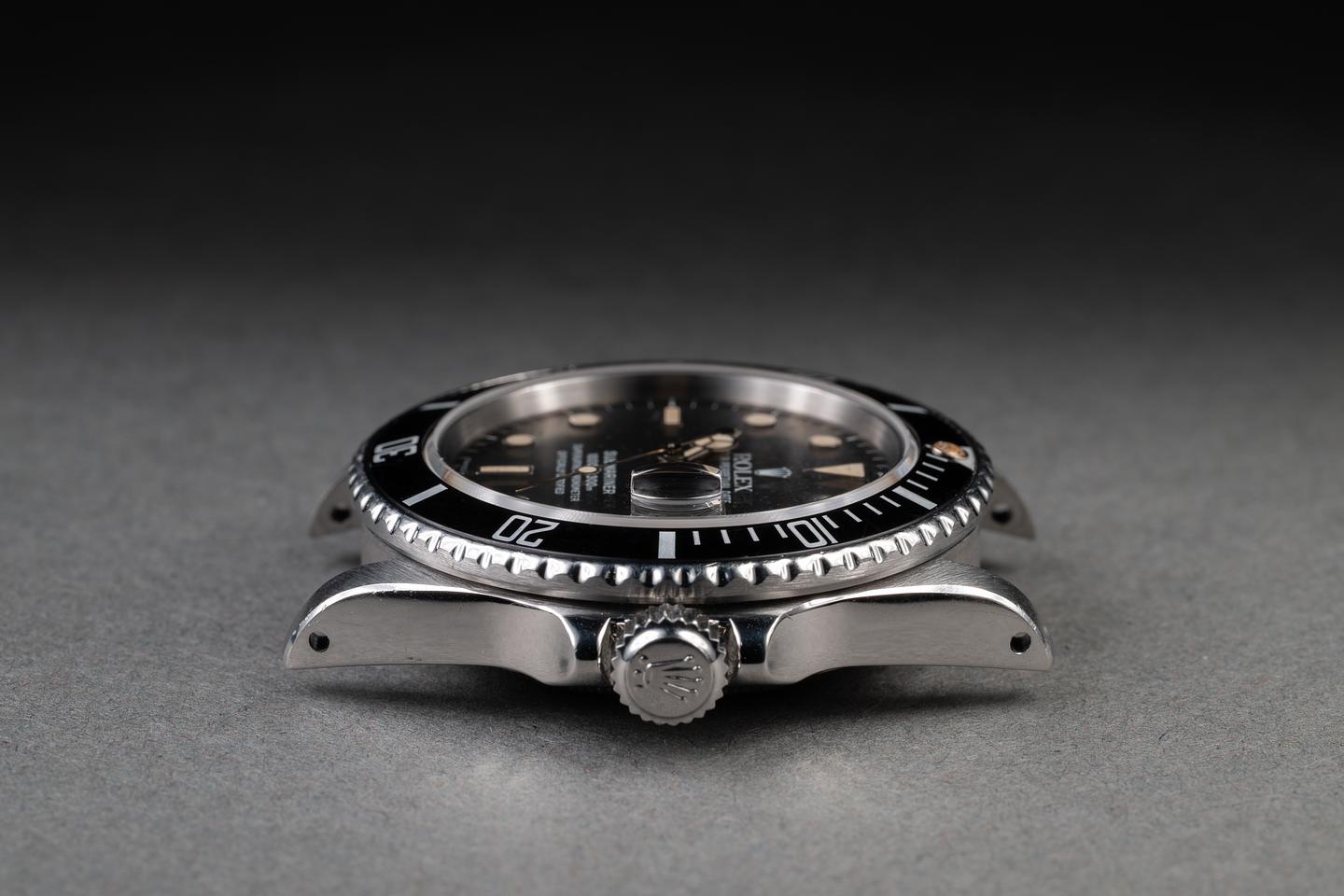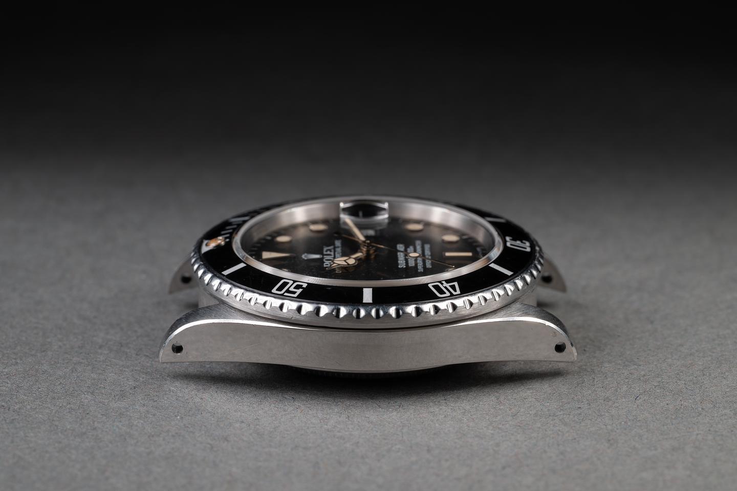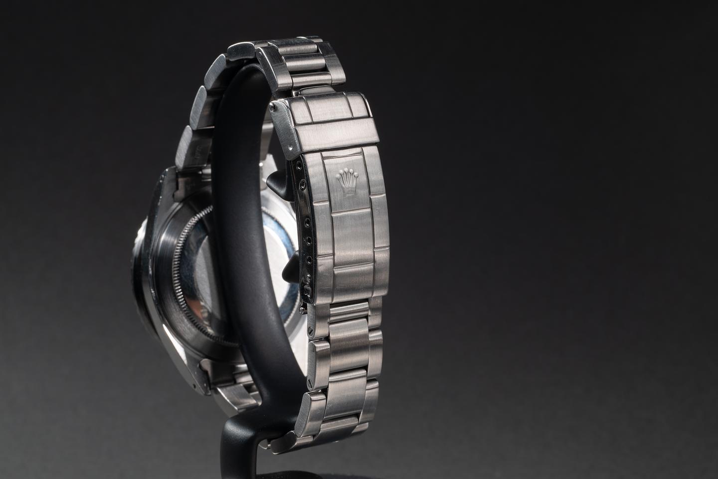 Case: The previously polished case is very good, showing wide, sharp, prominent bevels and some light wear from use. The black bezel insert is also in excellent condition, showing only light wear from use.