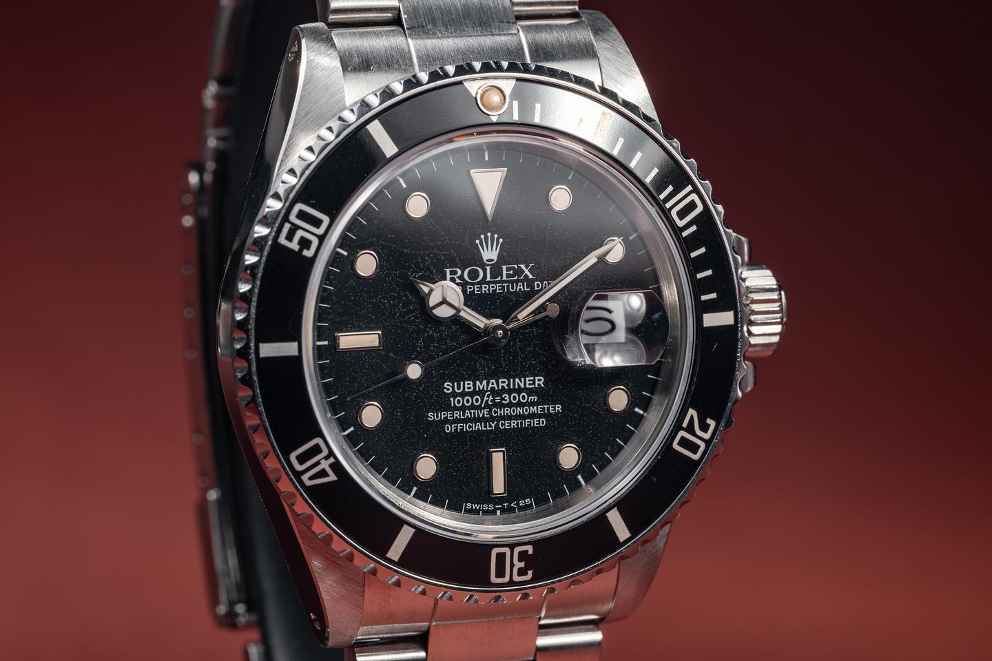 Dial: The glossy black dial is excellent, showing an extensive pattern of speckling patina across its surface.