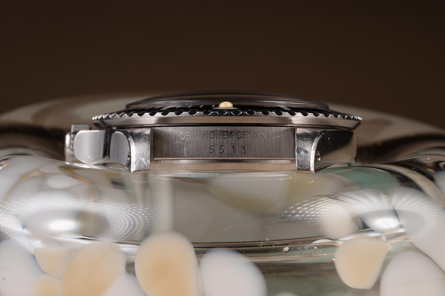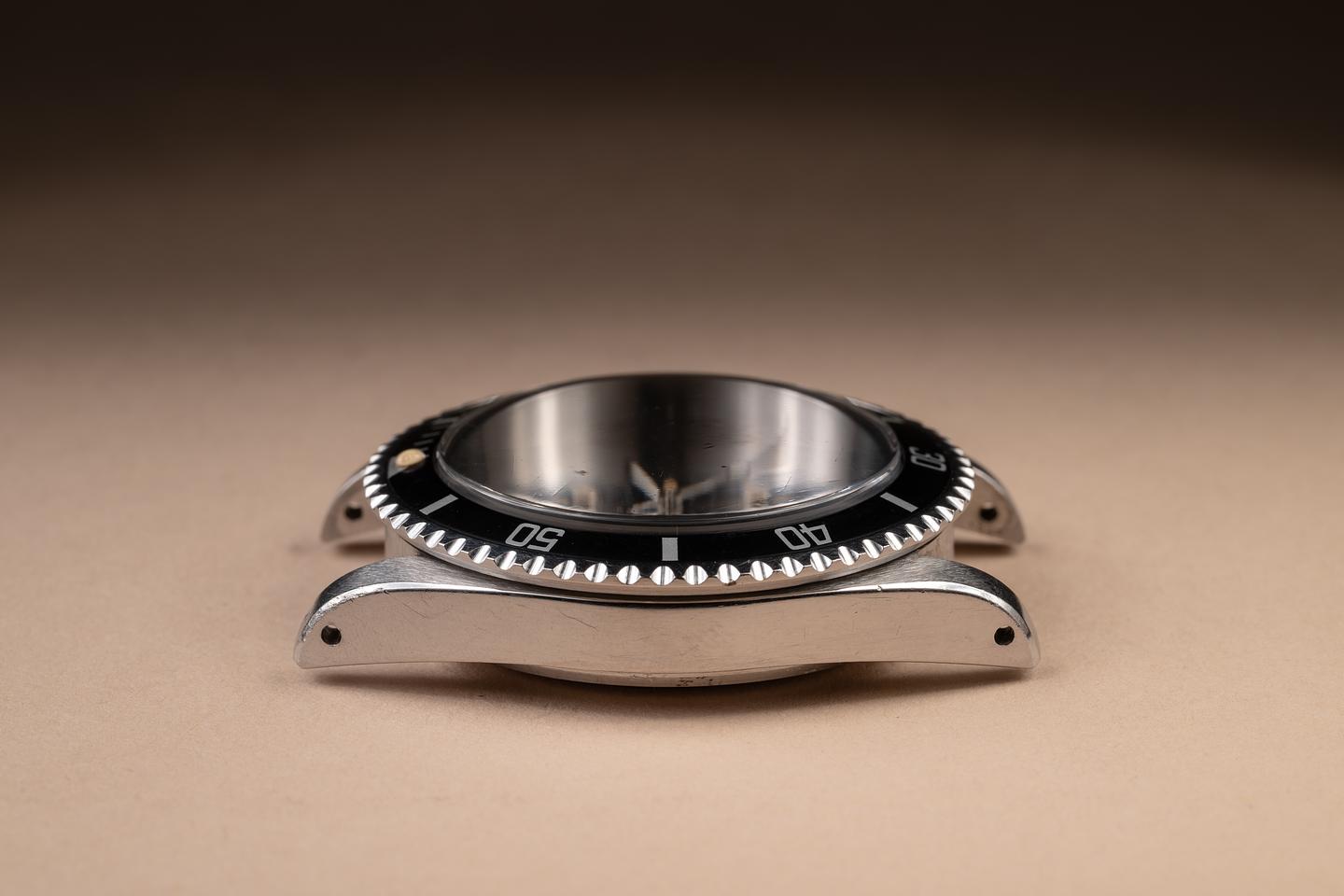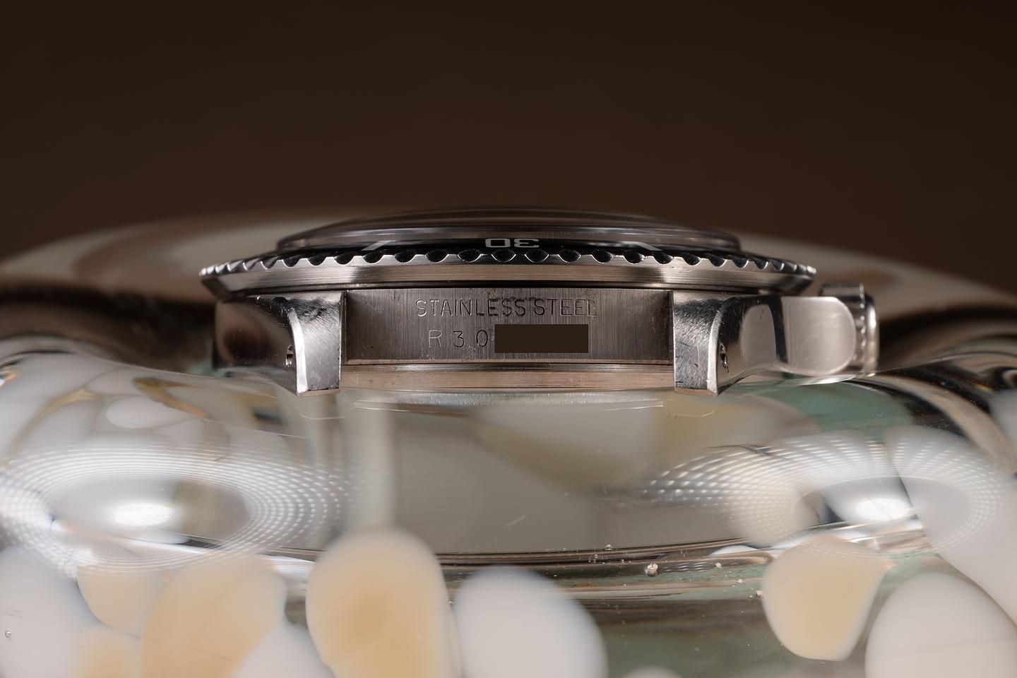 Case: The unpolished case is excellent, showing sharp, prominent factory bevels and some light wear from use. The black bezel insert is also in excellent condition, showing only light wear from use.