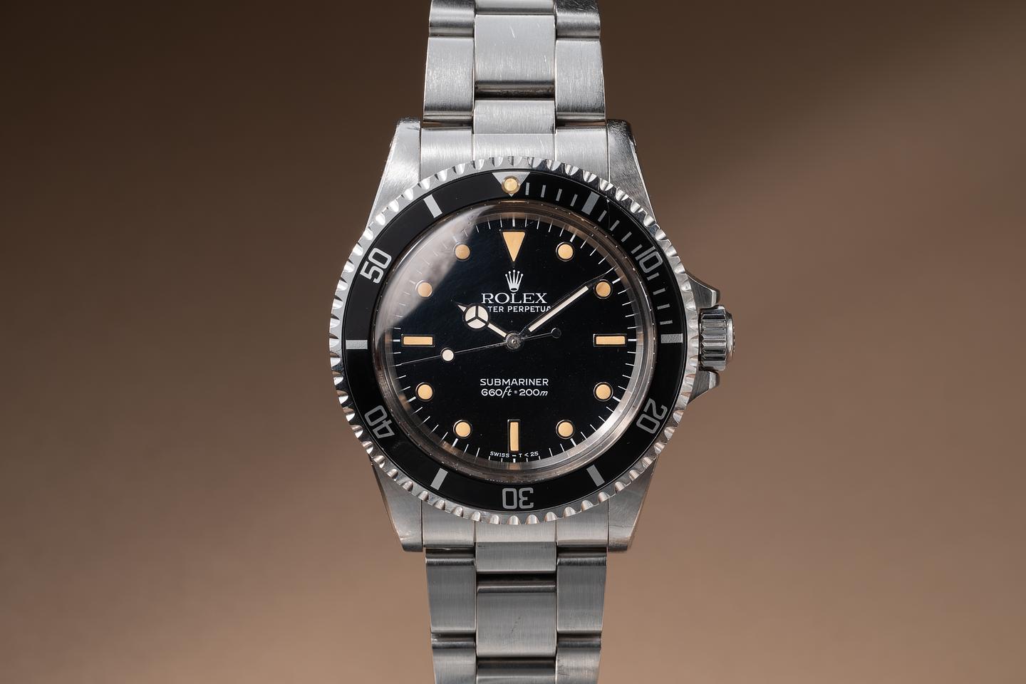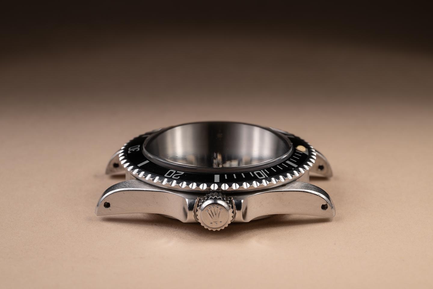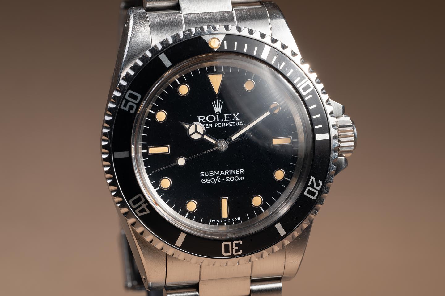 Case: The unpolished case is excellent, showing sharp, prominent factory bevels and some light wear from use. The black bezel insert is also in excellent condition, showing only light wear from use.