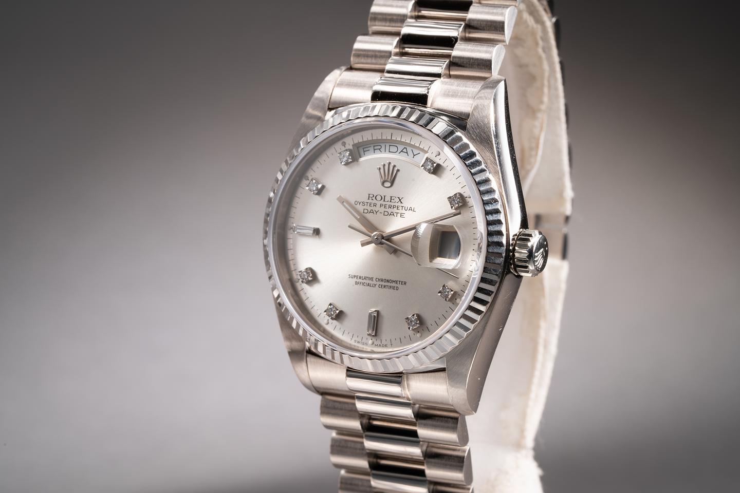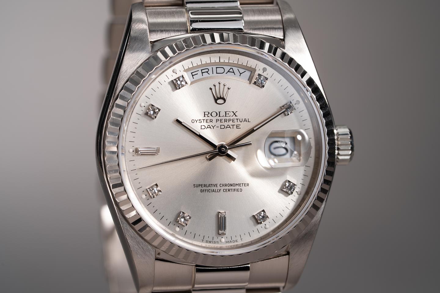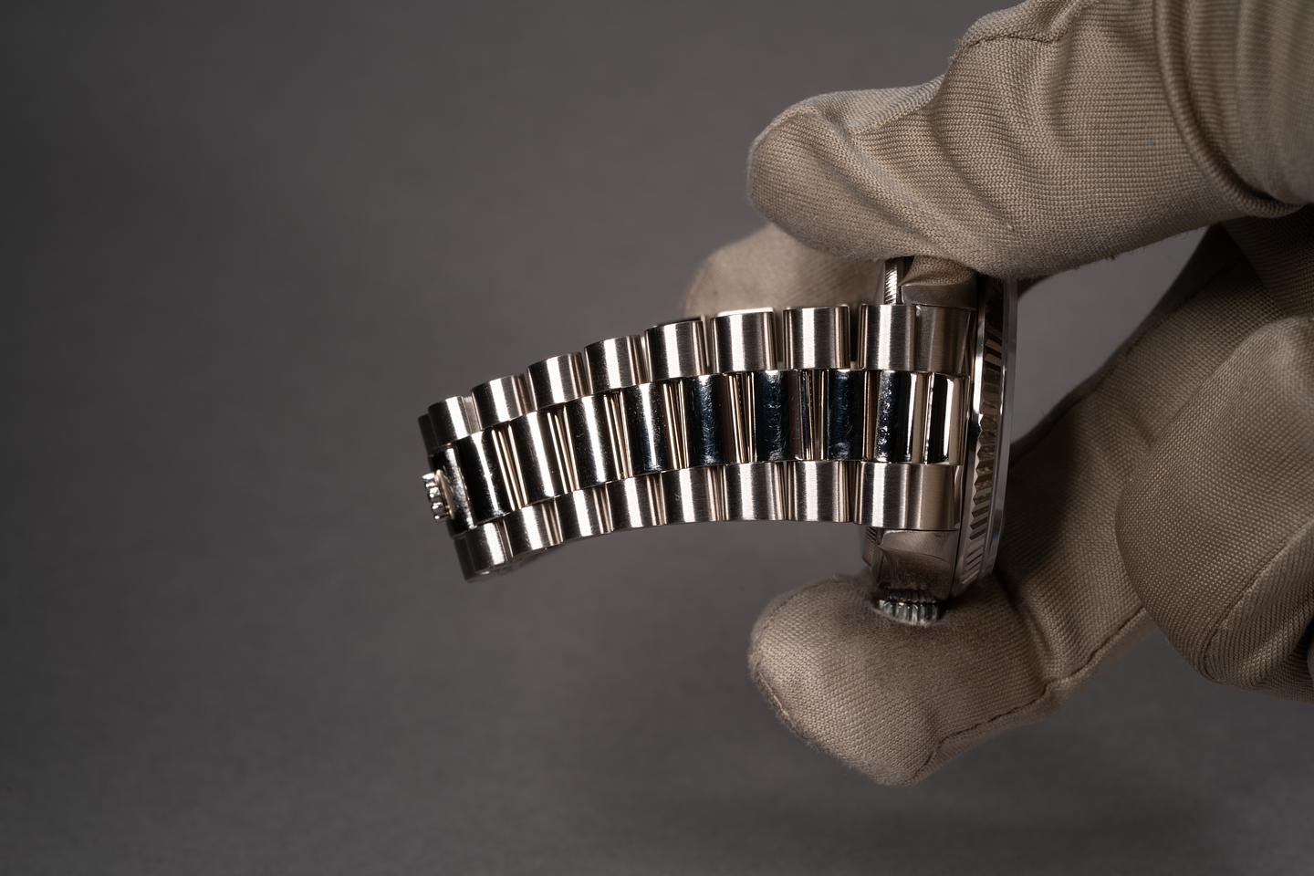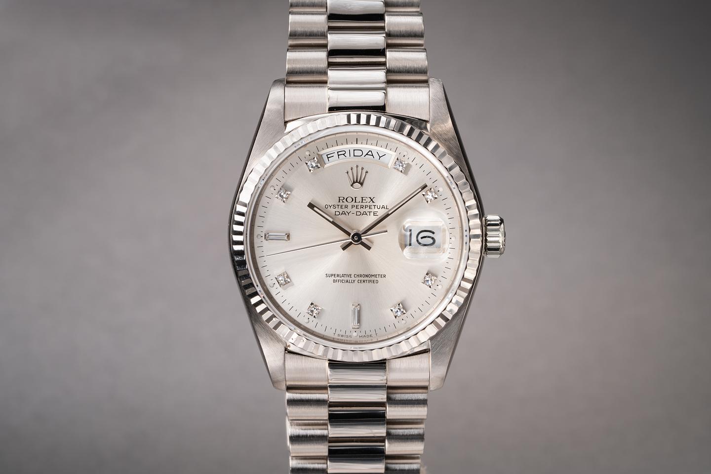 Bracelet: The 22 link 18k white gold President bracelet is excellent showing average stretch for its age. The clasp is stamped with a matching 1988 date code.
