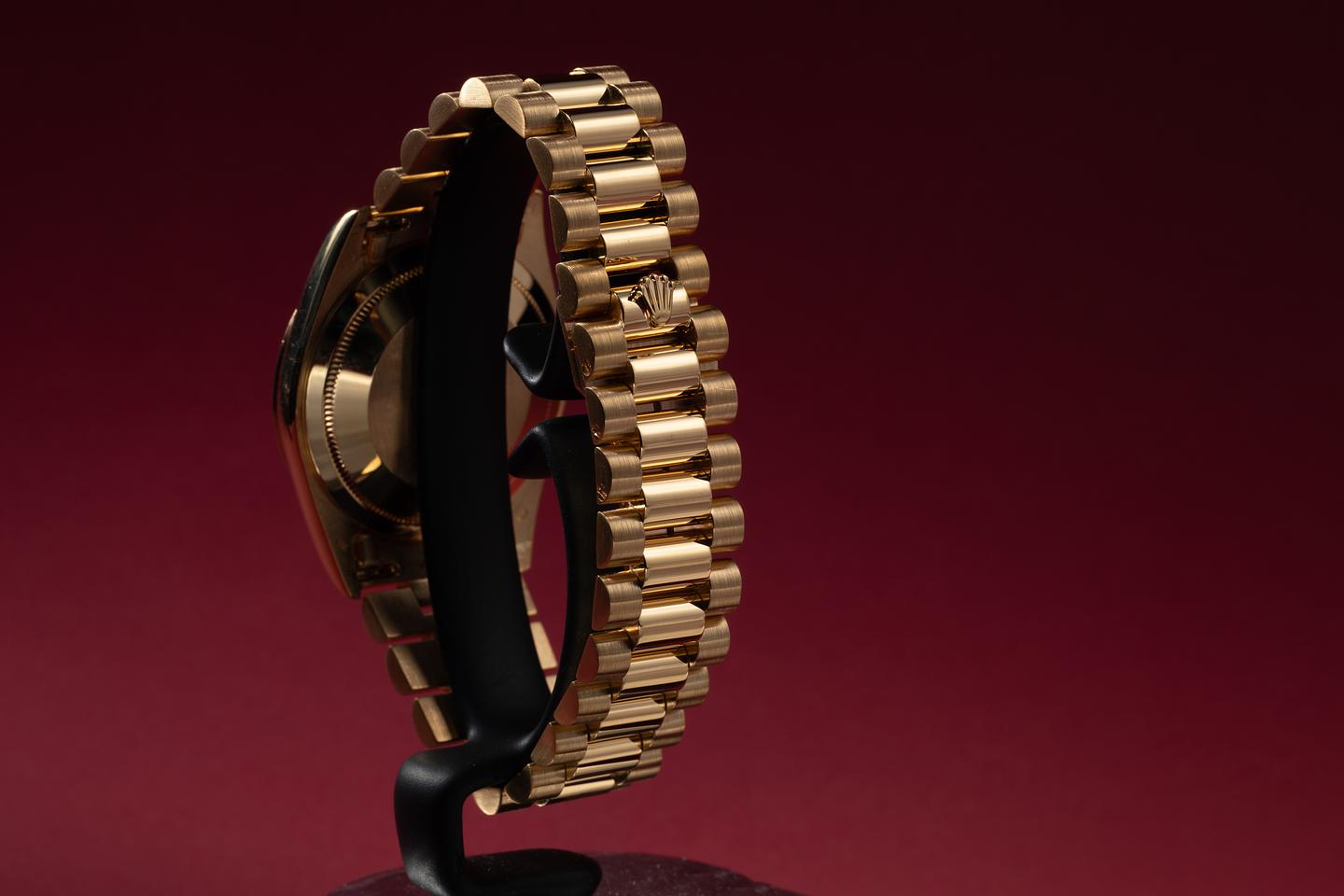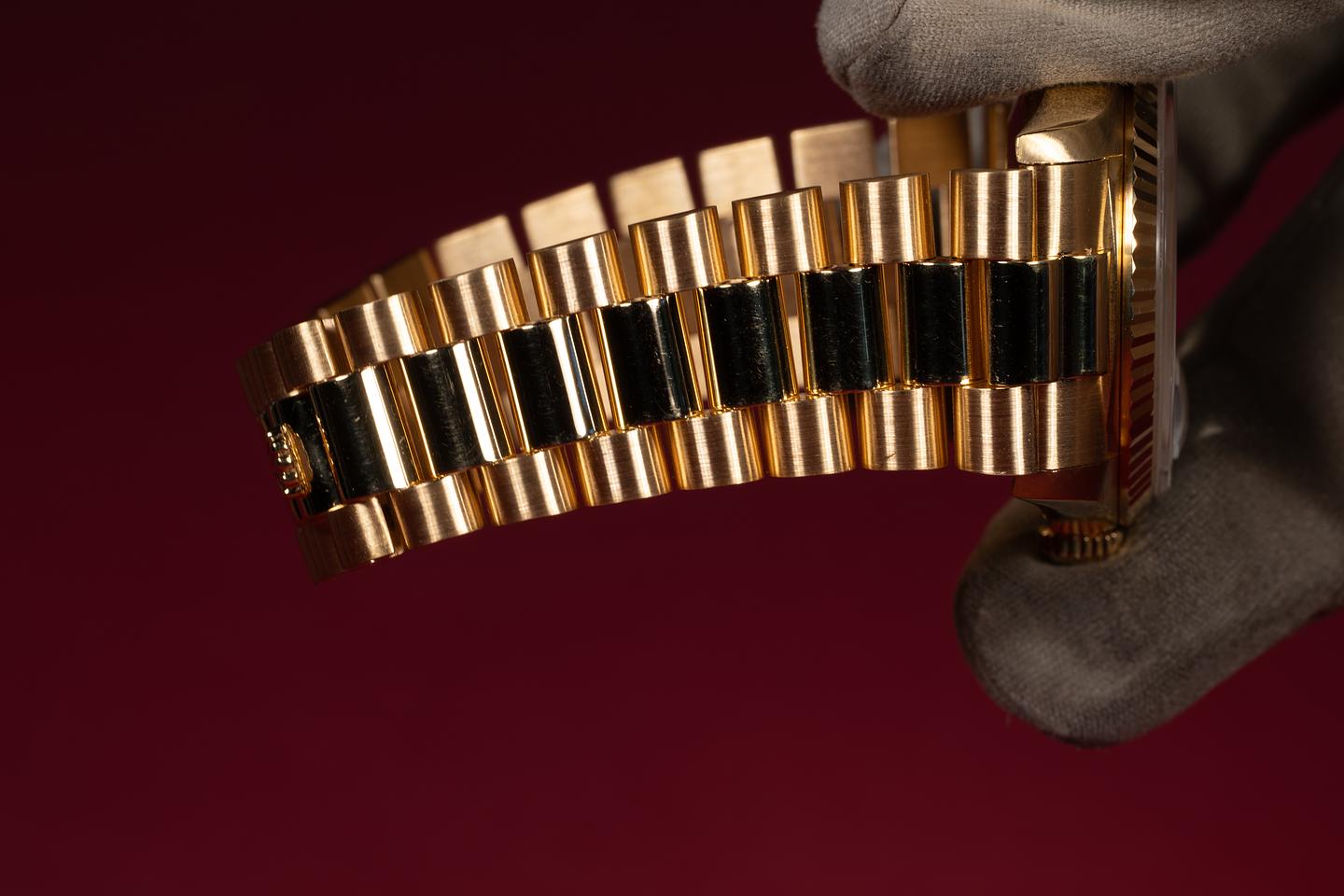 Bracelet: The 22-link 18K yellow gold president bracelet is excellent showing only light stretch for its age.