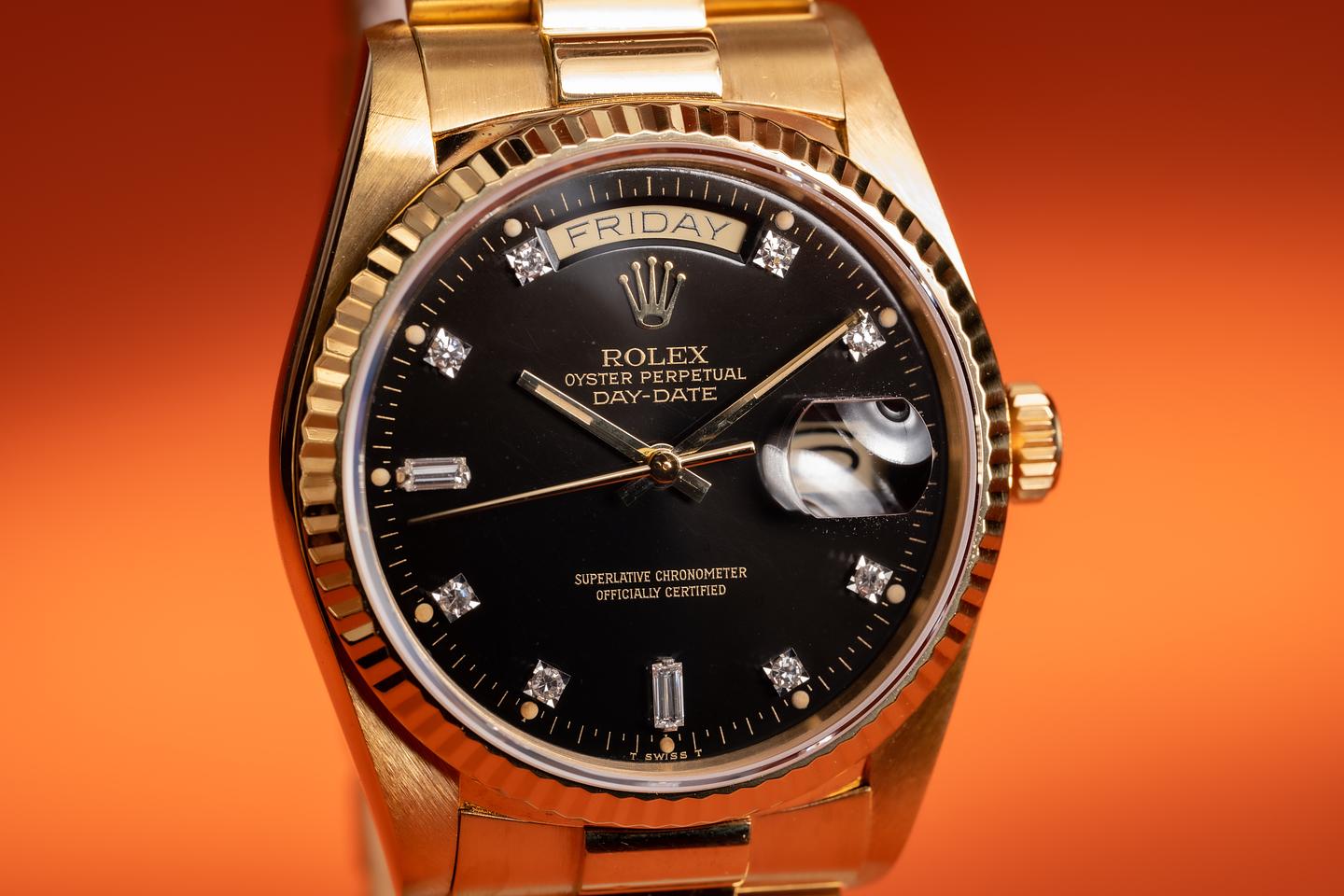 Bracelet: The 22 link 18K yellow gold presidential bracelet is excellent showing light stretch for its age. The clasp is stamped with a matching 1988 date code.