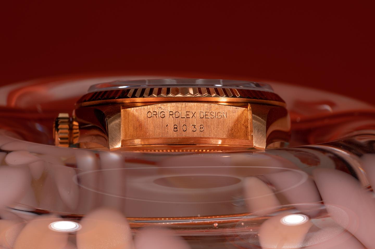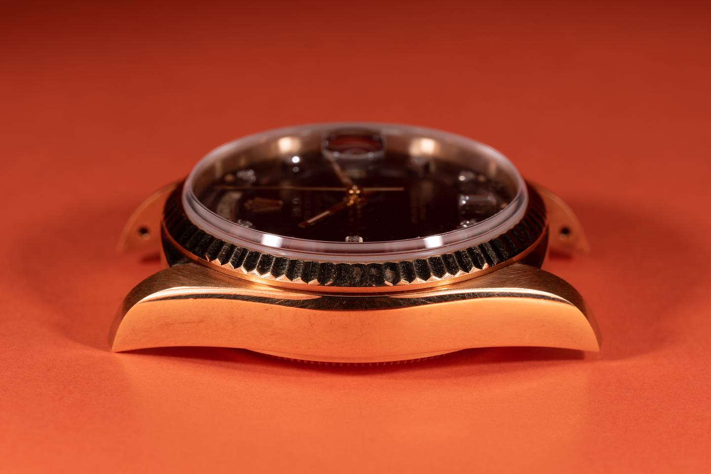 Case: The sharp, thick, and even case is excellent showing only very light wear from use. The sharp 18k yellow gold fluted bezel is also in excellent condition showing only very light wear from use.