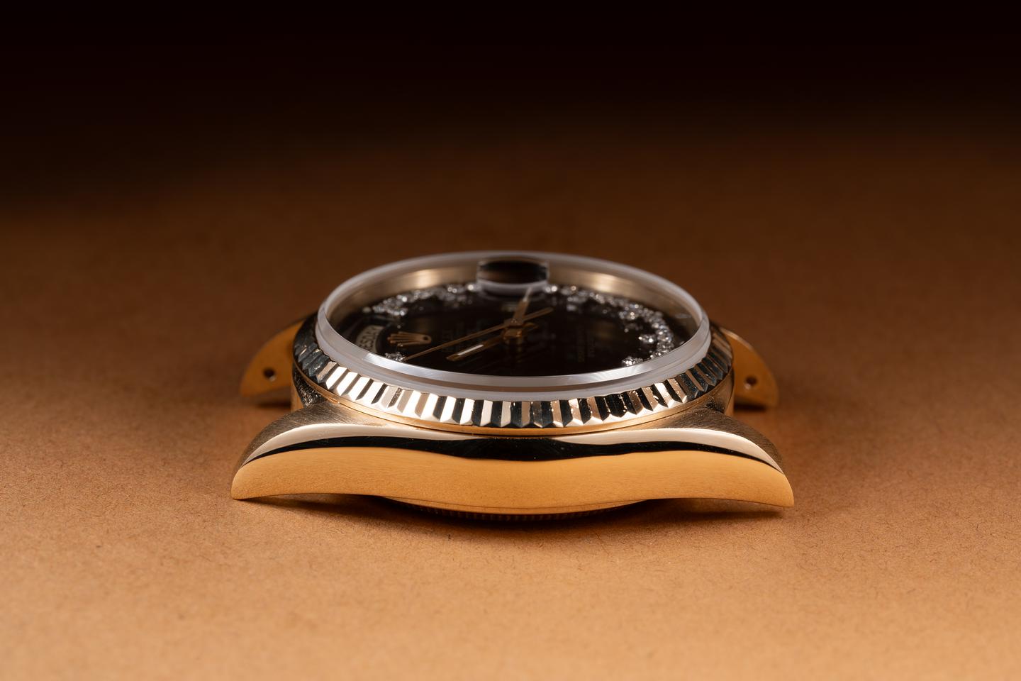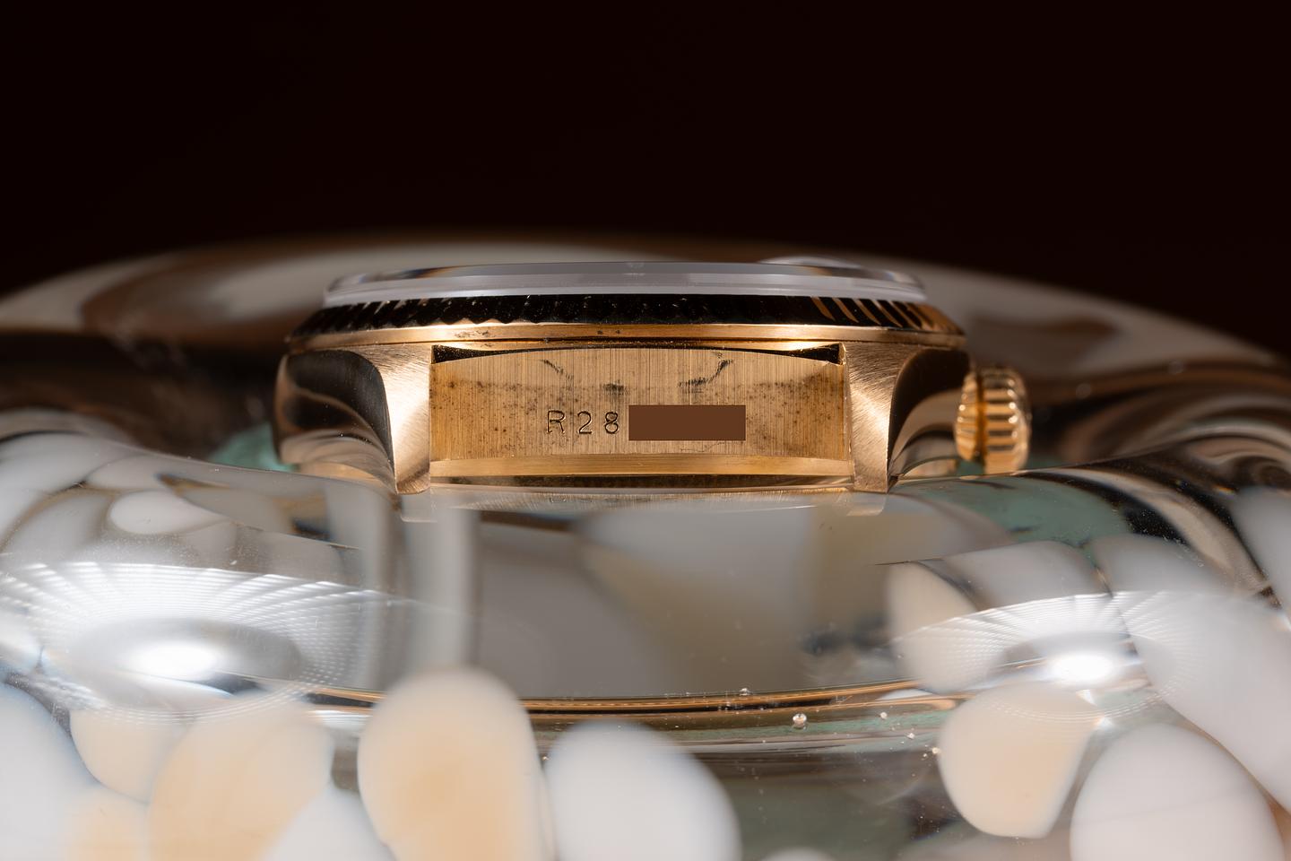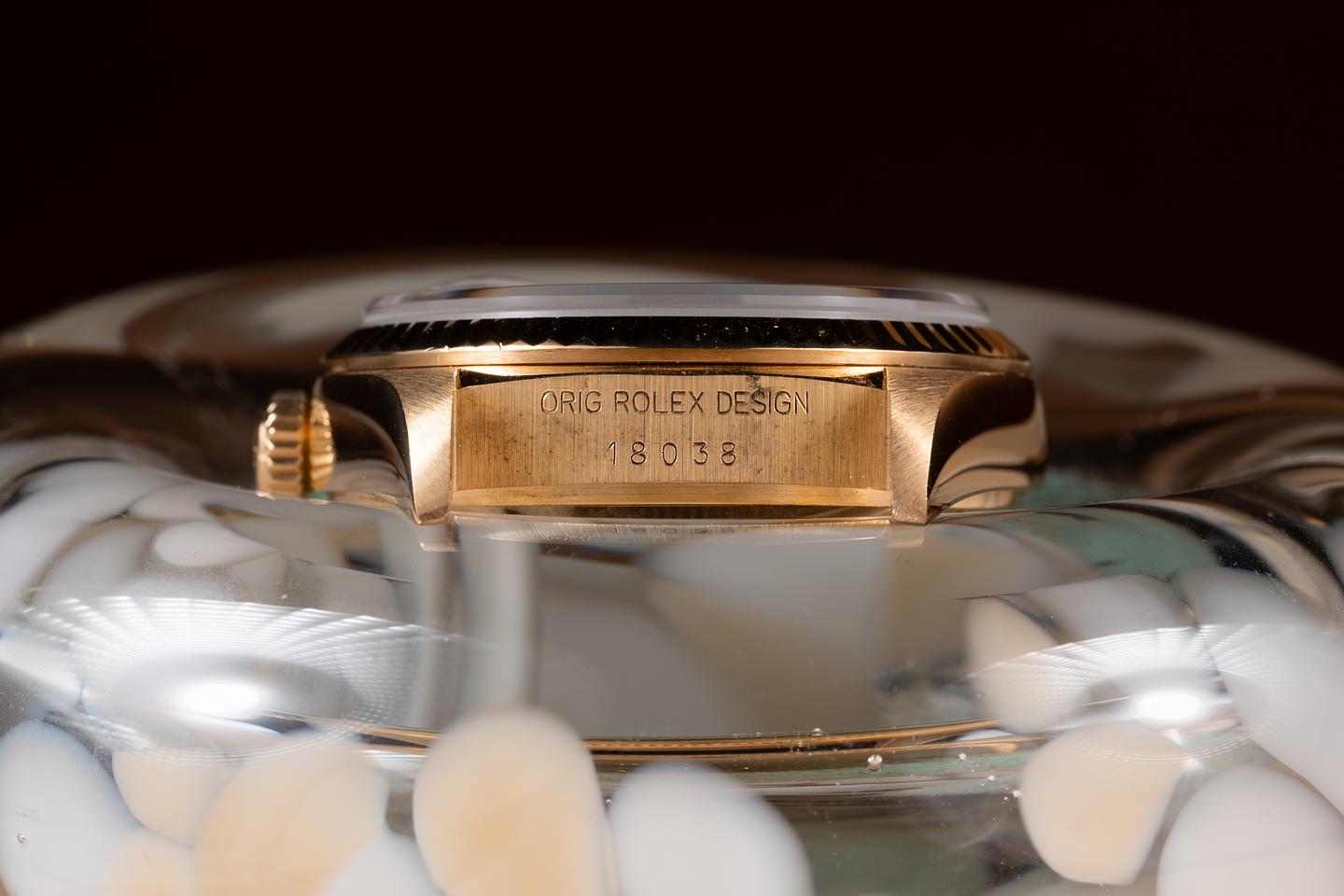 Case: The thick, sharp, and even 36mm 18K yellow gold case is excellent showing only very light wear from use. The sharp 18K yellow gold fluted bezel is also in excellent condition showing only very light wear.
