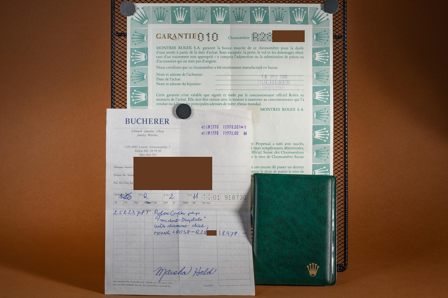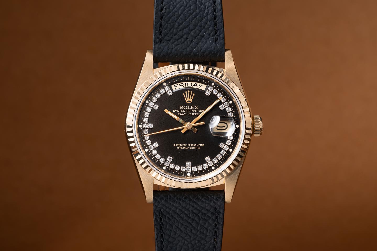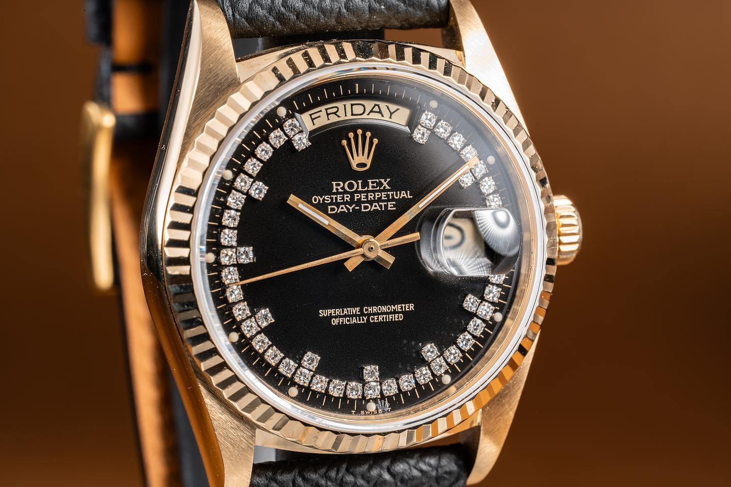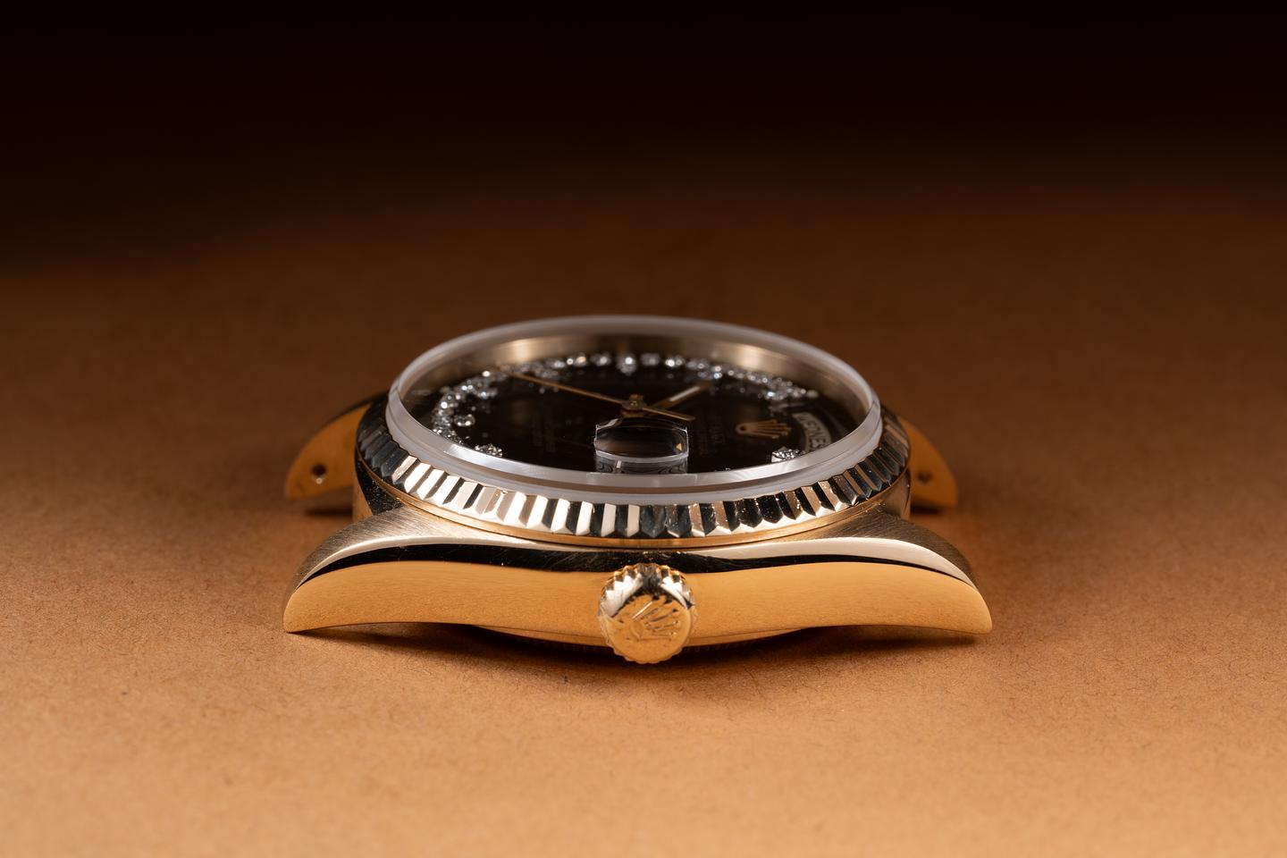 Case: The thick, sharp, and even 36mm 18K yellow gold case is excellent showing only very light wear from use. The sharp 18K yellow gold fluted bezel is also in excellent condition showing only very light wear.