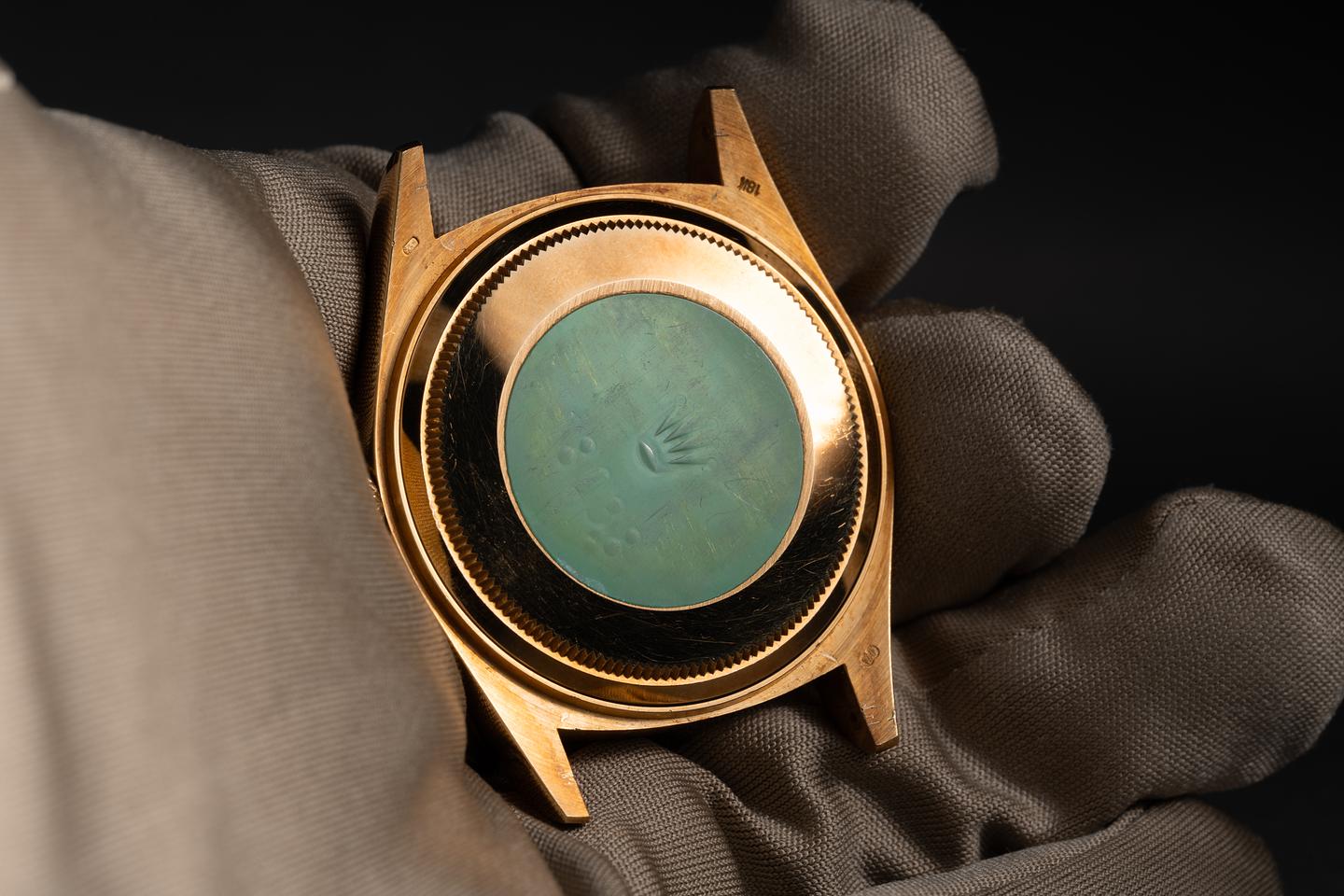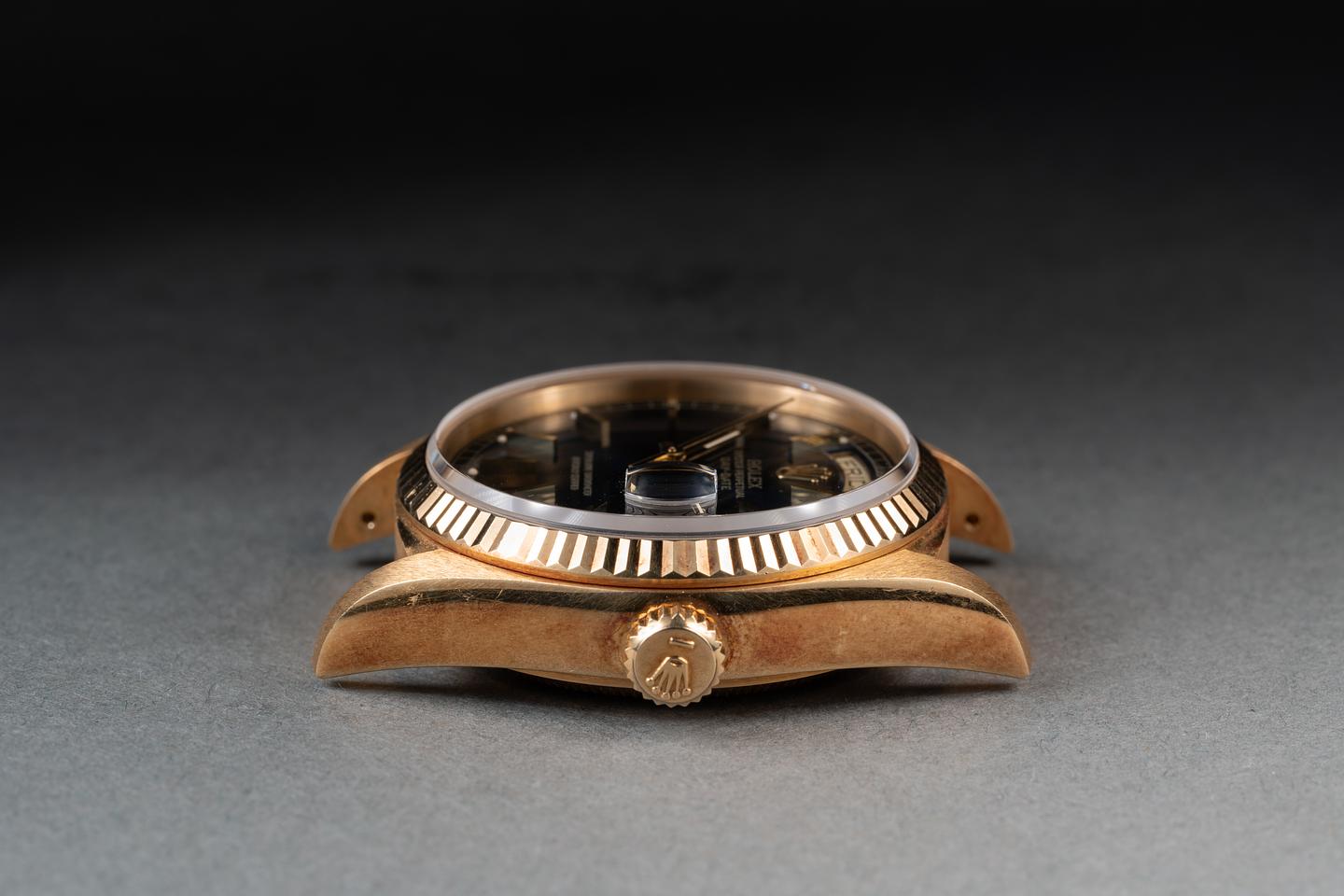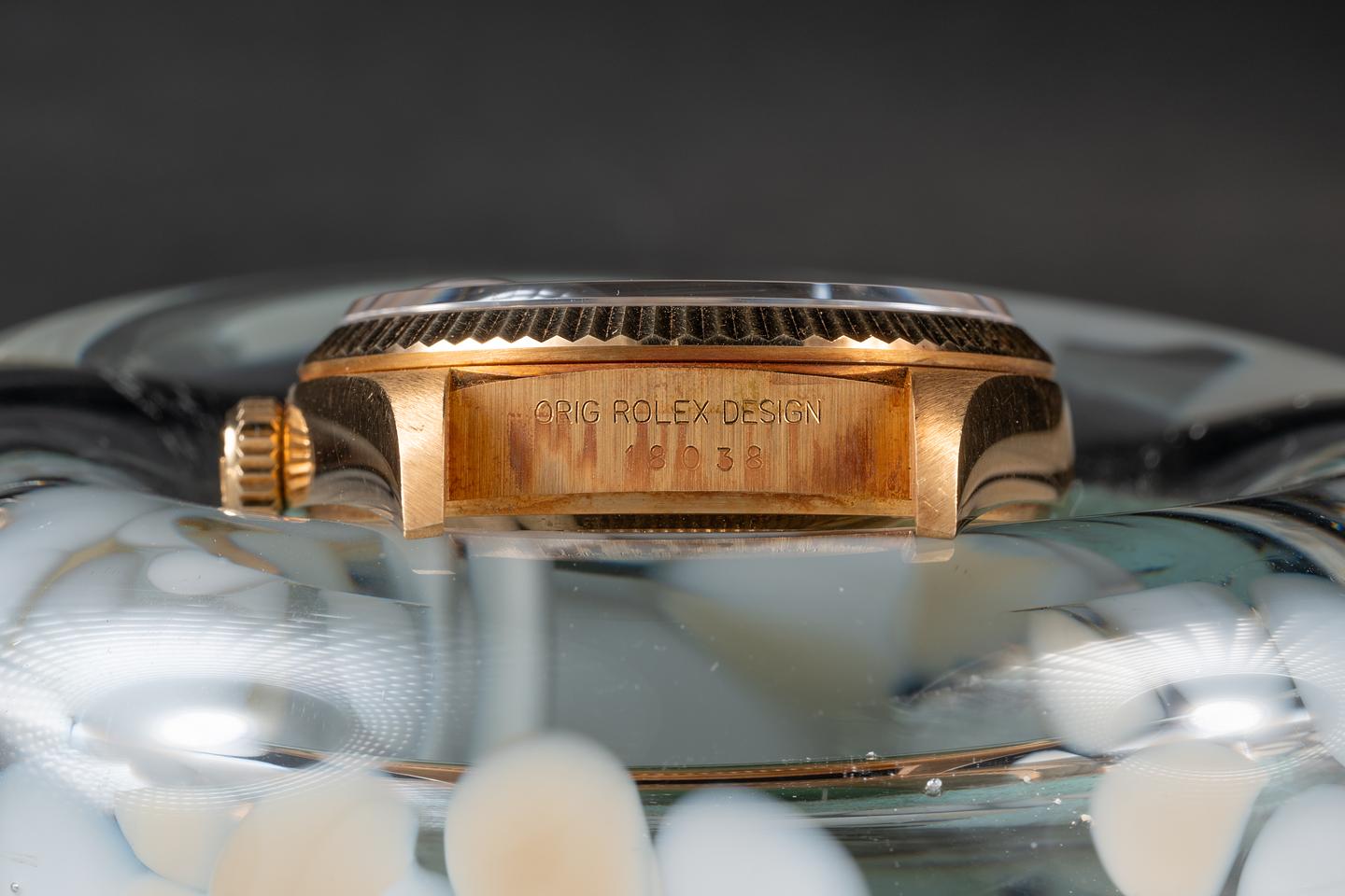 Case: The sharp unpolished case is excellent showing a warm rosy patina and only very light wear. The sharp 18k yellow gold fluted bezel is also in unpolished condition showing a warm rosy patina and only very light wear.