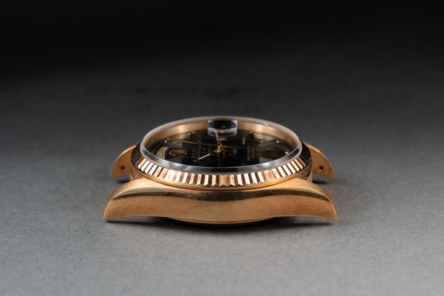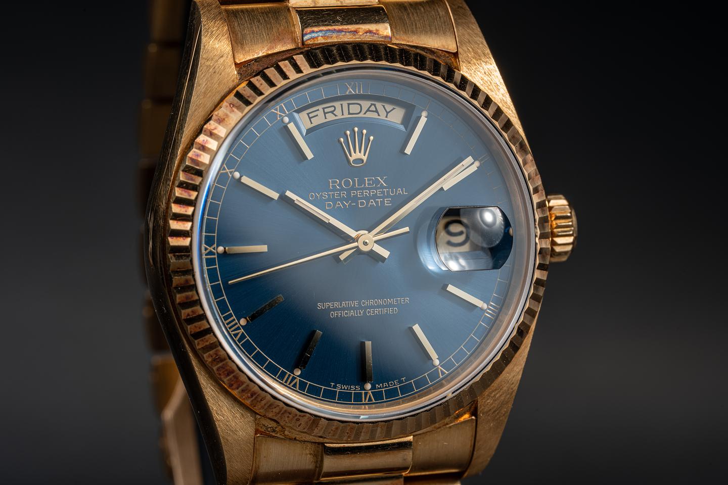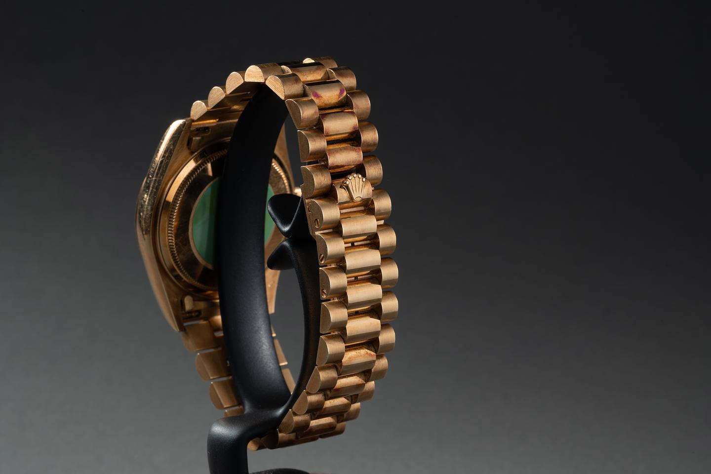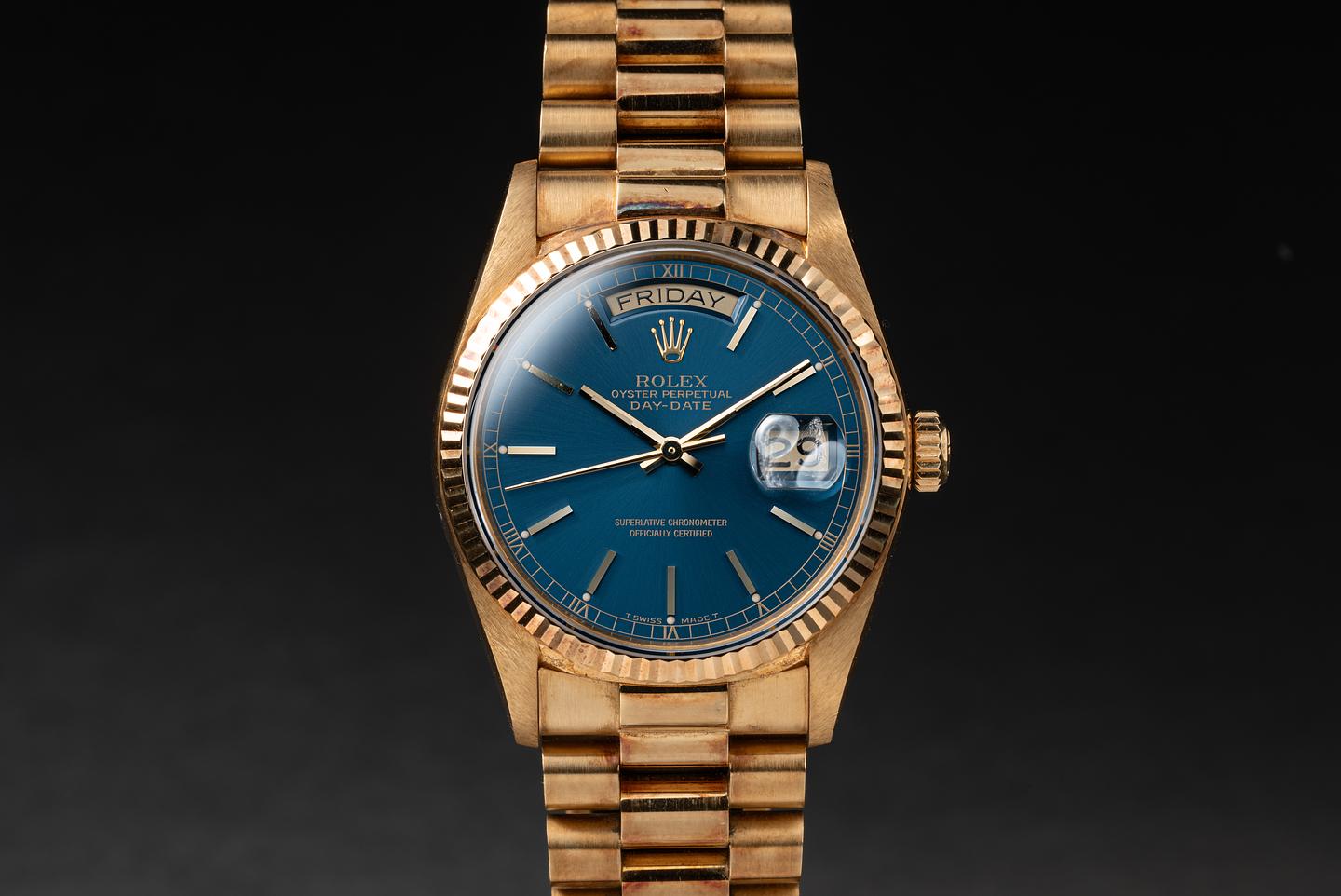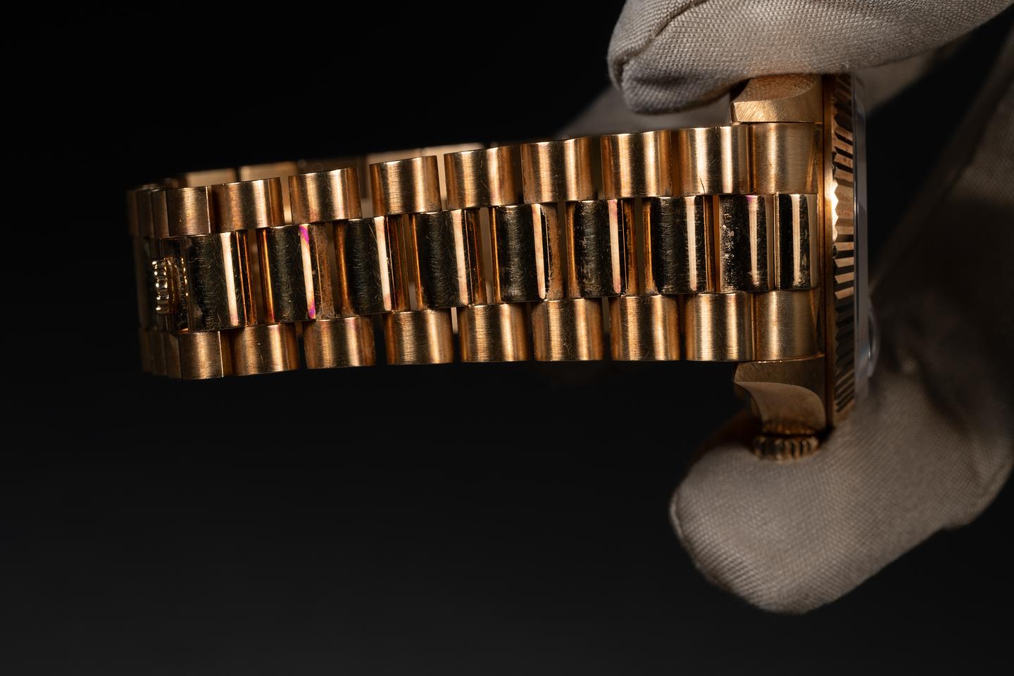 Bracelet: The 22 link 18K yellow gold patinaed President bracelet is excellent showing only very light stretch for its age. The clasp is stamped with a matching 1988 date code. The bracelet will fit up to a 17.2 cm. / 6.77" wrist.