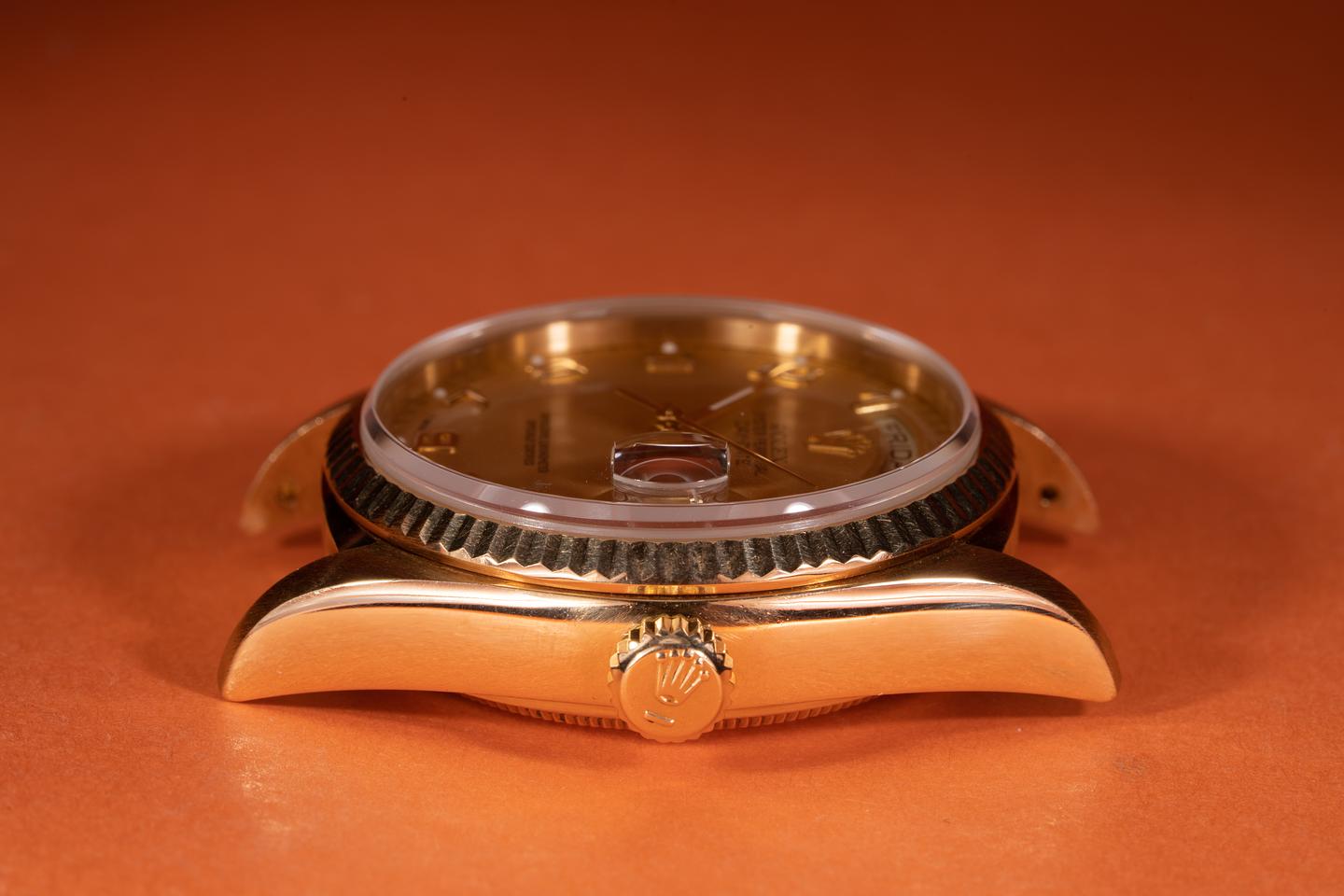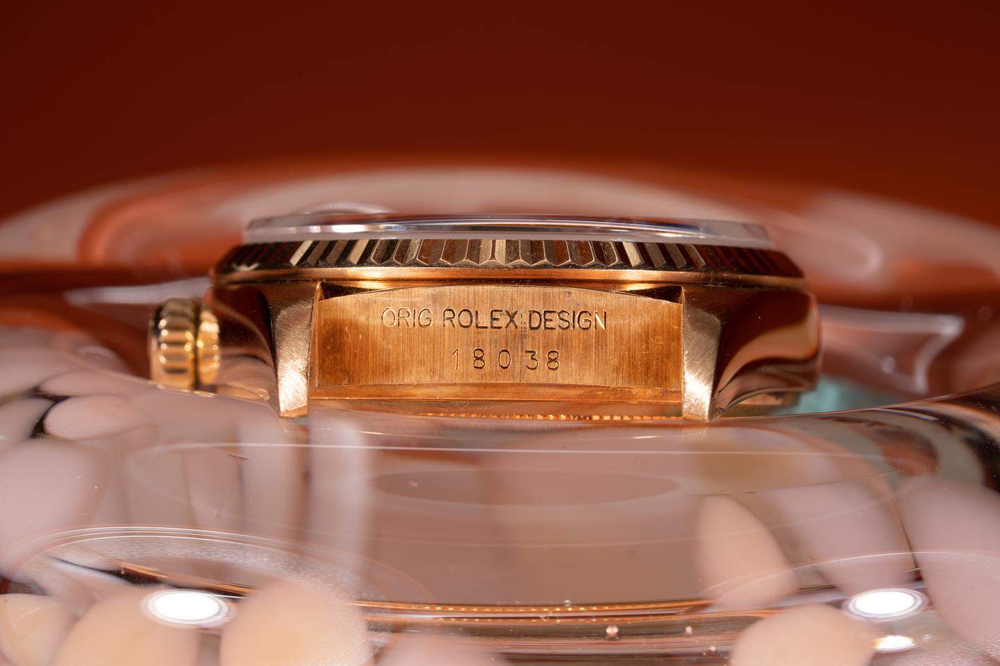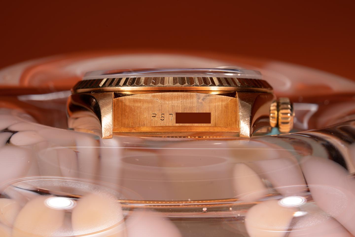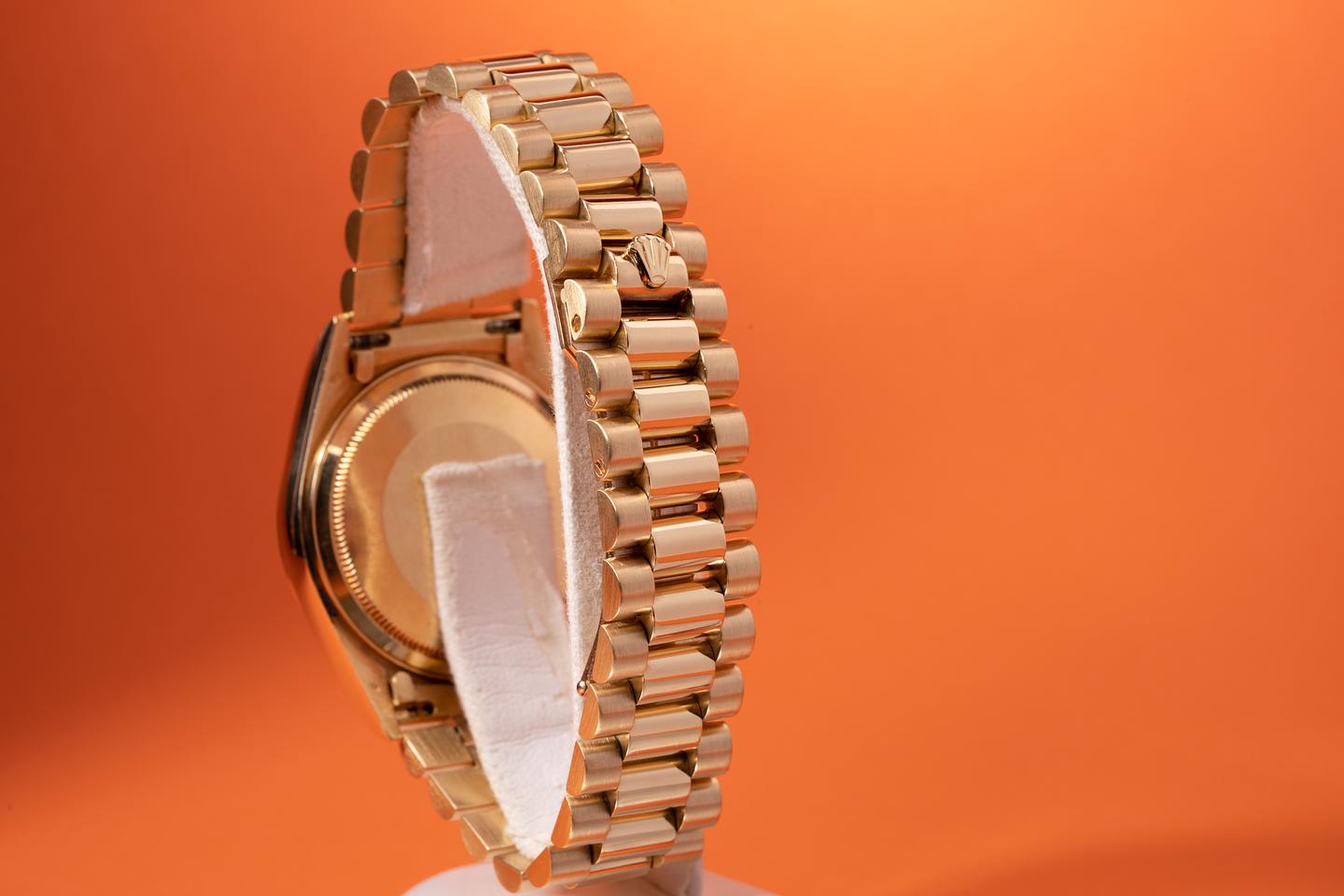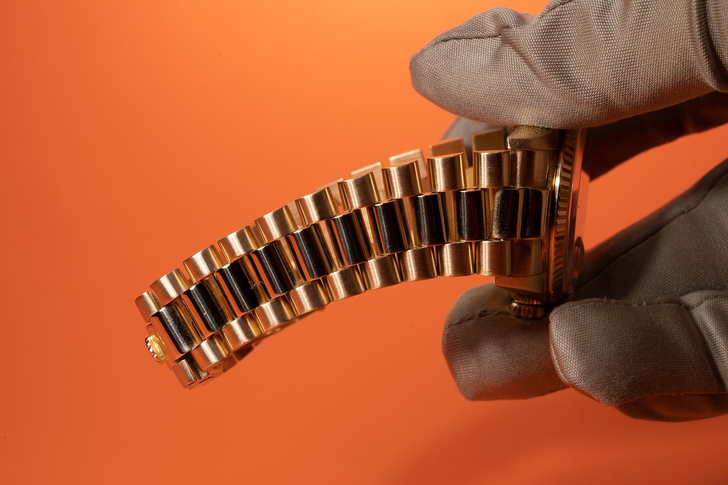 Bracelet: The 24 link 18k yellow gold President bracelet is excellent showing average stretch for its age. The clasp is stamped with a matching 1988 date code.