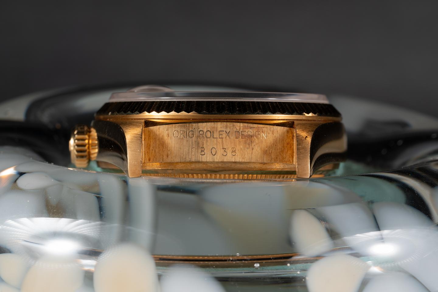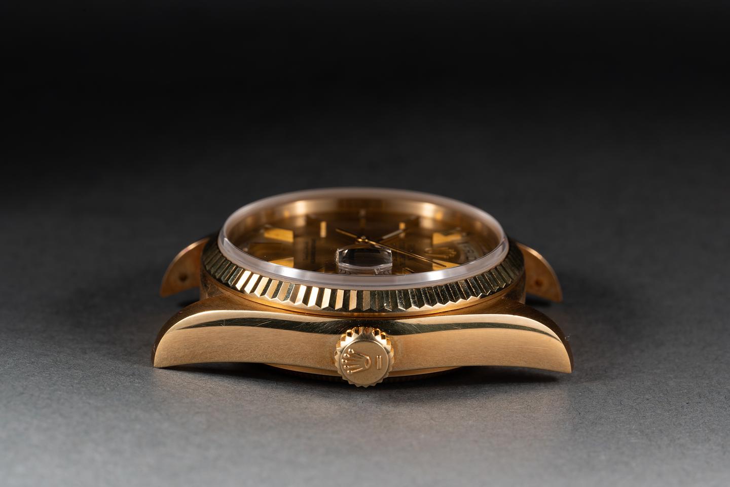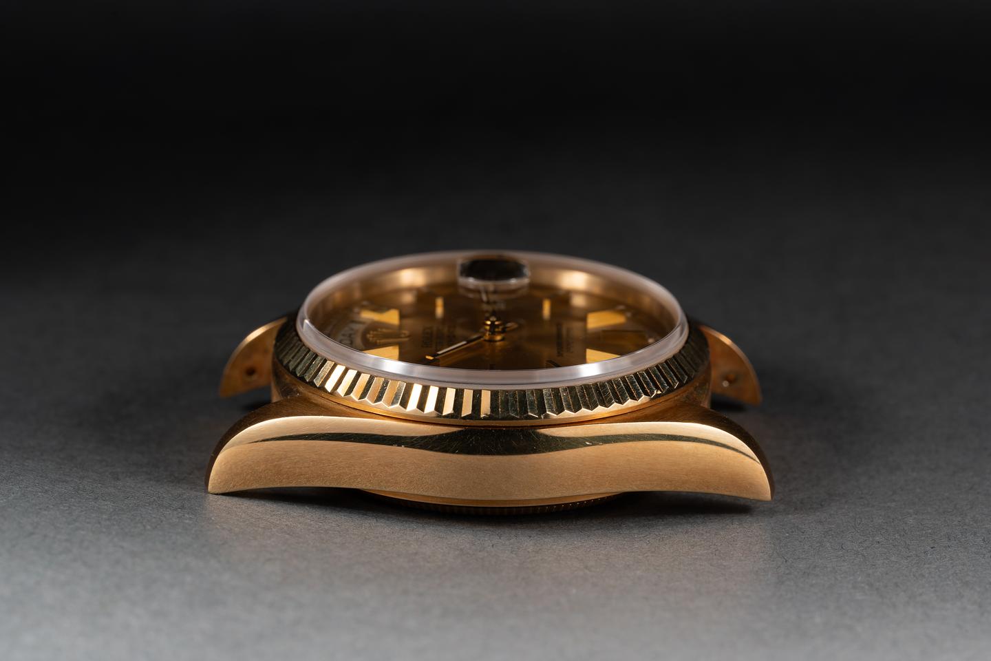 Case: The sharp 18k yellow gold case is excellent showing a warm rosy patina and only light wear from use. The sharp 18k yellow gold fluted bezel is also in excellent condition showing a warm rosy patina and only light wear from use.