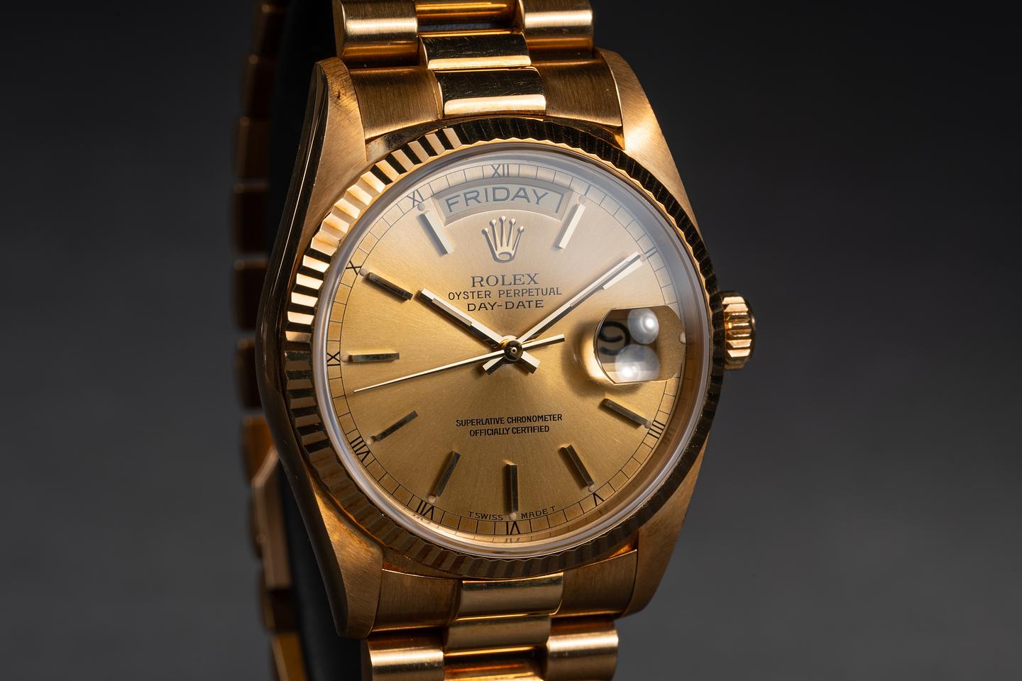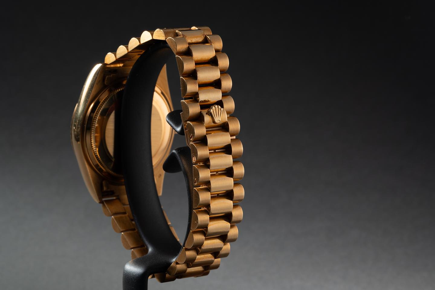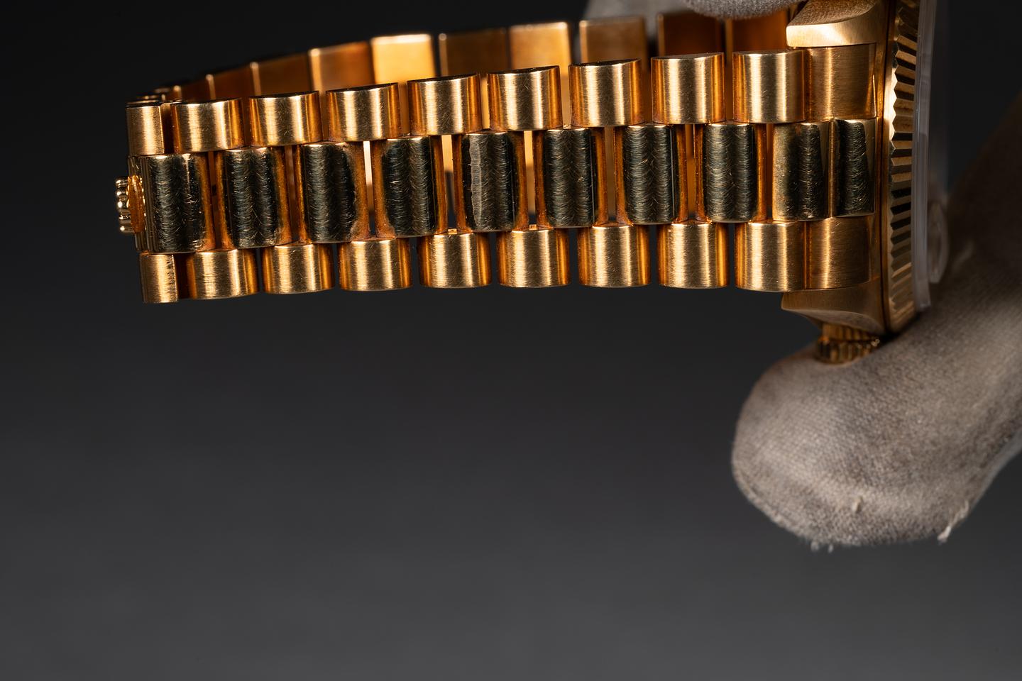 Bracelet: The 23 link patinaed president bracelet is excellent showing only very light stretch for its age. The clasp is stamped with a matching 1988 date code.