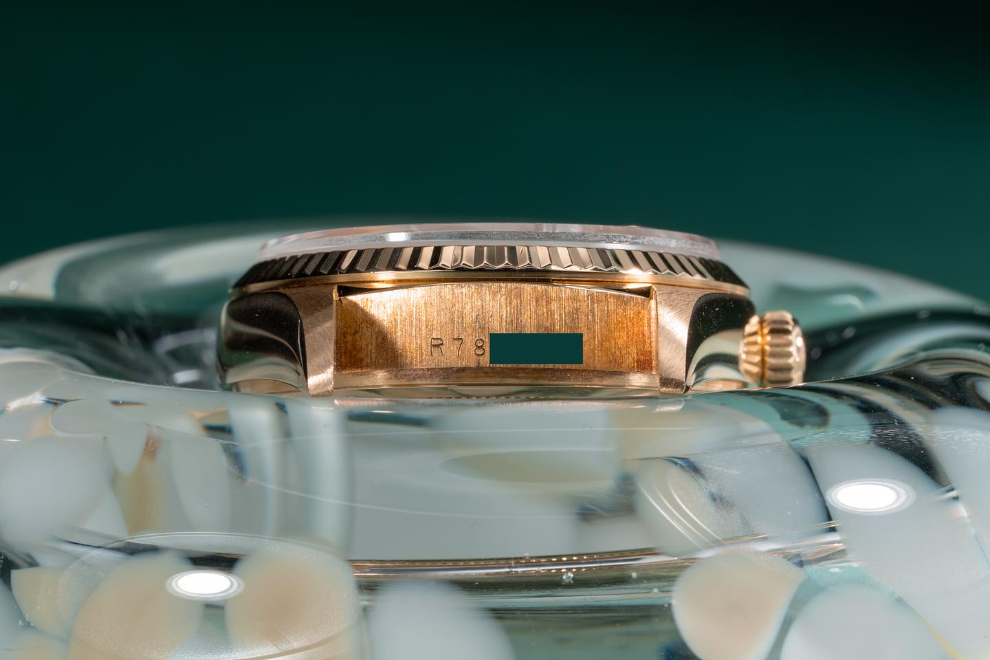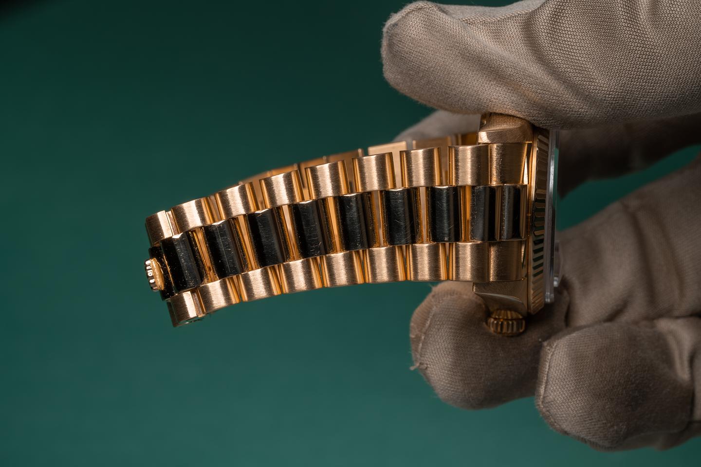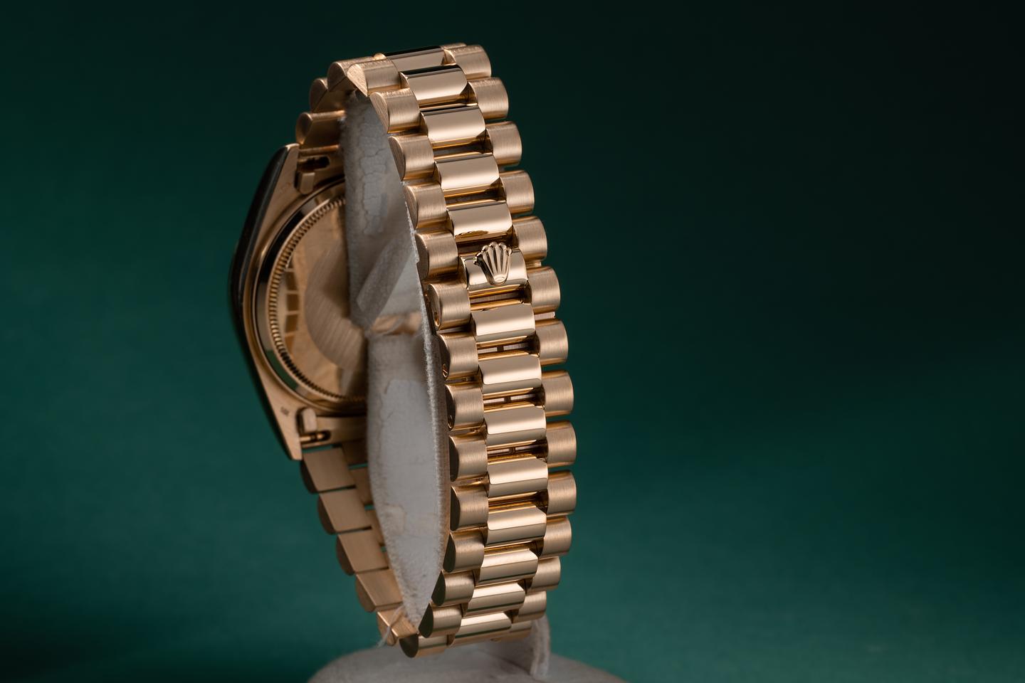 Bracelet: The 22 link 18K yellow gold President bracelet is excellent showing some light stretch for its age. The clasp is stamped with a matching 1988 date code.