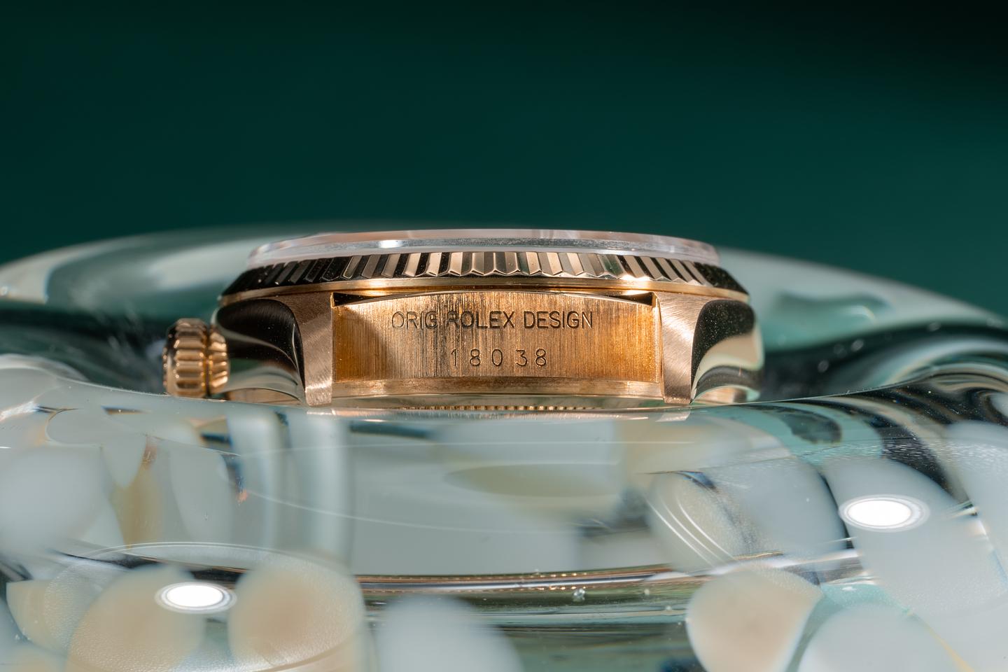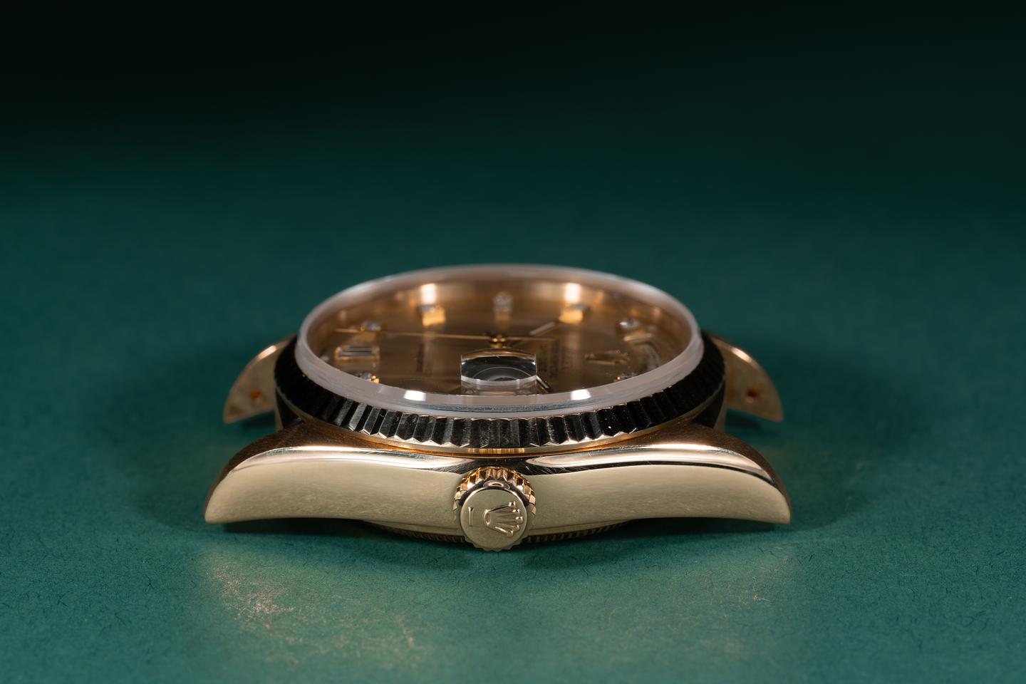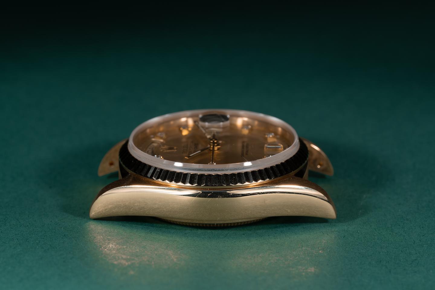 Case: The thick and even 18k yellow gold case is excellent showing only extremely light wear from use. The sharp 18k yellow gold fluted bezel is also in excellent condition showing only very light wear from use.