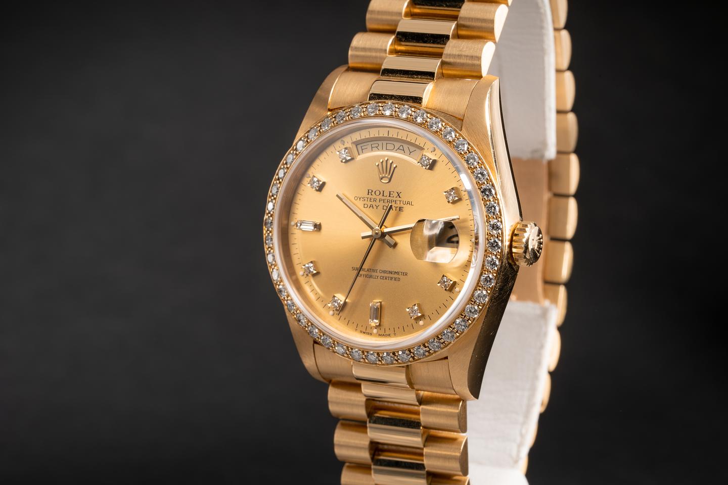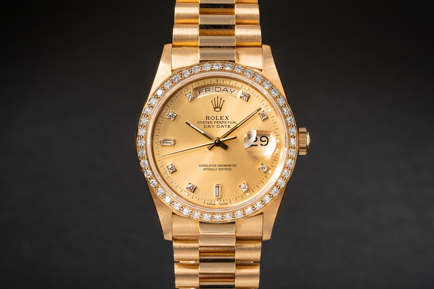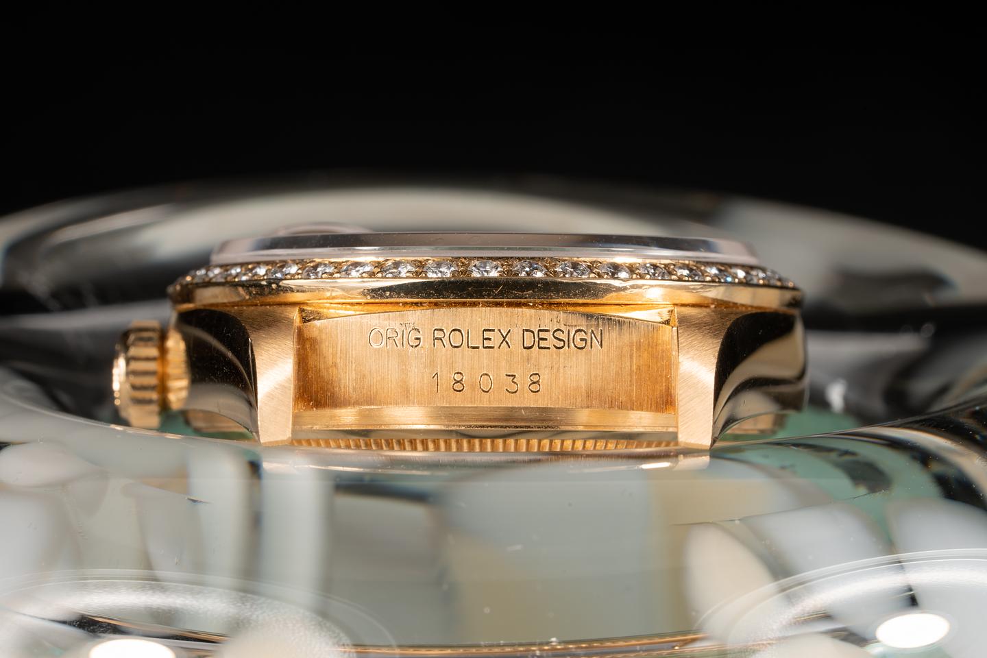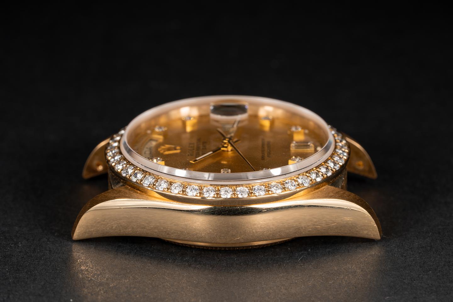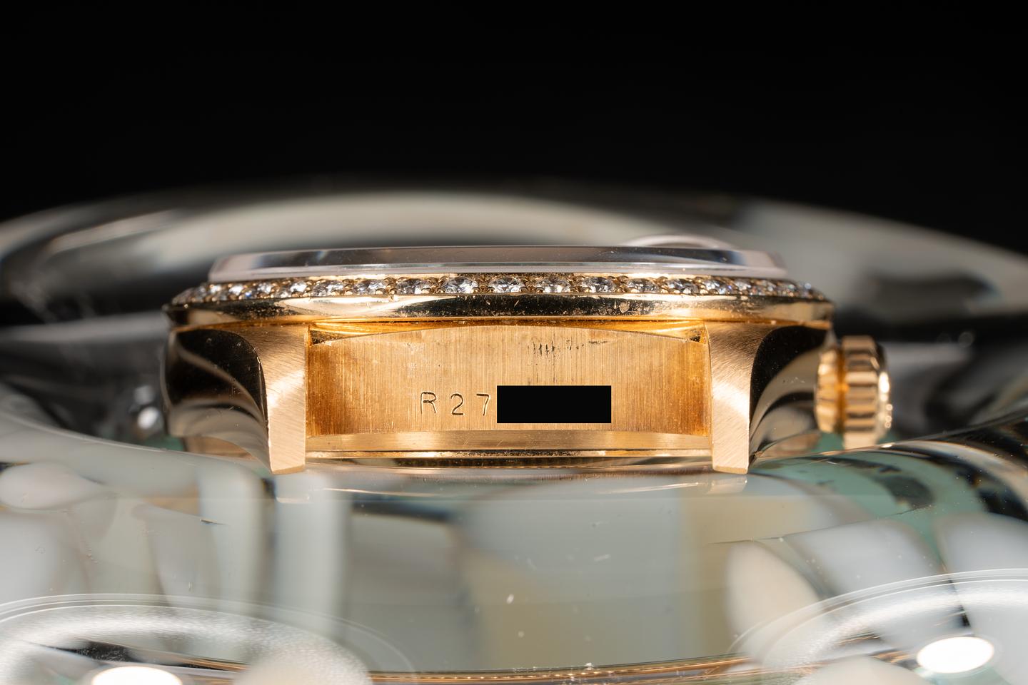 Case: The sharp and even 18k yellow gold case is excellent and shows only very light wear. The factory diamond bezel is also in excellent condition and shows only very light wear. There are 2 very small and subtle deformations in the outer gold rind of the bezel. One is located at the 9 o'clock position and one at the 11 o'clock position.