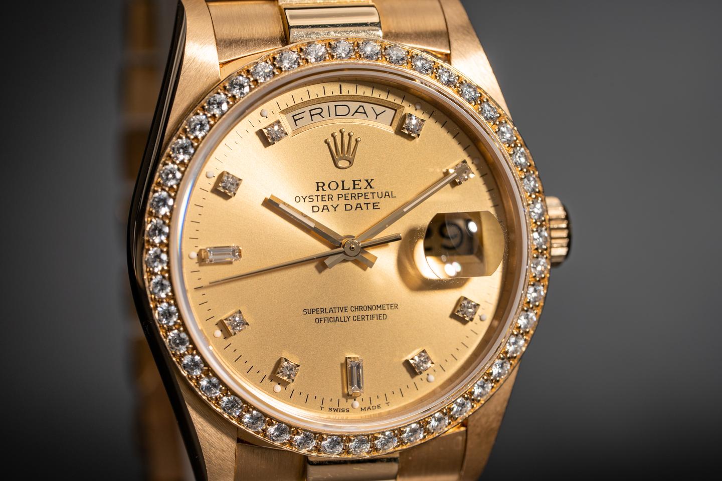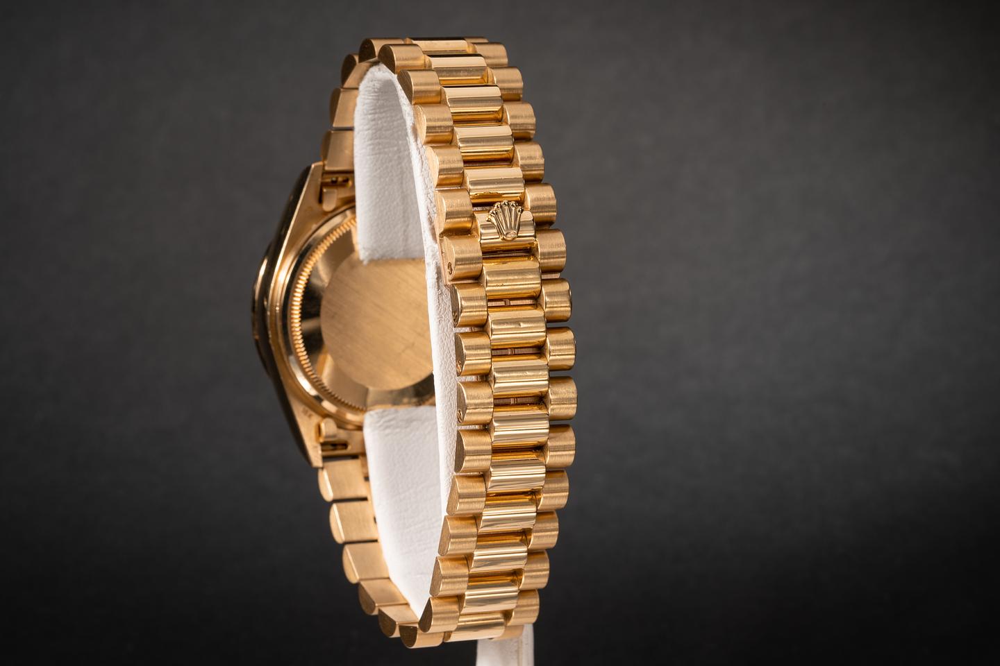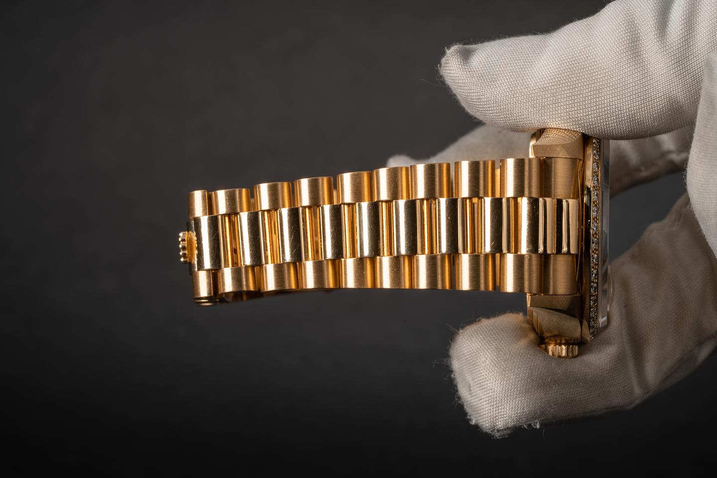 Bracelet: The 24 link 18k yellow gold president bracelet is excellent and shows only light wear for its age.