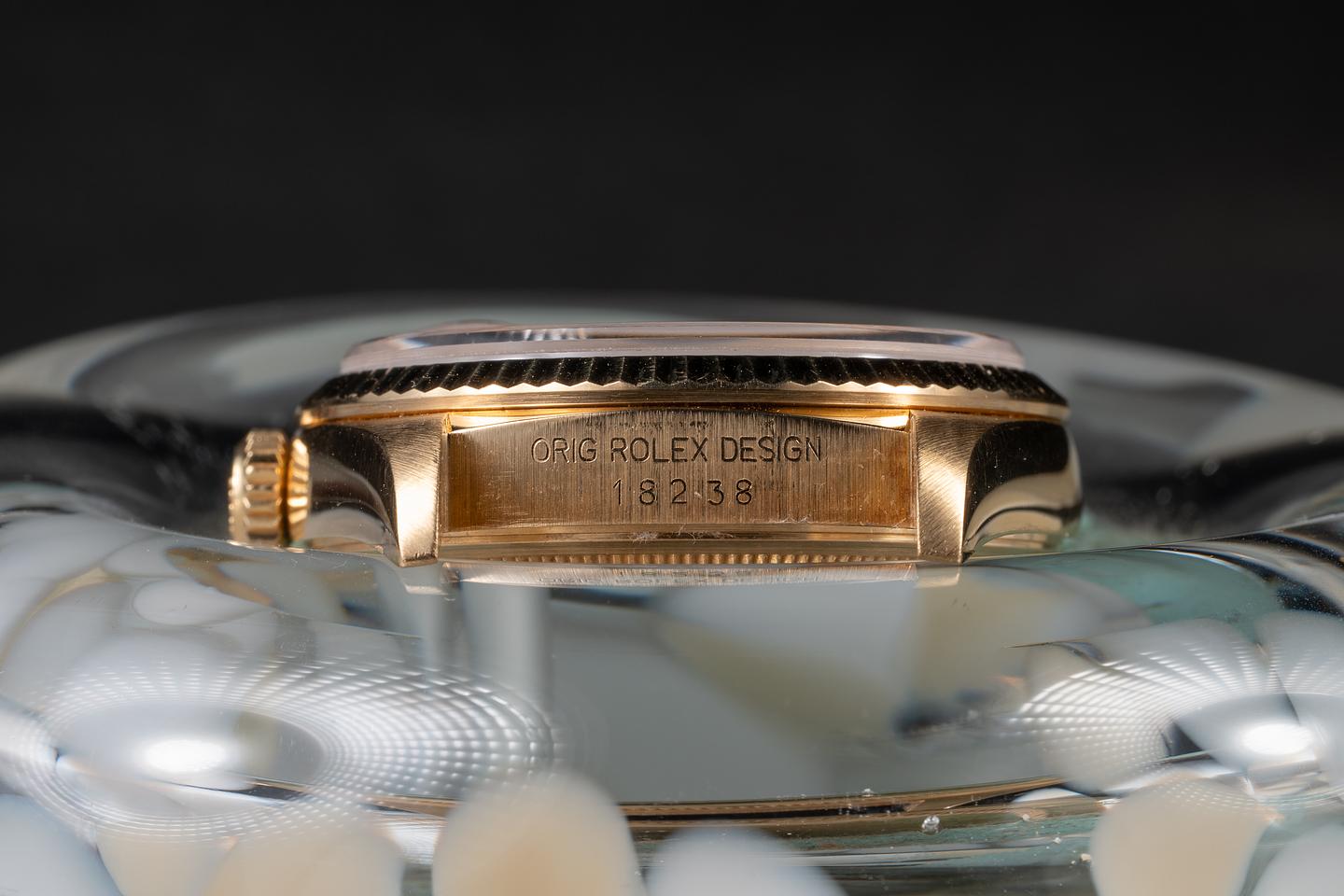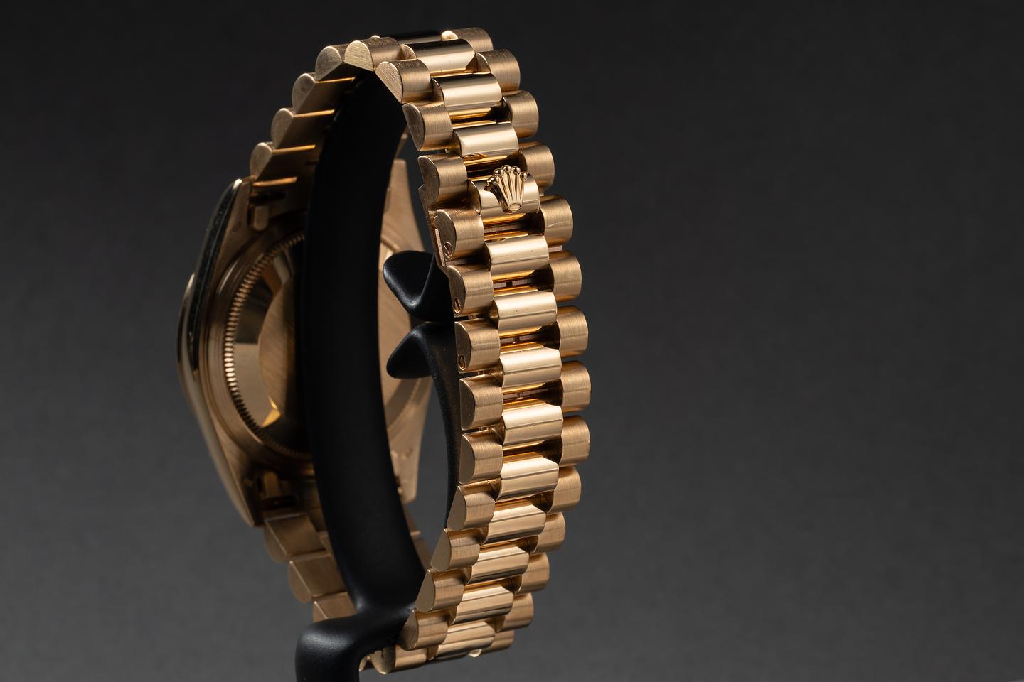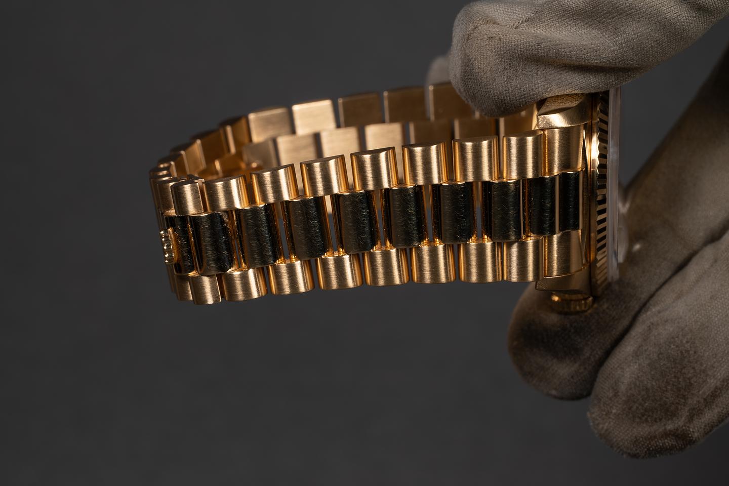 Bracelet: The 22-link 18K yellow gold president bracelet is excellent, showing only very light stretch for its age.