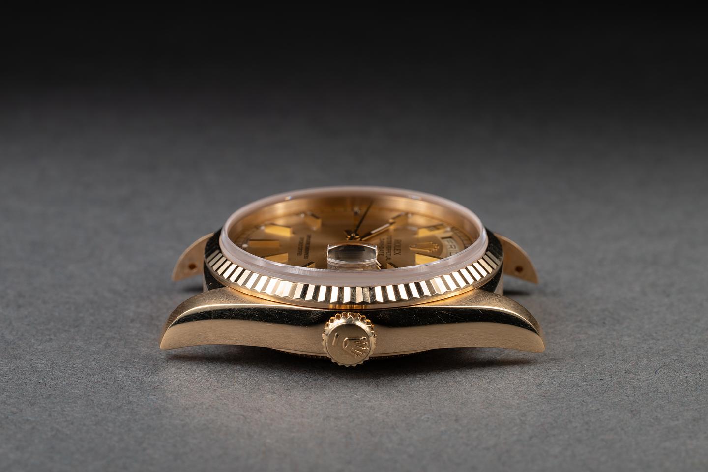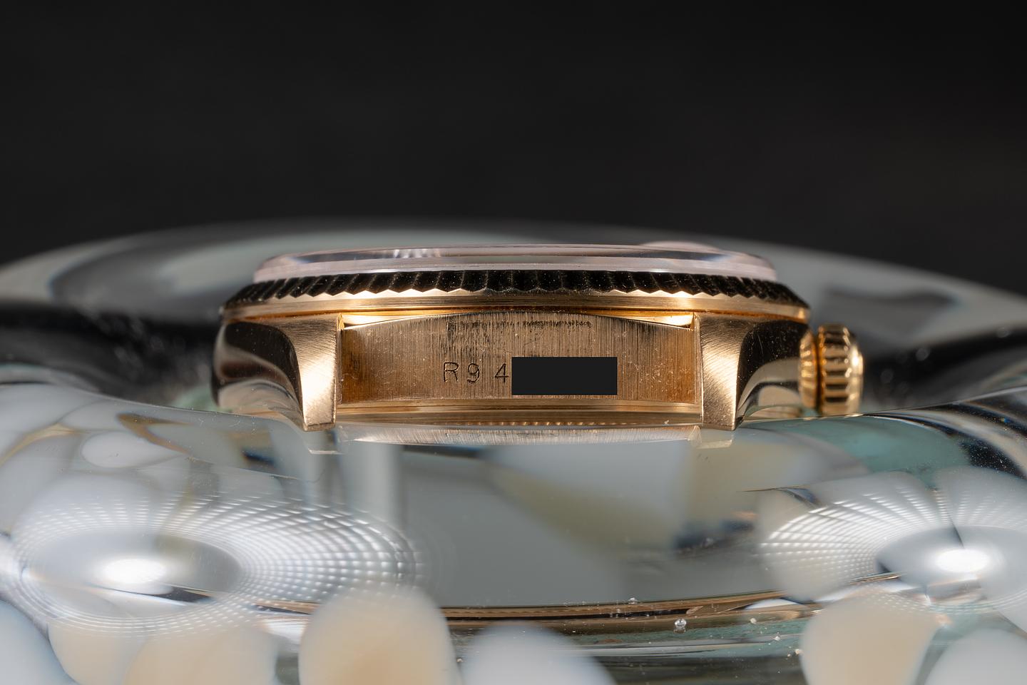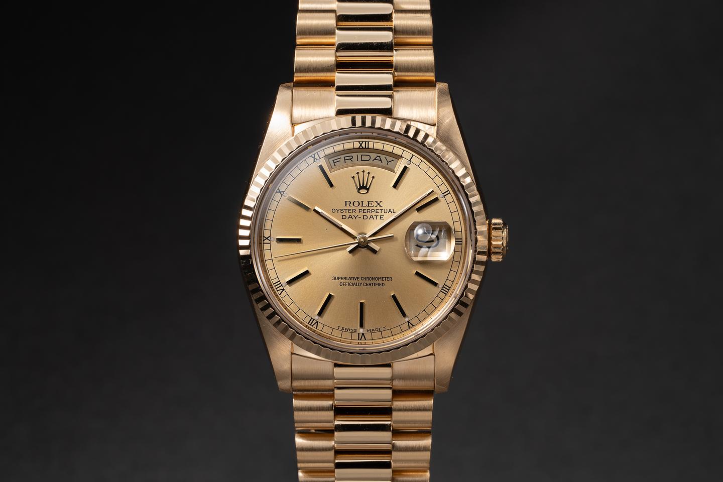 Bracelet: The 22-link 18K yellow gold president bracelet is excellent, showing only very light stretch for its age.
