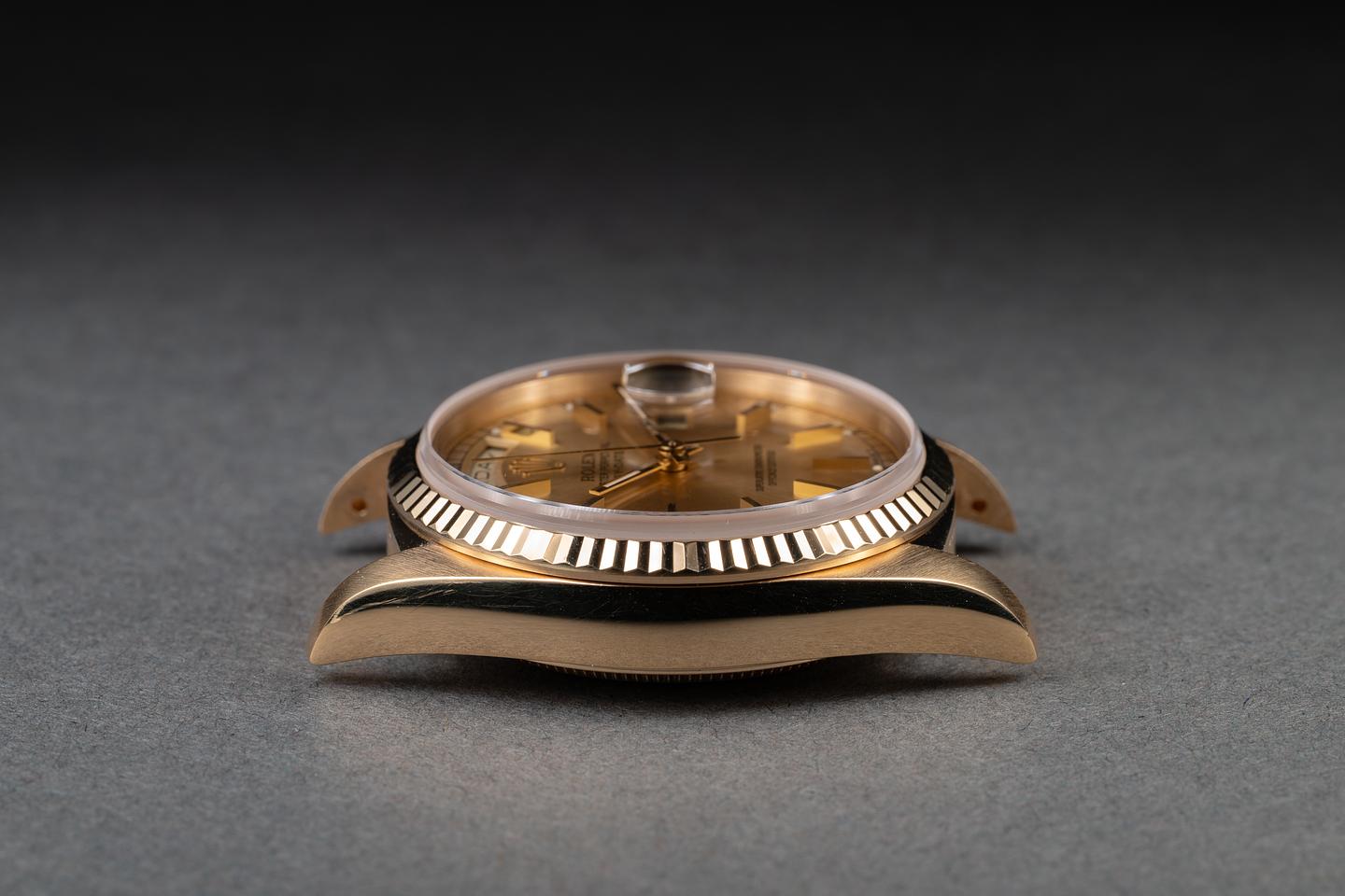 Case: The recently polished 18K yellow gold case is excellent, showing only very light wear from use. The 18K yellow gold fluted bezel is also in excellent condition, showing only very light wear from use.