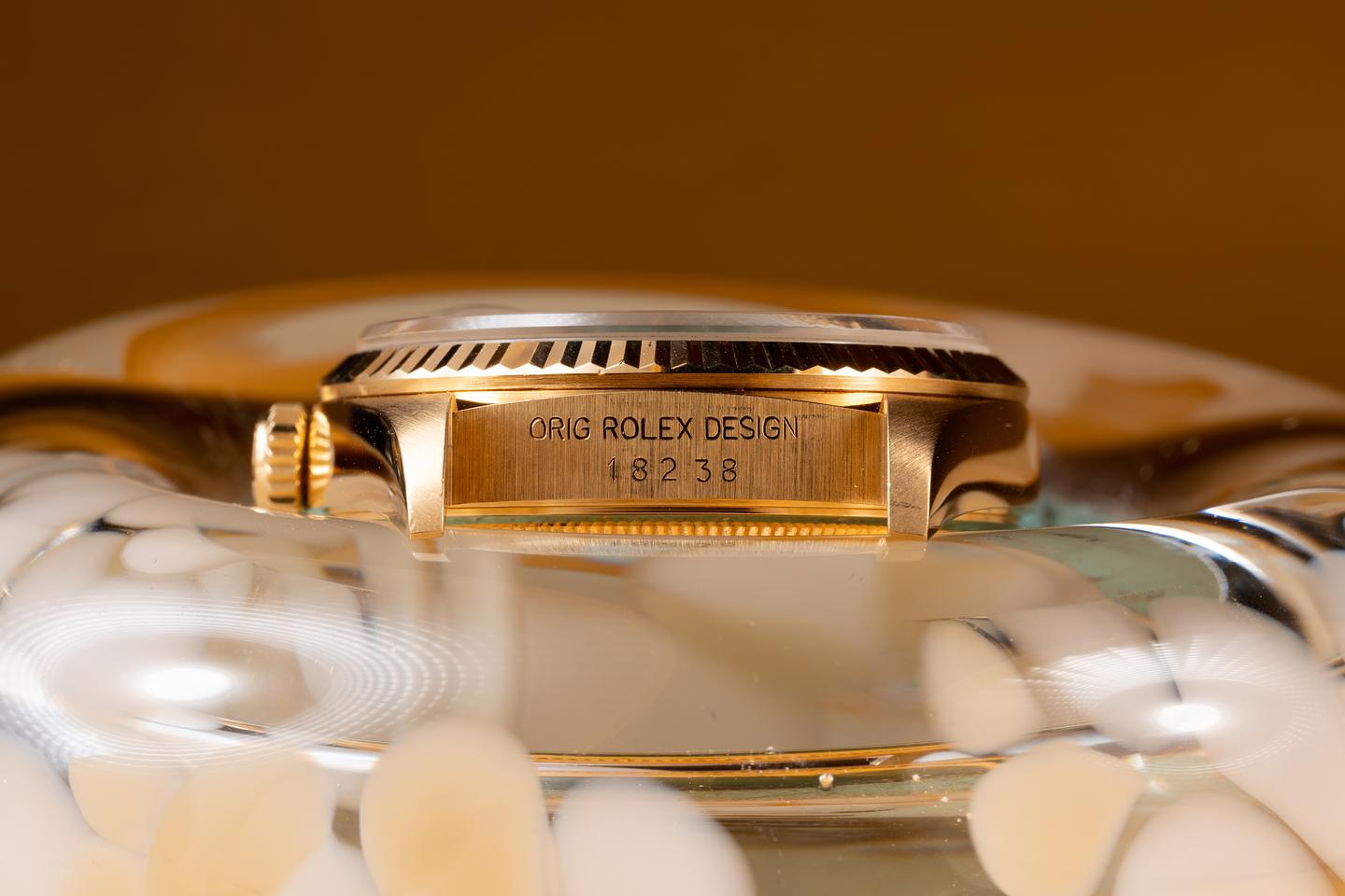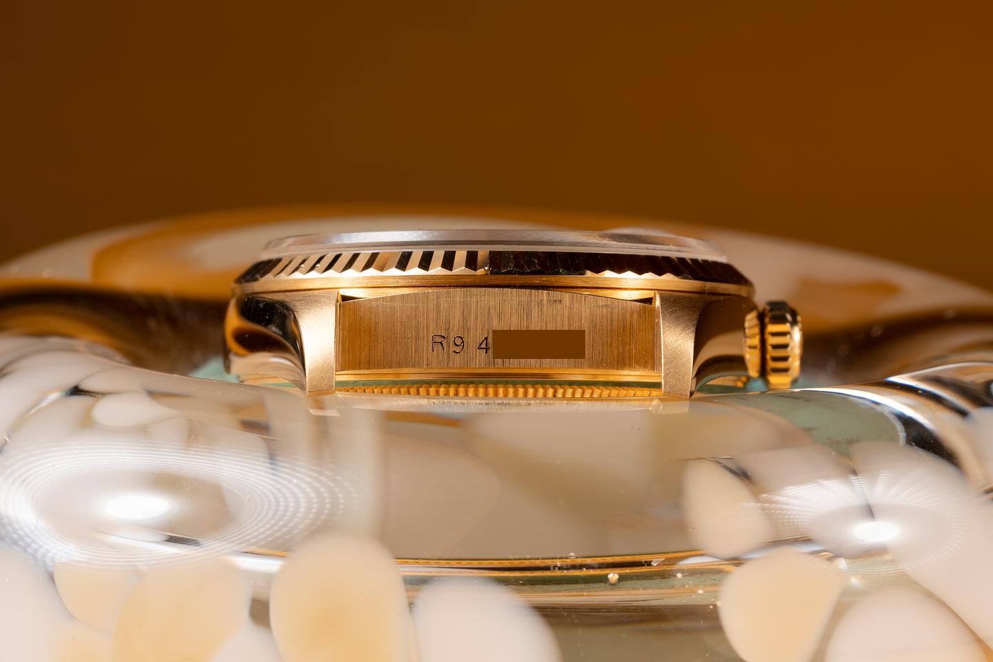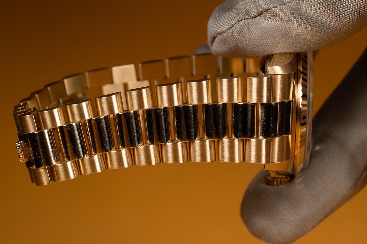 Bracelet: The 23 link 18K yellow gold president bracelet is excellent showing only very light stretch for its age. The clasp is stamped with a matching 1988 date code. The bracelet will fit up to a 17.9 cm. / 7" wrist.