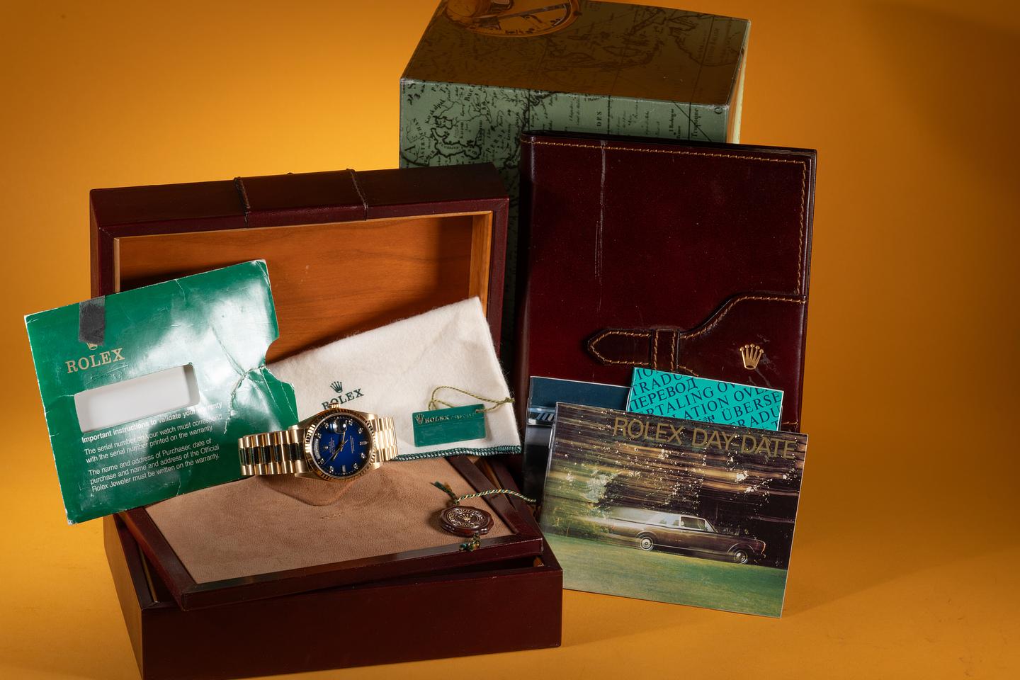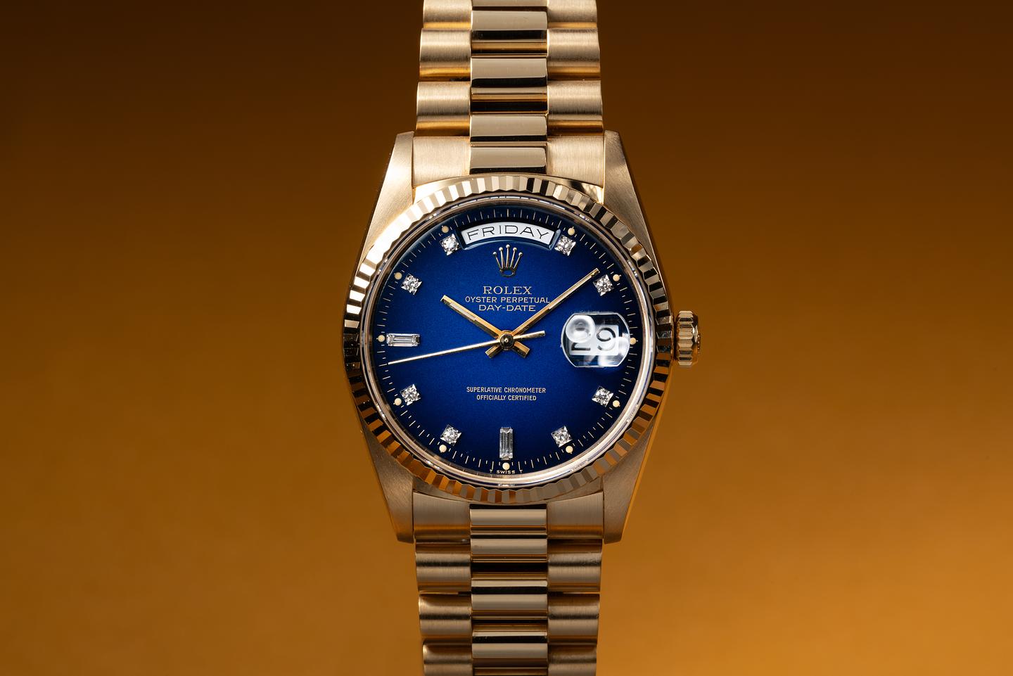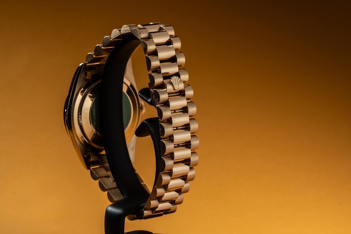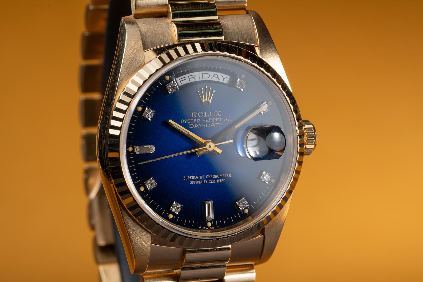 Bracelet: The 23 link 18K yellow gold president bracelet is excellent showing only very light stretch for its age. The clasp is stamped with a matching 1988 date code. The bracelet will fit up to a 17.9 cm. / 7" wrist.