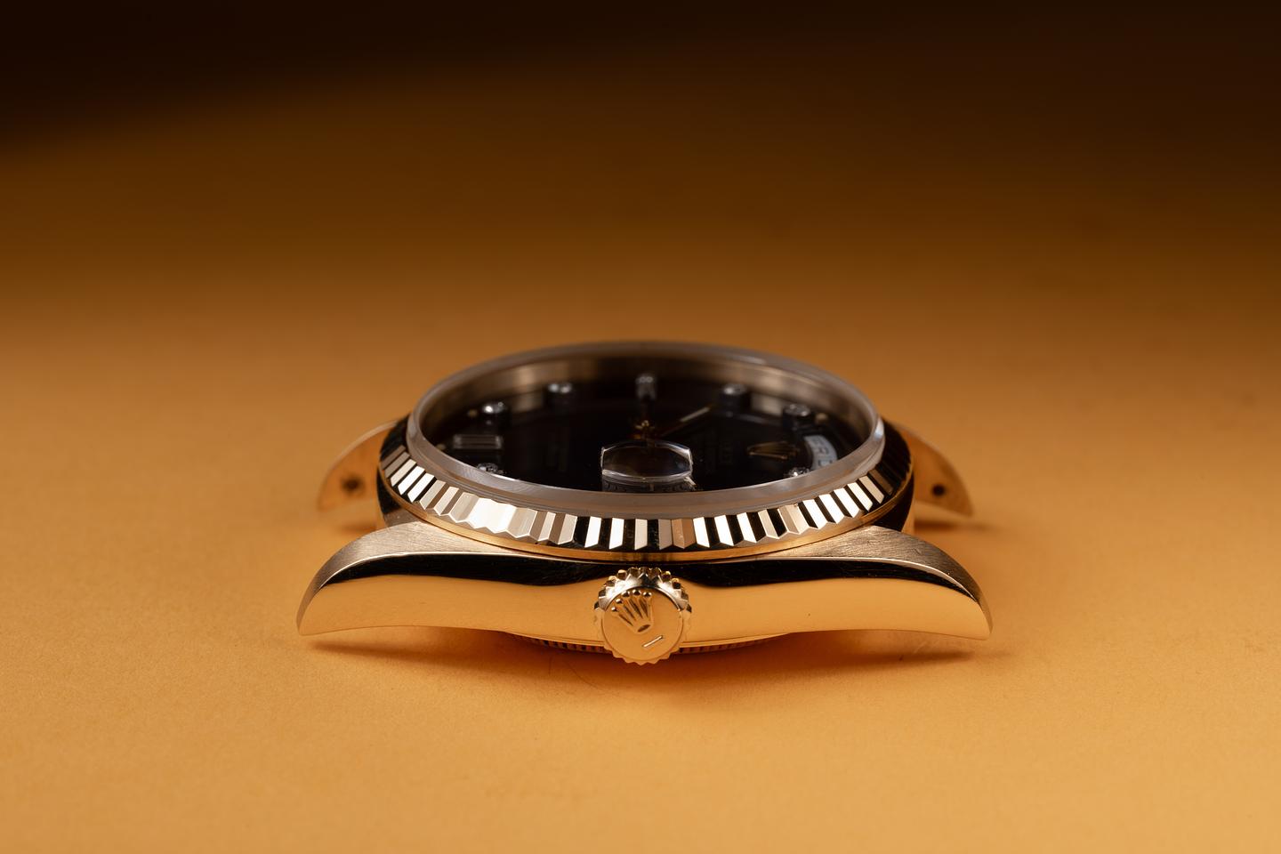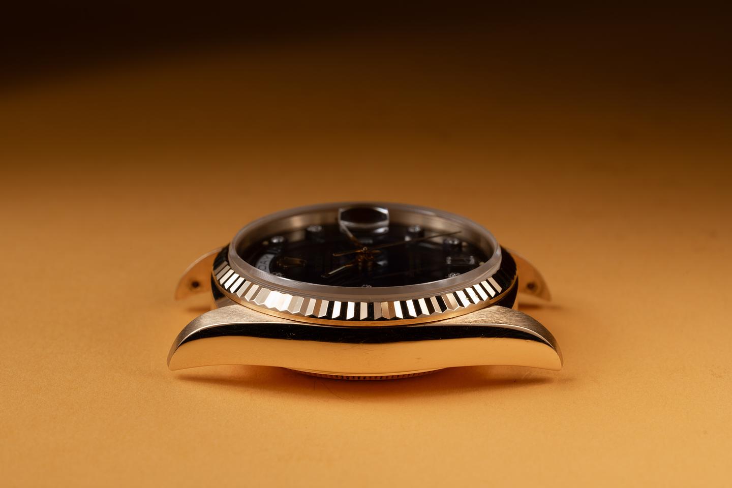 Case: The thick sharp and even 18k yellow gold case is excellent showing only very light wear from use. The sharp 18k yellow gold fluted bezel is also in excellent condition showing only light wear form use.