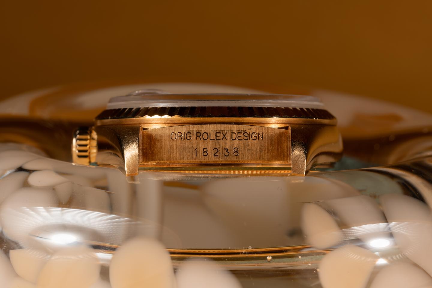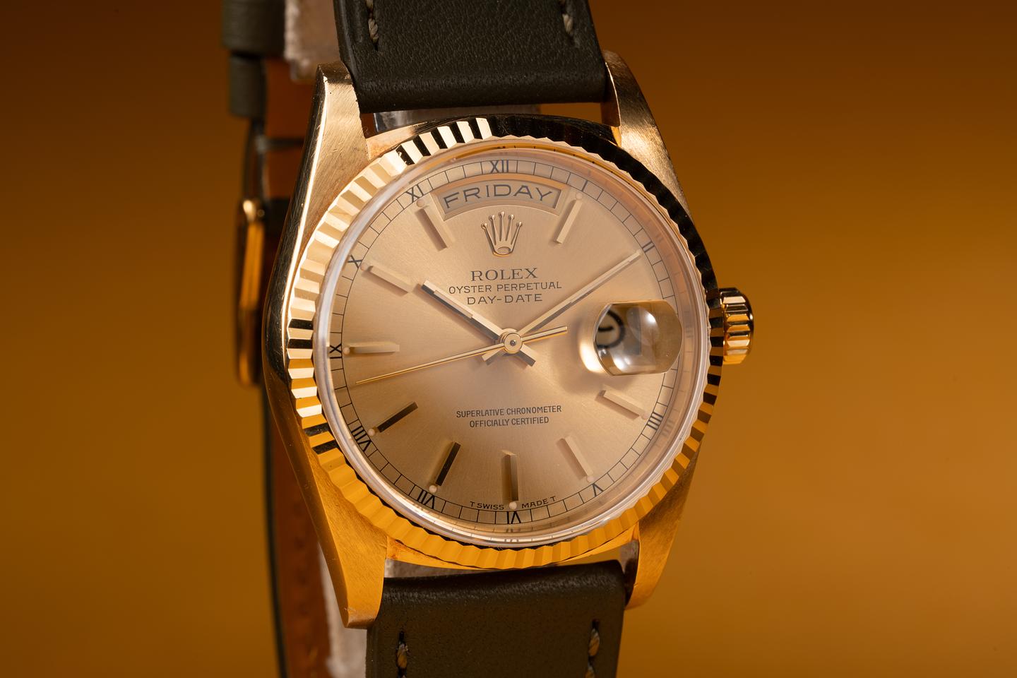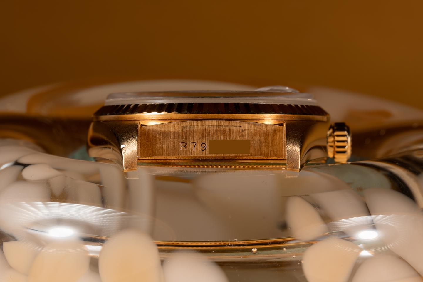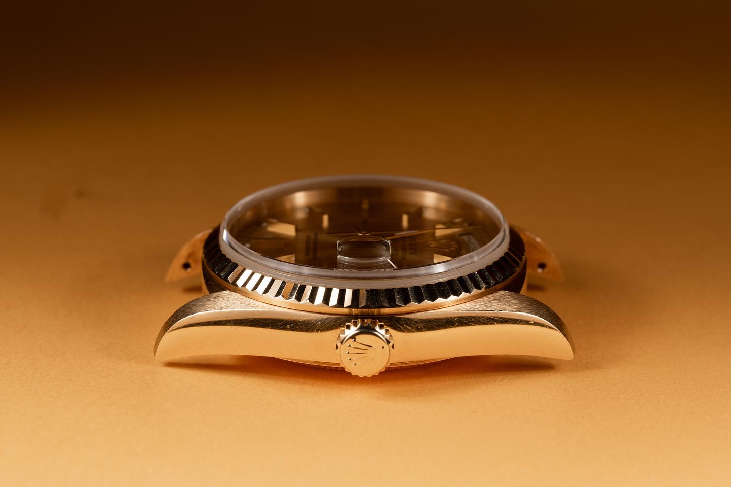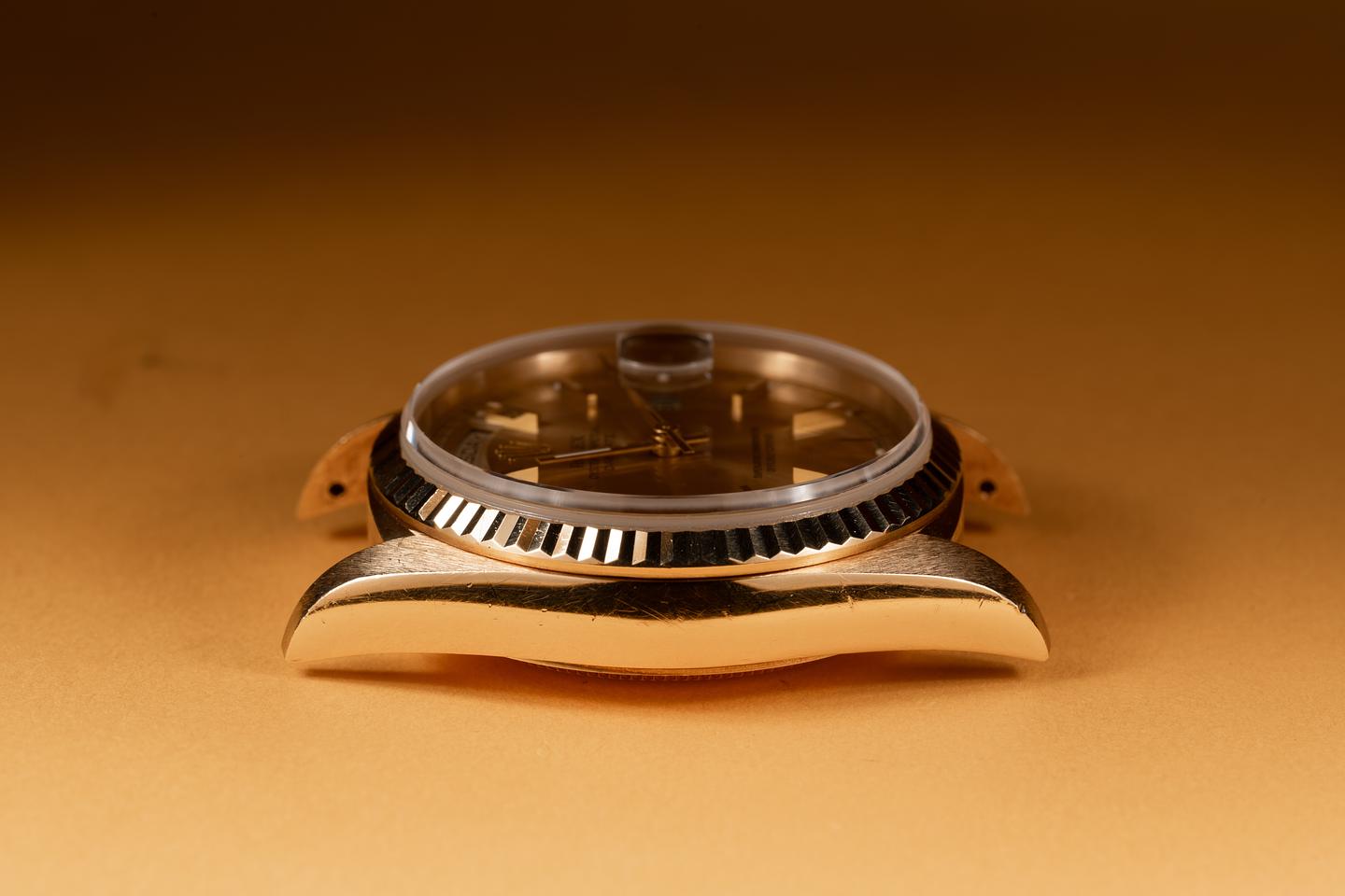 Case: The Sharp 36mm 18k yellow gold case is excellent showing only light wear form use. There sharp 18k yellow gold fluted bezel is also in excellent condition sowing only light wear from use.