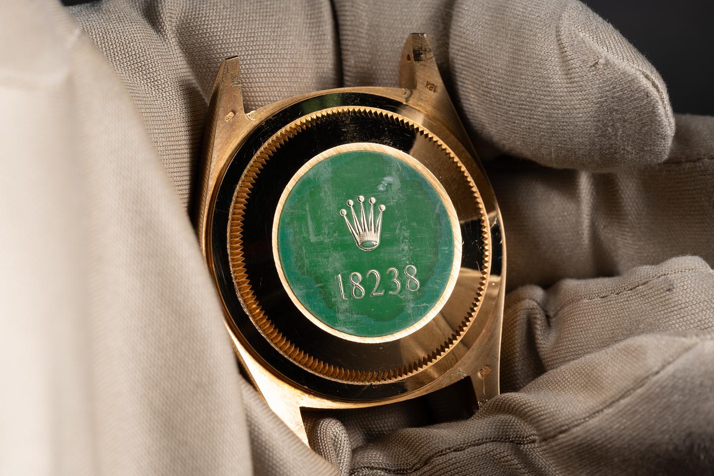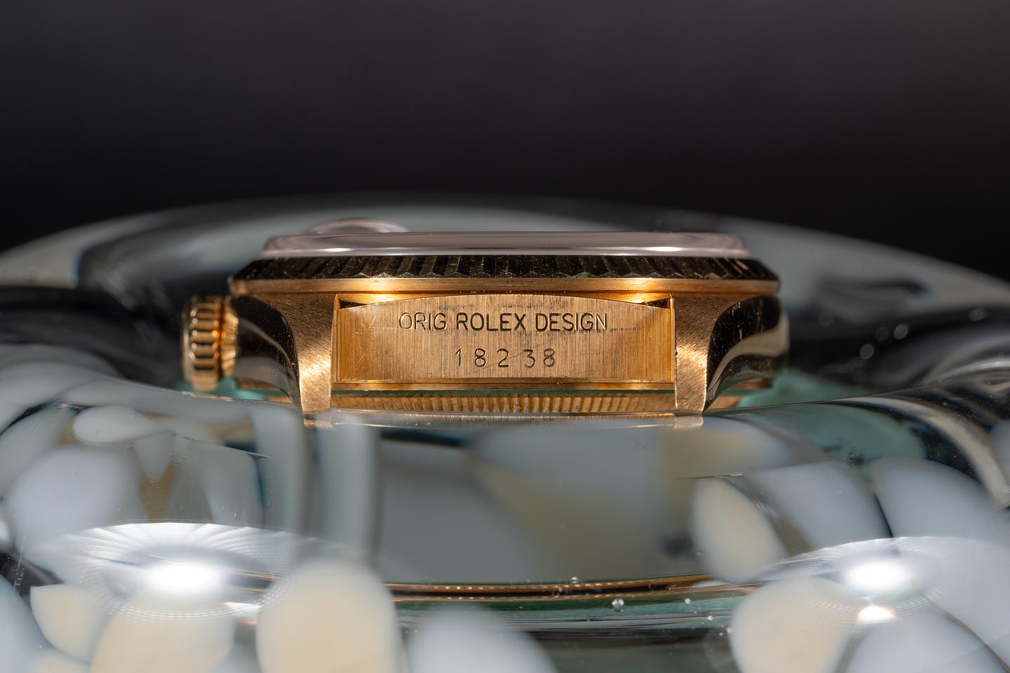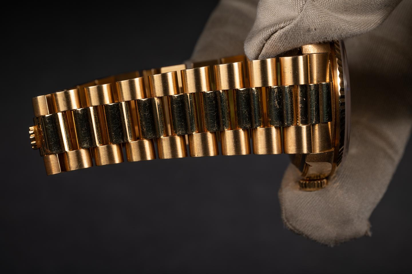 Bracelet: The 23 link 18K yellow gold President bracelet is excellent showing a warm rosy patina that matches the rest of the watch perfectly and only very light stretch for its age. The clasp is stamped with a matching 1988 date code.