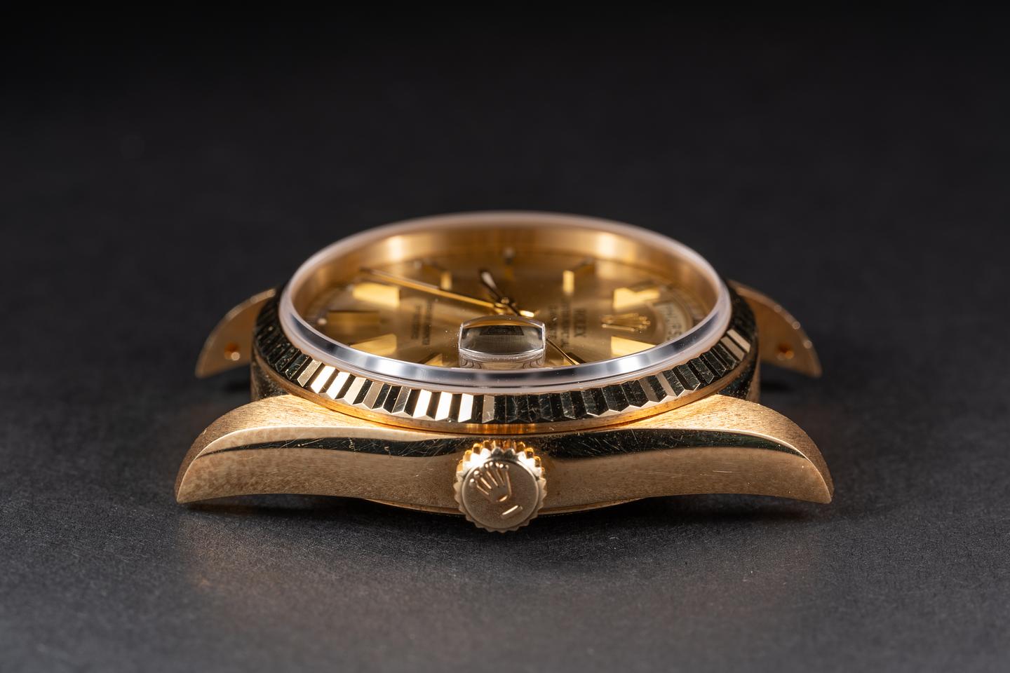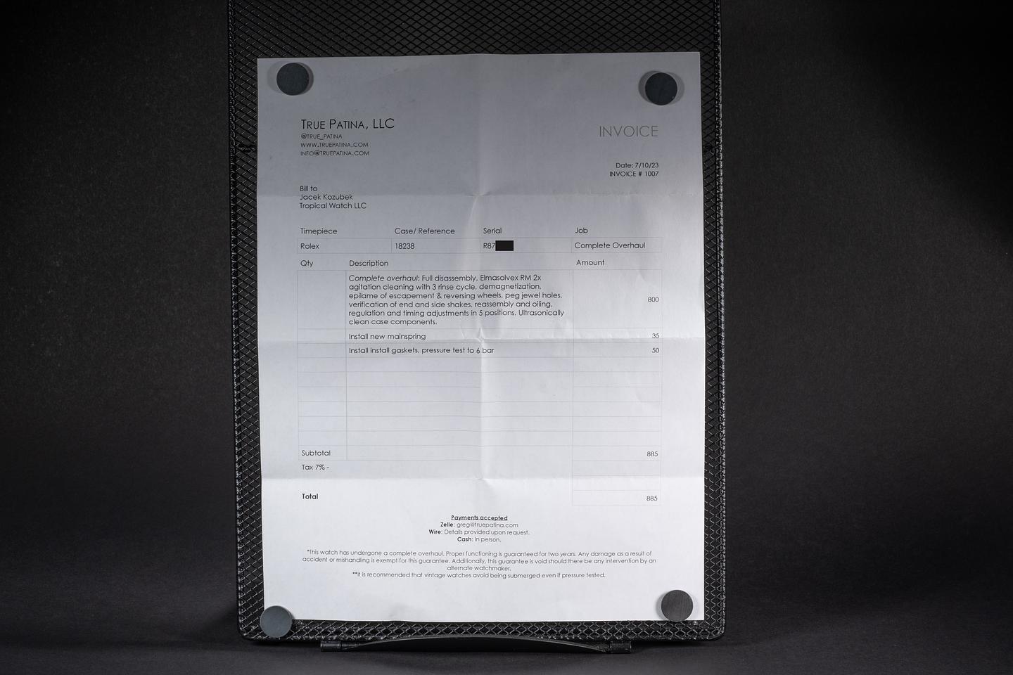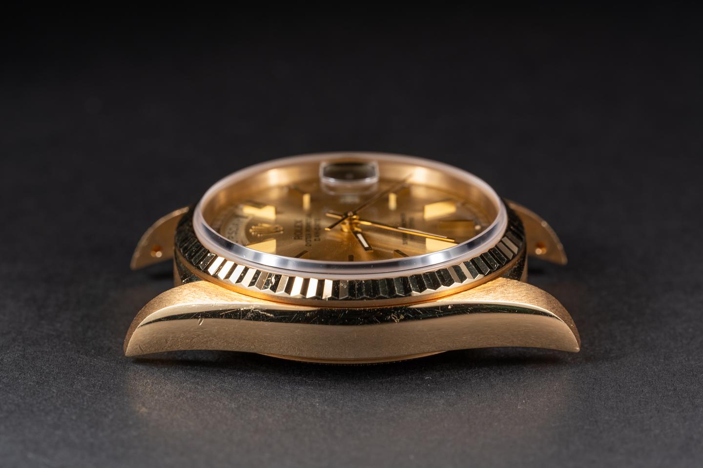 Bracelet: The 23 link 18K yellow gold President bracelet is excellent showing a warm rosy patina that matches the rest of the watch perfectly and only very light stretch for its age. The clasp is stamped with a matching 1988 date code.