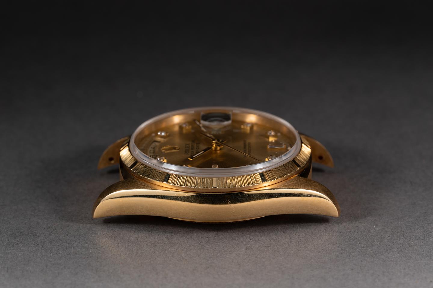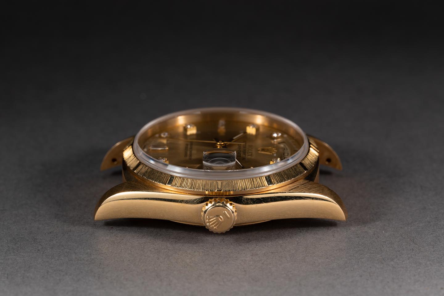 Case: The thick and even 18k yellow gold case is excellent showing only very light wear from use. The sharp 18k yellow gold engine turned bezel is also in excellent condition showing only light wear from use.